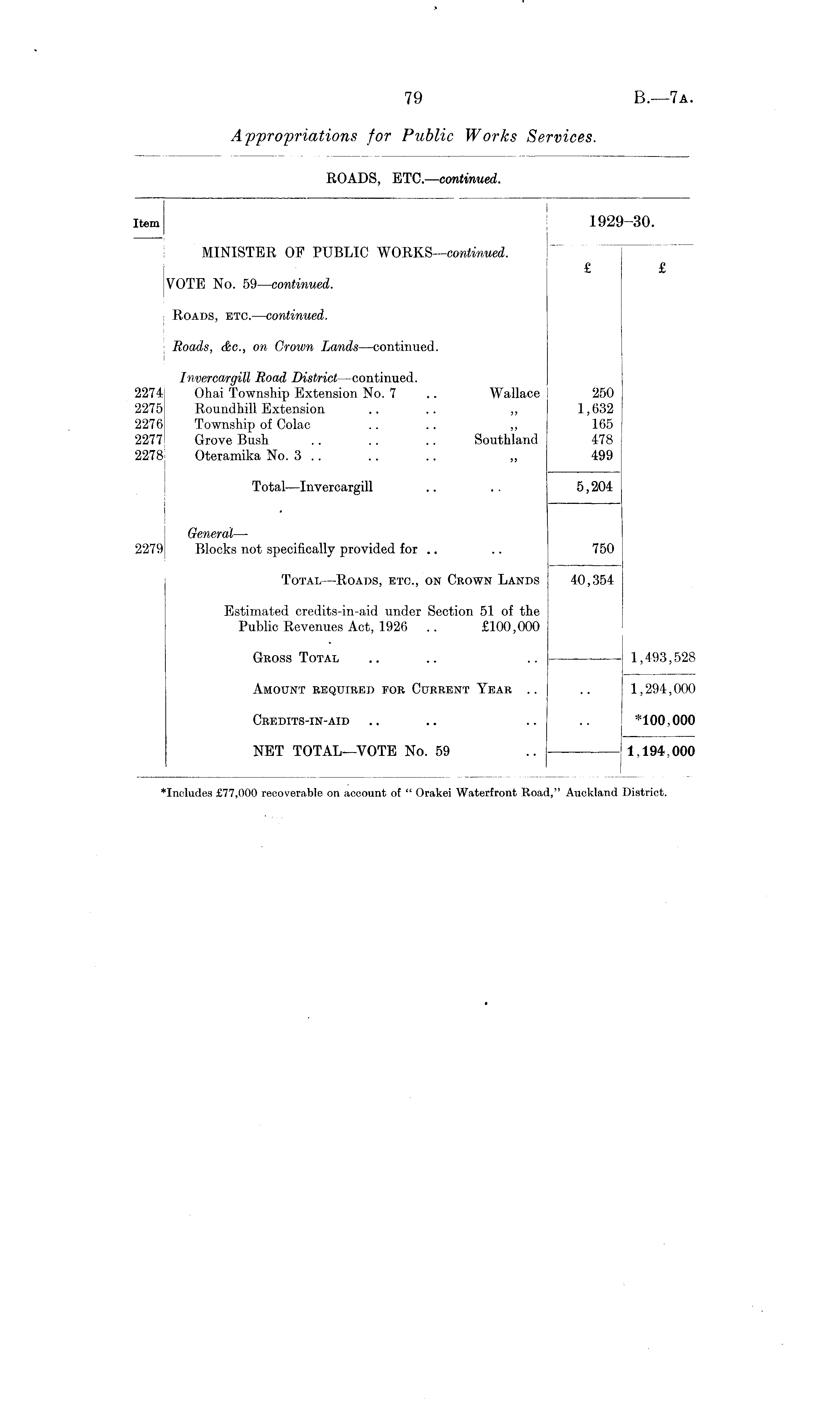 ft Item 1929-30. MINISTER OF PUBLIC WORKS—continued. £ £ VOTE No. 59—continued. Roads, etc. —continued. Roads, &c., on Grown Lands—continued. Invercargill Road District—continued. 2274 Ohai Township Extension No. 7 .. Wallace 250 2275 Roundhill Extension .. .. ,, 1,632 2276 Township of Colac .. .. ,, 165 2277 Grove Bush .. .. .. Southland 478 2278 Oteramika No. 3 .. .. .. ,, 499 Total—Invercargill .. . . 5,204 General — 2279 Blocks not specifically provided for .. .. 750 Total —Roads, etc., on Crown Lands 40,354 Estimated credits-in-aid under Section 51 of the Public Revenues Act, 1926 .. £100,000 Gross Total .. .. .. 1,493,528 Amount required for Current Year .. .. 1,294,000 Credits-in-aid .. .. .. .. *100,000 NET TOTAL—VOTE No. 59 .. 1,194,000 *Includes £77,000 recoverable on account of " Orakei Waterfront Road," Auckland District.