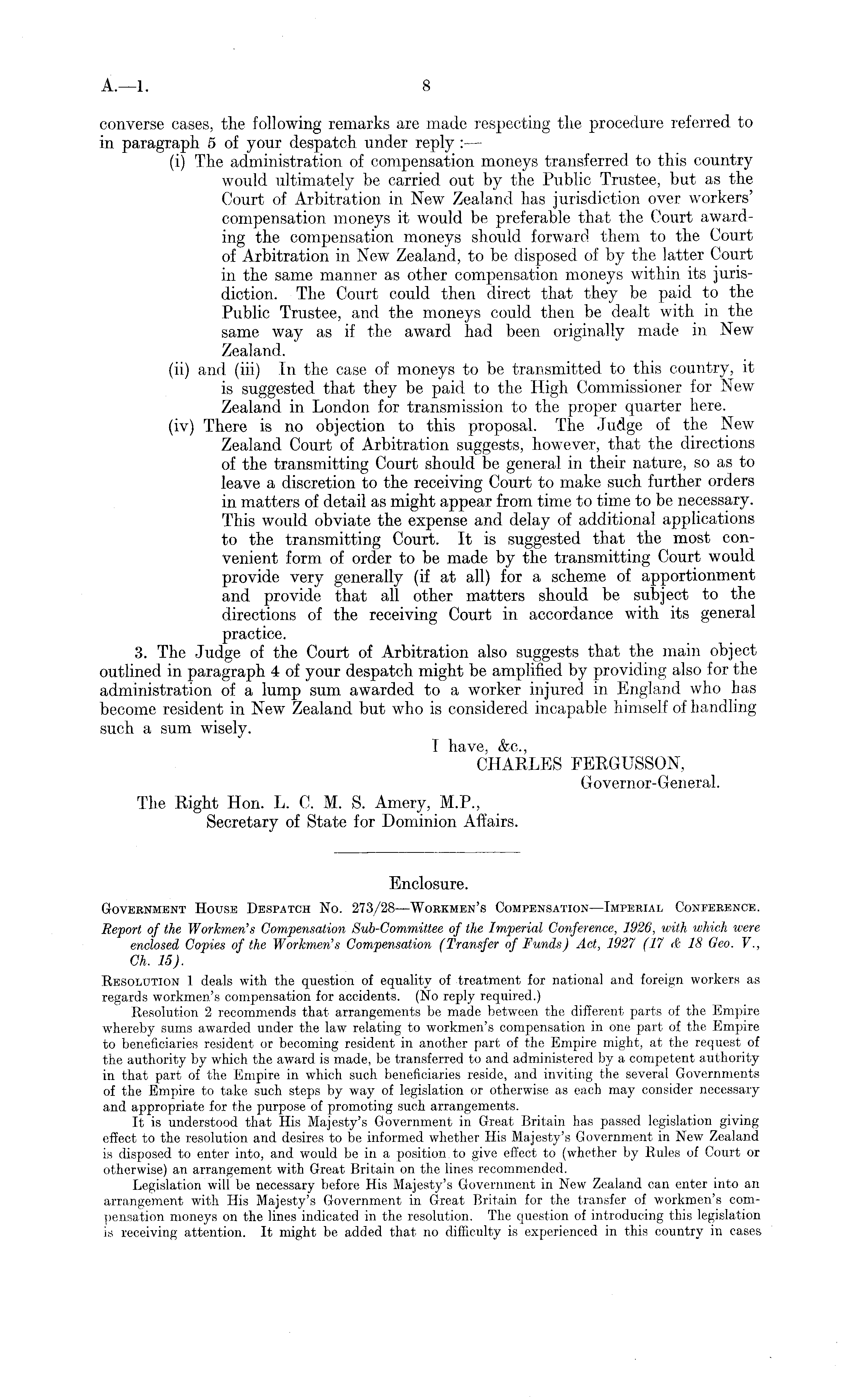 Enclosure. Government House Despatch No. 273/28—Workmen's Compensation—lmperial Conference. Report of the Workmen's Compensation Sub-Committee of the Imperial Conference, 1926, with which were enclosed Copies of the Workmen's Compensation (Transfer of Funds) Act, 1927 (17 & 18 Geo. V., Ch. 15). Resolution 1 deals with the question of equality of treatment for national and foreign workers as regards workmen's compensation for accidents. (No reply required.) Resolution 2 recommends that arrangements be made between the different parts of the Empire whereby sums awarded under the law relating to workmen's compensation in one part of the Empire to beneficiaries resident or becoming resident in another part of the Empire might, at the request of the authority by which the award is made, be transferred to and administered by a competent authority in that part of the Empire in which such beneficiaries reside, and inviting the several Governments of the Empire to take such steps by way of legislation or otherwise as each may consider necessary and appropriate for the purpose of promoting such arrangements. It is understood that His Majesty's Government in Great Britain has passed legislation giving effect to the resolution and desires to be informed whether His Majesty's Government in New Zealand is disposed to enter into, and would be in a position to give effect to (whether by Rules of Court or otherwise) an arrangement with Great Britain on the lines recommended. Legislation will be necessary before His Majesty's Government in New Zealand can enter into an arrangement with His Majesty's Government in Great Britain for the transfer of workmen's compensation moneys on the lines indicated in the resolution. The question of introducing this legislation is receiving attention. It might be added that no difficulty is experienced in this country in cases
