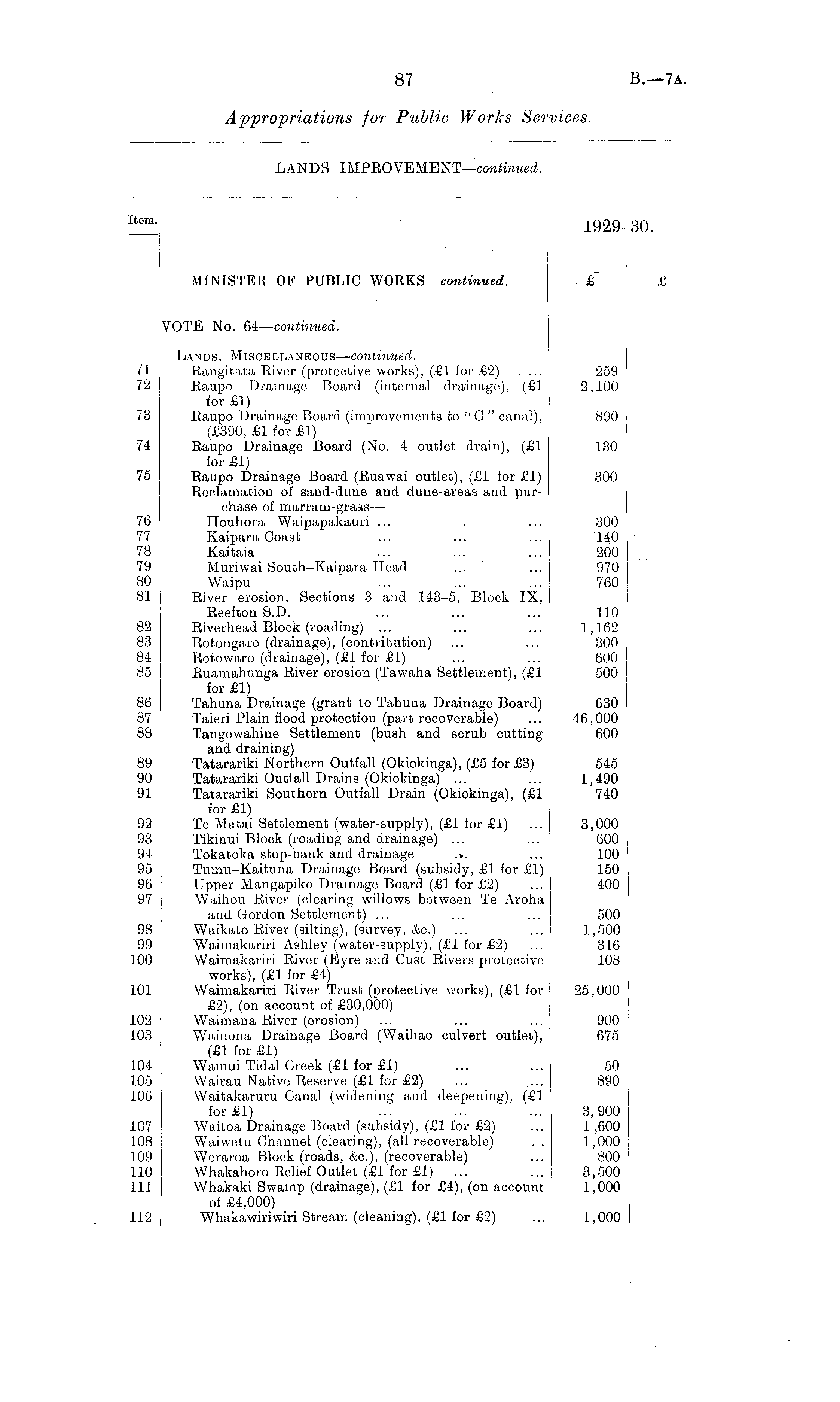 Item - 1929-30. MINISTER OF PUBLIC WORKS—continued. £ £ VOTE No. 64 —continued. Lands, Miscellaneous—continued. 71 Rangitata River (protective works), (£1 for £2) ... 259 72 Raupo Drainage Board (internal drainage), (£1 2,100 for £1) 73 Raupo Drainage Board (improvements to "G" canal), 890 (£390, £1 for £1) 74 Raupo Drainage Board (No. 4 outlet drain), (£1 130 for £1) 75 Raupo Drainage Board (Ruawai outlet), (£1 for £1) 300 Reclamation of sand-dune and dune-areas and purchase of marram-grass— 76 Houhora-Waipapakauri ... . ... 300 77 Kaipara Coast ... ... ... 140 78 Kaitaia ... ... ... 200 79 Muriwai South-Kaipara Head ... ... 970 80 Waipu ... ... ... 760 81 River erosion, Sections 3 and 143-5, Block IX, Reefton S.D. ... ... ... 110 82 Riverhead Block (roading) ... ... ... 1,162 83 Rotongaro (drainage), (contribution) ... ... I 300 84 Rotowaro (drainage), (£1 for £1) ... ... 1 600 85 Ruamahunga River erosion (Tawaha Settlement), (£1 500 for £1) 86 Tahuna Drainage (grant to Tahuna Drainage Board) 630 87 Taieri Plain flood protection (part recoverable) ... 46,000 88 Tangowahine Settlement (bush and scrub cutting 600 and draining) 89 Tatarariki Northern Outfall (Okiokinga), (£5 for £3) 545 90 Tatarariki Outfall Drains (Okiokinga) ... ... 1,490 91 Tatarariki Southern Outfall Drain (Okiokinga), (£1 740 for £1) 92 Te Matai Settlement (water-supply), (£1 for £1) ... 3,000 93 Tikinui Block (roading and drainage) ... ... 600 94 Tokatoka stop-bank and drainage ... 100 95 Tumu-Kaituna Drainage Board (subsidy, £1 for £1) 150 96 Upper Mangapiko Drainage Board (£1 for £2) ... 400 97 Waihou River (clearing willows between Te Aroha and Gordon Settlement) ... ... ... 500 98 Waikato River (silting), (survey, &c.) ... ... 1,500 99 Waimakariri-Ashley (water-supply), (£1 for £2) ... 316 100 Waimakariri River (Eyre and Oust Rivers protective 108 works), (£1 for £4) 101 Waimakariri River Trust (protective works), (£1 for 25,000 £2), (on account of £30,000) 102 Waim an a River (erosion) ... ... ... 900 103 Wainona Drainage Board (Waihao culvert outlet), 675 (£1 for £1) 104 Wainui Tidal Creek (£1 for £1) ... ... 50 105 Wairau Native Reserve (£1 for £2) ... ... 890 106 Waitakaruru Canal (widening and deepening), (£1 for £1) ... ... ... 3,900 107 Waitoa Drainage Board (subsidy), (£1 for £2) ... 1,600 108 Waiwetu Channel (clearing), (all recoverable) .. 1,000 109 Weraroa Block (roads, &c.), (recoverable) ... 800 110 Whakahoro Relief Outlet (£1 for £1) ... ... 3,500 111 Whakaki Swamp (drainage), (£1 for £4), (on account 1,000 of £4,000) 112 j Whakawiriwiri Stream (cleaning), (£1 for £2) ... 1,000