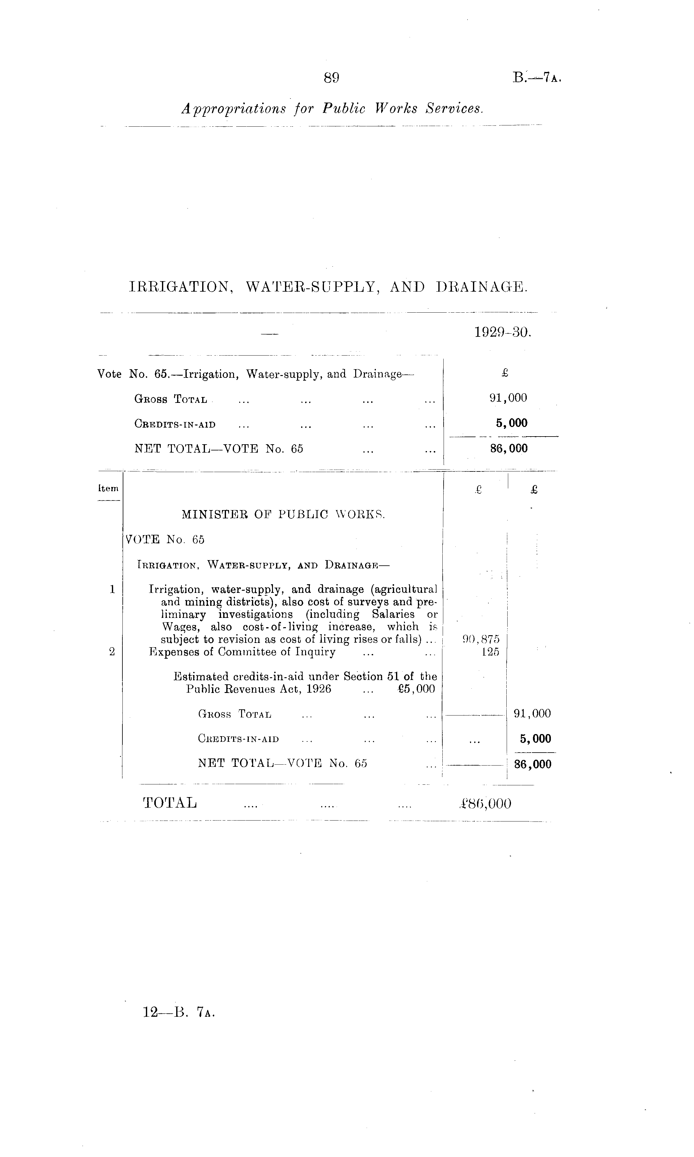 — 1929-30. Vote No. 65.—Irrigation, Water-supply, and Drainage— £ GROSS Total ... ... ... ... 91,000 Credits-in-aid ... ... ... ... 5,000 NET TOTAL—VOTE No. 65 ... ... 86,000 Item £ I £ MINISTER OP PUBLIC WORKS. VOTE No. 65 Irrigation, Water-supply, and Drainage— 1 Irrigation, water-supply, and drainage (agricultural and mining districts), also cost of surveys and preliminary investigations (including Salaries or Wages, also cost-of-living increase, which is subject to revision as cost of living rises or falls) ... 90,875 2 Expenses of Committee of Inquiry ... ... 125 Estimated credits-in-aid under Section 51 of the Public Revenues Act, 1926 ... €5,000 Gross Total ... ... ... 91,000 Credits-in-aid ... ... ... ... 5,000 NET TOTAL—VOTE No. 65 ... 86,000 TOTAL .... .... .... £86,000