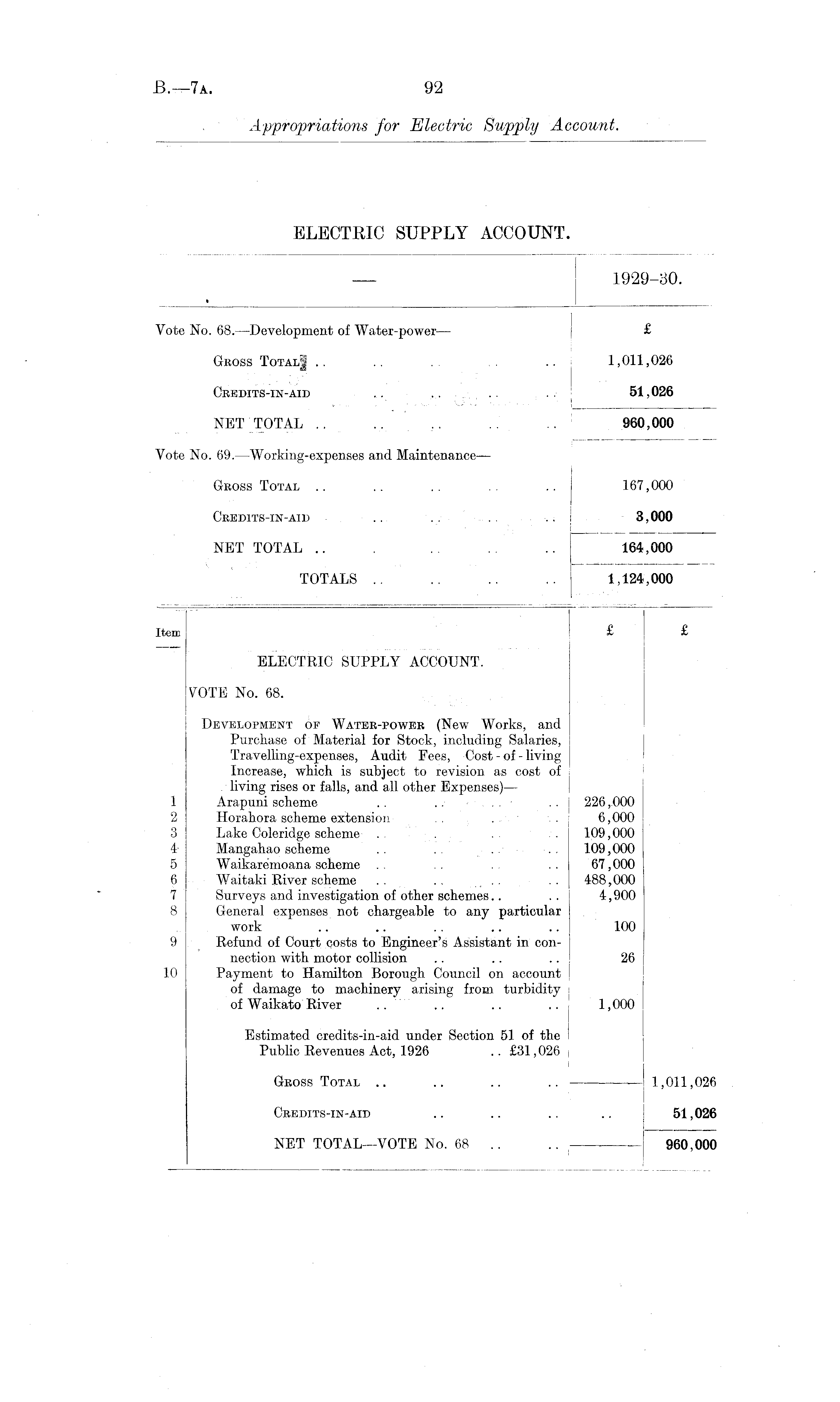 — 1929-30. Vote No. 68.—Development of Water-power— ! £ Gross Total§ .. .. .. 1,011,026 Credits-in-aid .. ..'I 51,026 NET TOTAL .. .. .. 960,000 Vote No. 69.—Working-expenses and Maintenance— Gross Total .. .. .. .. 167,000 Credits-in-aid .. 3,000 NET TOTAL .. .. 164,000 TOTALS .. .. .. .. 1,124,000 Item £ £ ELECTRIC SUPPLY ACCOUNT. VOTE No. 68. Development of Water-power (New Works, and Purchase of Material for Stock, including Salaries, Travelling-expenses, Audit Fees, Cost-of-living Increase, which is subject to revision as cost of living rises or falls, and all other Expenses)— 1 Arapuni scheme . . .. . . 226, 000 2 Horahora scheme extension .. . 6,000 3 Lake Coleridge scheme . . 109,000 4- Mangahao scheme . . . . . . 109,000 5 Waikaremoana scheme .. .. 67,000 6 Waitaki River scheme . , . . . , 488,000 7 Surveys and investigation of other schemes.. . . 4,900 8 General expenses not chargeable to any particular work .. .. . . .. .. 100 9 Refund of Court costs to Engineer's Assistant in connection with motor collision .. .. .. 26 10 Payment to Hamilton Borough Council on account of damage to machinery arising from turbidity of Waikato River .. .. .. .. 1,000 Estimated credits-in-aid under Section 51 of the Public Revenues Act, 1926 .. £31,026 GROSS Total .. .. .. .. — 1,011,026 Credits-in-aid .. .. .. .. 51,026 NET TOTAL—VOTE No. 68 .. .. 960,000