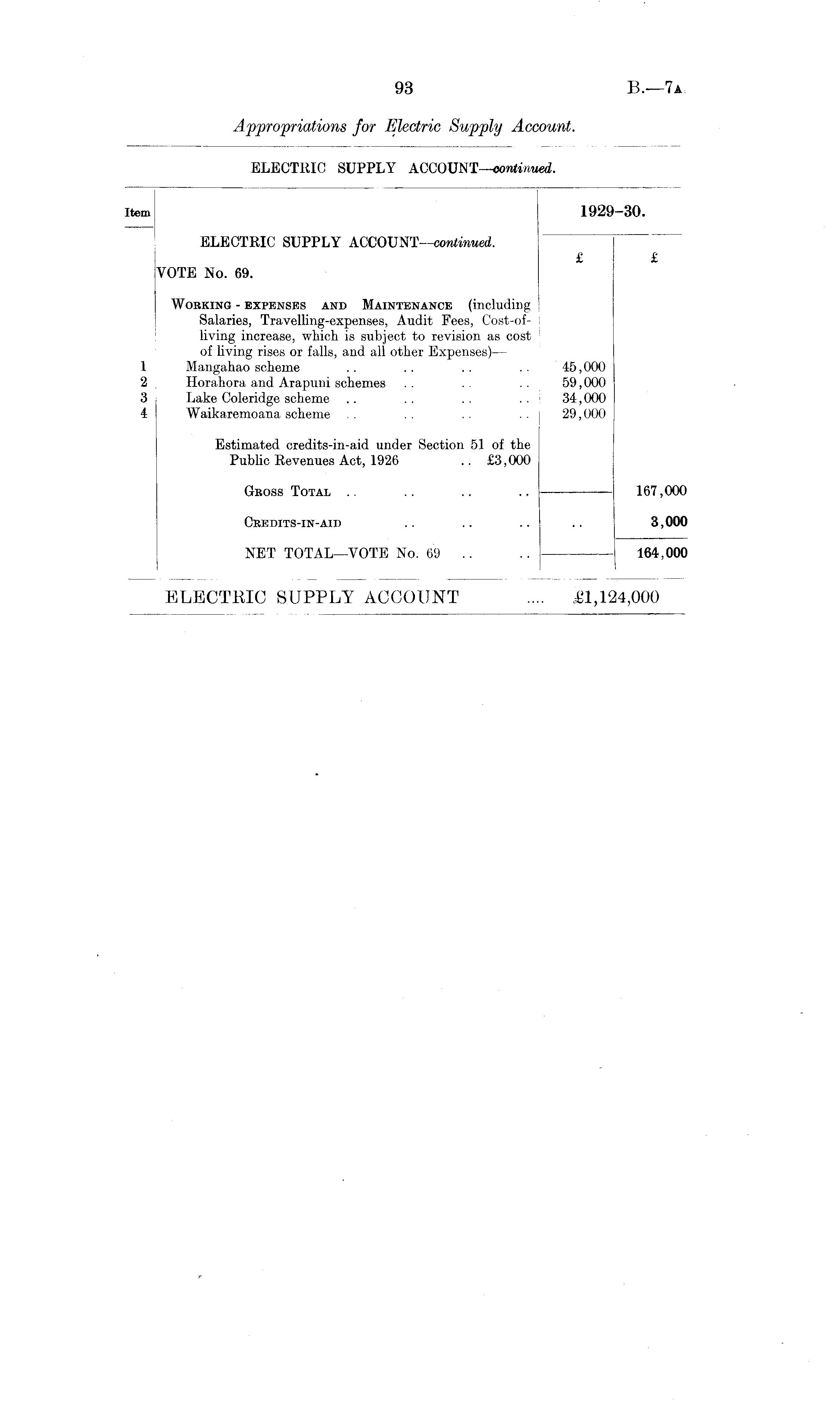 Item 1929-30. ELECTRIC SUPPLY ACCOUNT —continued. £ £ VOTE No. 69. Working - expenses and Maintenance (including Salaries, Travelling-expenses, Audit Fees, Cost-of-living increase, which is subject to revision as cost of living rises or falls, and all other Expenses) — 1 Mangahao scheme .. . . . . . . 45,000 2 Horahora and Arapuni schemes . . . . 59,000 3 Lake Coleridge scheme .. . . . . . . 34,000 4 Waikaremoana scheme . . . . . . 29,000 Estimated credits-in-aid under Section 51 of the Public Revenues Act, 1926 .. £3,000 GROSS Total .. .. .. ——— 167,000 Credits-in-aid .. .. .. .. 3,000 NET TOTAL—VOTE No. 69 .. .. 164,000 ELECTRIC SUPPLY ACCOUNT .... £1,124,000