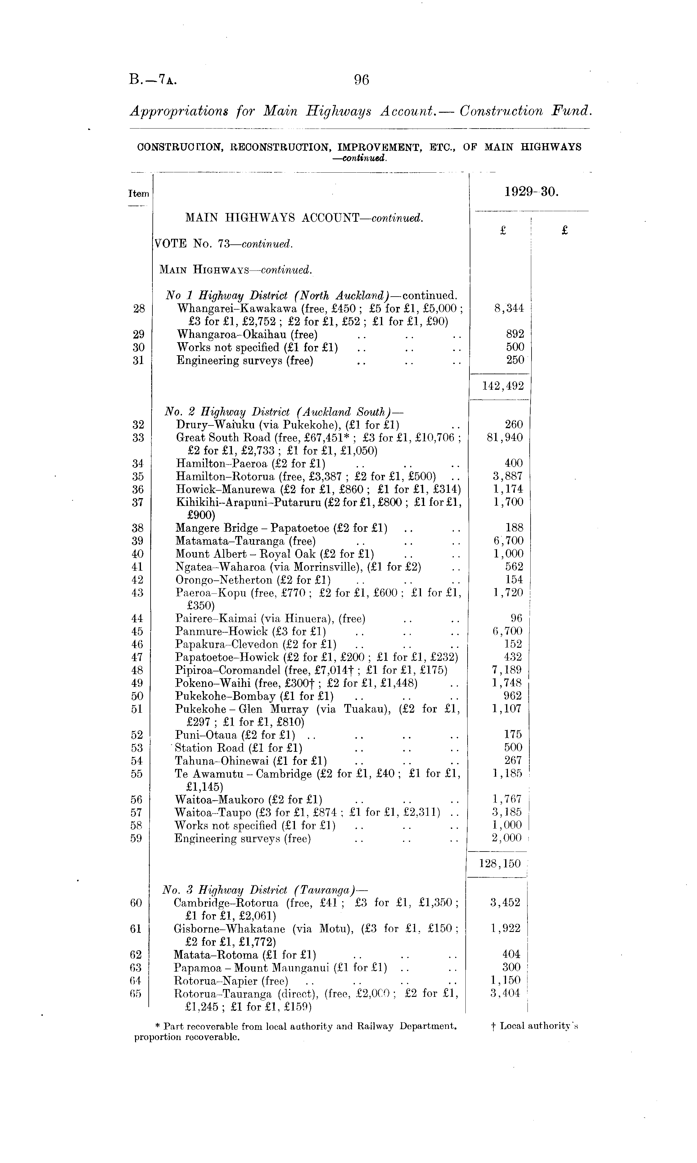 Item 1929~30. MAIN HIGHWAYS ACCOUNT —continued. 7 £ £ VOTE No. 73 —continued. Main Highways—continued. No 1 Highway District (North Auckland) —continued. 28 Whangarei-Kawakawa (free, £450 ; £5 for £1, £5,000 ; 8,344 £3 for £1, £2,752 ; £2 for £1, £52 ; £1 for £1, £90) 29 Whangaroa-Okaihau (free) .. .. . . 892 30 Works not specified (£1 for £1) .. .. .. 500 31 Engineering surveys (free) .. .. .. 250 142,492 No. 2 Highway District (Auckland South) — 32 Drury-Waitiku (via Pukekohe), (£1 for £1) .. 260 33 Great South Road (free, £67,451* ; £3 for £1, £10,706 ; 81,940 £2 for £1, £2,733 ; £1 for £1, £1,050) 34 Hamilton-Paeroa (£2 for £1) . . .. .. 400 35 Hamilton-Rotorua (free, £3,387 ; £2 for £1, £500) .. 3,887 36 Howick-Manurewa (£2 for £1, £860 ; £1 for £1, £314) 1,174 37 Kihikihi-Arapuni-Putaruru (£2 for £1, £800 ; £lfor£l, 1,700 £900) 38 Mangere Bridge - Papatoetoe (£2 for £1) .. .. 188 39 Matamata-Tauranga (free) .. .. .. 6 ,700 40 Mount Albert - Royal Oak (£2 for £1) . . . . 1,000 41 Ngatea-Waharoa (via Morrinsville), (£1 for £2) .. 562 42 Orongo-Netherton (£2 for £1) .. .. .. 154 43 Paeroa-Kopu (free, £770 ; £2 for £1, £600 : £1 for £1, 1,720 £350) 44 Pairere-Kaimai (via Hinuera), (free) .. .. 96 45 Panmure-Howick (£3 for £1) .. .. .. 6,700 46 Papakura-Clevedon (£2 for £1) .. . . .. 152 47 Papatoetoe-Howick (£2 for £1, £200 ; £1 for £1, £232) 432 48 Pipiroa-Coromandel (free, £7,014f ; £1 for £1, £175) 7,189 49 Pokeno-Waihi (free, £300f ; £2 for £1, £1,448) .. 1,748 50 Pukekohe-Bombay (£1 for £1) .. .. . . 962 51 Pukekohe - Glen Murray (via Tuakau), (£2 for £1, 1,107 £297 ; £1 for £1, £810) 52 Puni-Otaua (£2 for £1) . . .. .. .. 175 53 ' Station Road (£1 for £1) .. .. .. 500 54 Tahuna-Ohinewai (£1 for £1) .. .. .. 267 55 Te Awamutu - Cambridge (£2 for £1, £40 ; £1 for £1, 1,185 £1,145) 56 Waitoa-Maukoro (£2 for £1) .. .. .. 1,767 57 Waitoa-Taupo (£3 for £1, £874 ; £1 for £1, £2,311) .. 3,185 58 Works not specified (£1 for £1) .. .. .. 1,000 59 Engineering surveys (free) .. .. .. 2,000 128,150 [ No. 3 Highway District (Tauranga) — 60 Cambridge-Rotorua (free, £41; £3 for £1, £1,350; 3,452 £1 for £1, £2,061) 61 Gisborne-Whakatane (via Motu), (£3 for £1, £150; 1,922 £2 for £1, £1,772) 62 Matata-Rotoma (£1 for £1) .. .. .. 404 63 Papamoa - Mount Maunganui (£1 for £1) .. .. 300 64 Rotorua-Napier (free) .. .. .. 1,150 65 Rotorua-Tauranga (direct), (free, £2,0C0 ; £2 for £1, 3,404 £1,245 ; £1 for £1, £159) * Part recoverable from local authority and Railway Department. f Local authority's proportion recoverable.