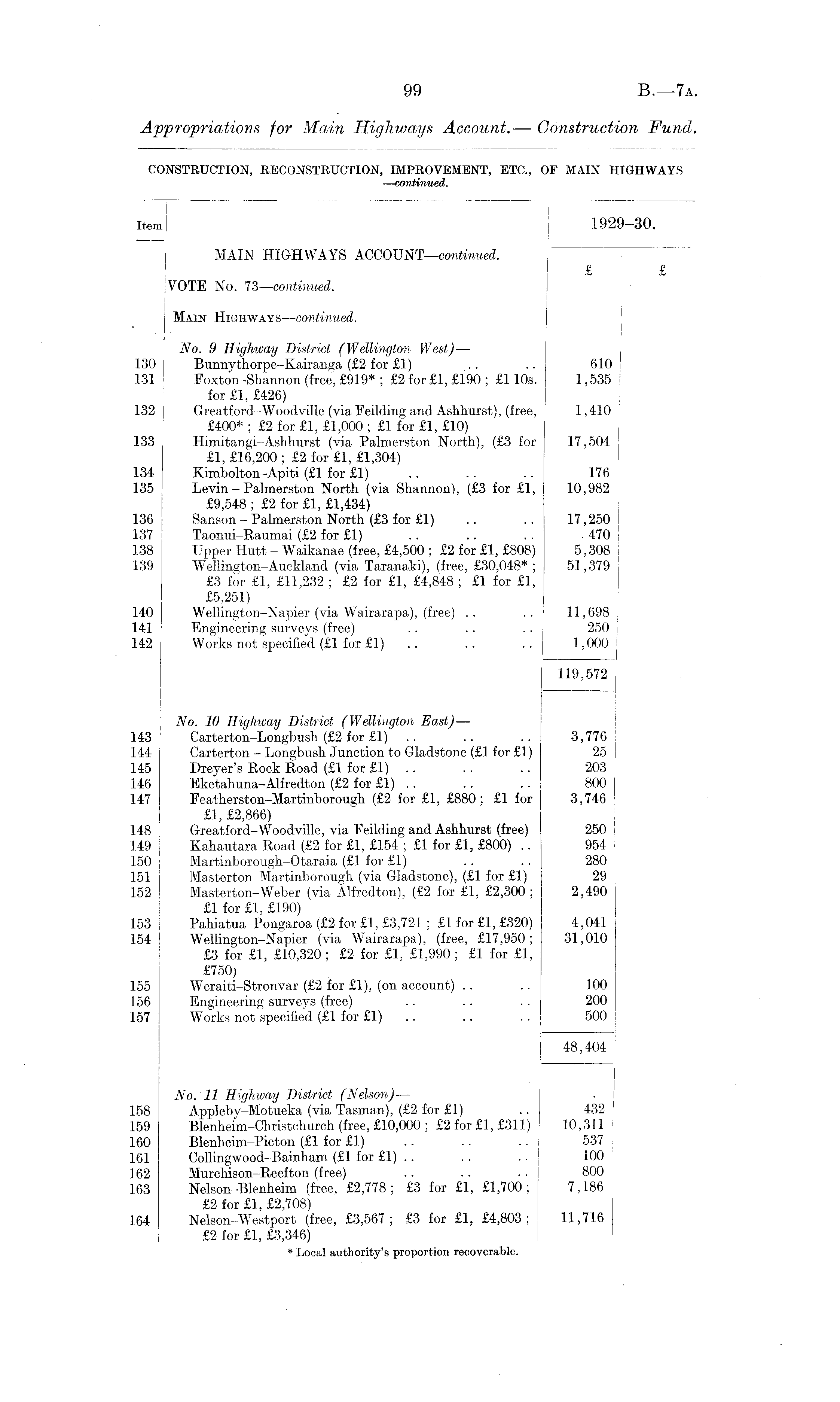 I I Item j 1929-30. MAIN HIGHWAYS ACCOUNT—continued. £ £ VOTE No. 73—continued. , Main Highways—continued. ' I No. 9 Highway District ( Wellington West) — 130 I Bunnythorpe-Kairanga (£2 for £1) .. .. 610 131 1 Foxton-Shannon (free, £919* ; £2 for £1, £190 ; £1 10s. 1,535 for £1, £426) 132 i Greatford-Woodville (via Feilding and Ashhurst), (free, 1,410 £400* ; £2 for £1, £1,000 ; £1 for £1, £10) 133 Himitangi-Ashhurst (via Palmerston North), (£3 for 17,504 £1, £16,200 ; £2 for £1, £1,304) 134 Kimbolton-Apiti (£1 for £1) .. .. .. 176 135 Levin - Palmerston North (via Shannon), (£3 for £1, 10,982 £9,548 ; £2 for £1, £1,434) 136 Sanson - Palmerston North (£3 for £1) .. .. 17,250 137 Taonui-Raumai (£2 for £1) .. .. . . 470 138 Upper Hutt - Waikanae (free, £4,500 ; £2 for £1, £808) 5,308 139 Wellington-Auckland (via Taranaki), (free, £30,048*; 51,379 , £3 for £1, £11,232 ; £2 for £1, £4,848 ; £1 for £1, £5,251) 140 Wellington-Napier (via Wairarapa), (free) .. .. 11,698 141 Engineering surveys (free) .. .. . . 250 142 Works not specified (£1 for £1) .. .. .. 1,000 119,572 | No. 10 Highway District (Wellington East) — 143 Carterton-Longbush (£2 for £1) .. .. .. 3,776 144 Carterton - Longbush Junction to Gladstone (£1 for £1) 25 145 Dreyer's Rock Road (£1 for £1) .. . . .. 203 146 Eketahuna-Alfredton (£2 for £1) .. .. .. 800 147 Featherston-Martinborough (£2 for £1, £880; £1 for 3,746 £1, £2,866) 148 Greatford-Woodville, via Feilding and Ashhurst (free) 250 149 Kahautara Road (£2 for £1, £154 ; £1 for £1, £800) .. 954 150 , Martinborough-Otaraia (£1 for £1) . . .. 280 151 i Masterton-Martinborough (via Gladstone), (£1 for £1) 29 152 ! Masterton-Weber (via Alfredton), (£2 for £1, £2,300; 2,490 £1 for £1, £190) 153 Pahiatua-Pongaroa (£2 for £1, £3,721 ; £1 for £1, £320) 4,041 154 Wellington-Napier (via Wairarapa), (free, £17,950; 31,010 £3 for £1, £10,320; £2 for £1, £1,990; £1 for £1, £750; 155 Weraiti-Stronvar (£2 for £1), (on account) .. .. 100 156 Engineering surveys (free) .. . . . . 200 157 Works not specified (£1 for £1) .. .. . . 500 48,404 ' No. 11 Highway District (Nelson) — 158 Appleby-Motueka (via Tasman), (£2 for £1) .. 432 159 Blenheim-Christchurch (free, £10,000 ; £2 for £1, £311) 10,311 160 Blenheim-Picton (£1 for £1) .. .. .. 537 161 Collingwood-Bainham (£1 for £1) .. .. .. ]00 162 Murchison-Reefton (free) .. .. . • 800 163 Nelson-Blenheim (free, £2,778; £3 for £1, £1,700; 7,186 £2 for £1, £2,708) 164 Nelson-Westport (free, £3,567; £3 for £1, £4,803; 11,716 £2 for £1, £3,346) * Local authority's proportion recoverable.