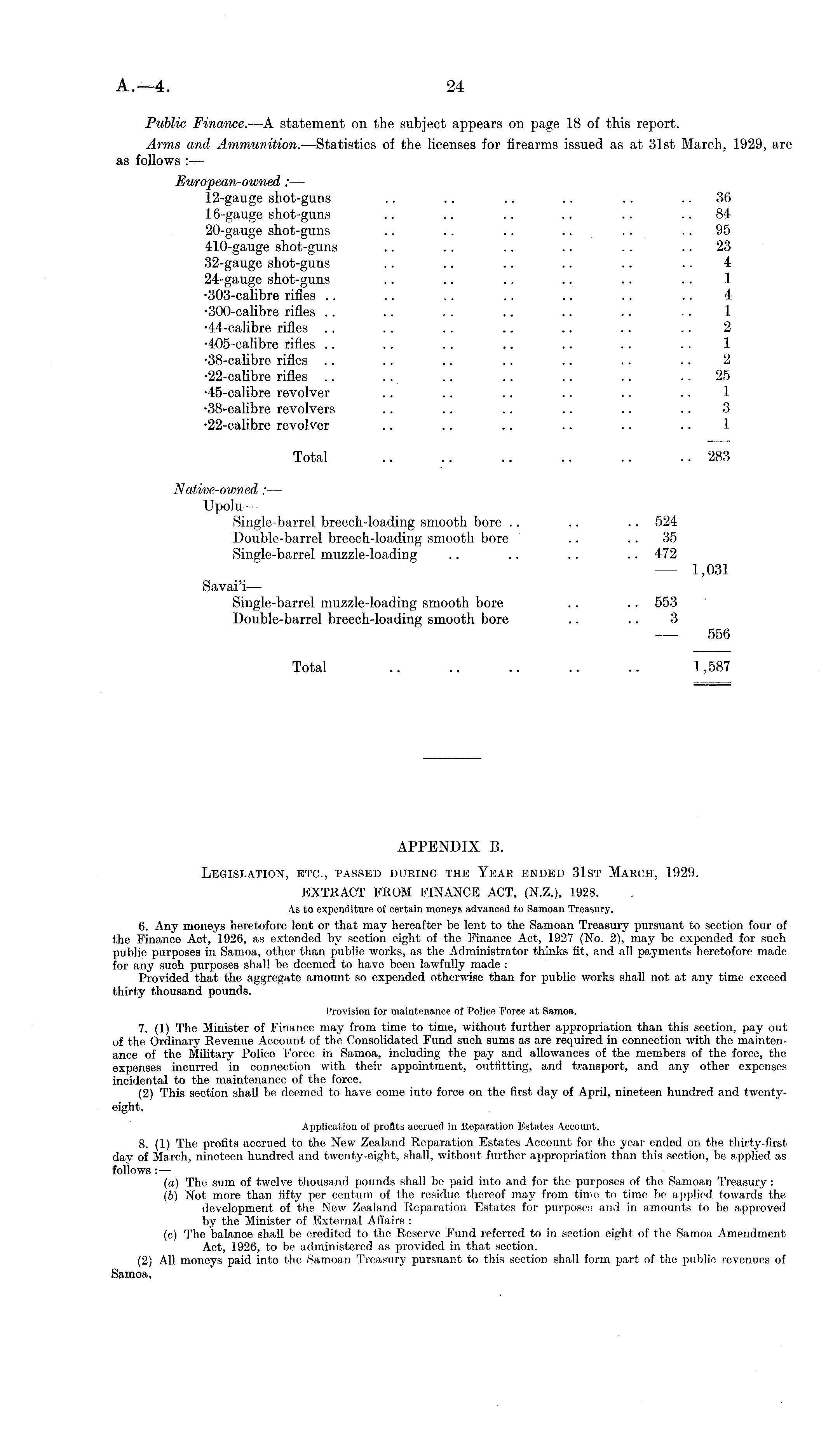 Public Finance. —A statement on. the subject appears on page 18 of this report. Arms and Ammunition. —Statistics of the licenses for firearms issued as at 31st March, 1929, are as follows : — European-owned: — 12-gauge shot-guns .. .. .. .. .. 36 16-gauge shot-guns .. .. .. .. .. 84 20-gauge shot-guns .. .. .. .. .. 95 410-gauge shot-guns .. .. .. .. .. 23 32-gauge shot-guns .. .. .. .. . . .. 4 24-gauge shot-guns .. .. .. .. .. .. 1 •303-calibre rifles .. .. .. .. .. .. .. 4 •300-calibre rifles .. .. .. .. .. .. .. 1 •44-calibre rifles .. .. .. .. .. .. .. 2 •405-calibre rifles .. .. .. .. .. .. .. 1 •38-calibre rifles .. .. .. .. .. .. .. 2 ■22-calibre rifles .. .. .. .. .. .. 25 •45-calibre revolver .. .. .. .. .. .. 1 •38-calibre revolvers .. .. .. .. .. .. 3 •22-calibre revolver .. .. .. .. .. .. 1 Total .. .. .. .. .. .. 283 Native-owned : — Upolu— Single-barrel breech-loading smooth bore .. .. .. 524 Double-barrel breech-loading smooth bore .. .. 35 Single-barrel muzzle-loading .. .. .. .. 472 — 1,031 Savai'i— Single-barrel muzzle-loading smooth bore .. .. 553 Double-barrel breech-loading smooth bore .. .. 3 — 556 Total .. .. .. .. .. 1,587 APPENDIX B. Legislation, etc., passed during the Year ended 31st March, 1929. EXTRACT FROM FINANCE ACT, (N.Z.), 1928. As to expenditure of certain moneys advanced to Samoan Treasury. 6. Any moneys heretofore lent or that may hereafter be lent to the Samoan Treasury pursuant to section four of the Finance Act, 1926, as extended by section eight of the Finance Act, 1927 (No. 2), may be expended for such public purposes in Samoa, other than public works, as the Administrator thinks fit, and all payments heretofore made for any such purposes shall be deemed to have been lawfully made : Provided that the aggregate amount so expended otherwise than for public works shall not at any time exceed thirty thousand pounds. Provision for maintenance of Police Force at Samoa. 7. (1) The Minister of Finance may from time to time, without further appropriation than this section, pay out of the Ordinary Revenue Account of the Consolidated Fund such sums as are required in connection with the maintenance of the Military Police Force in Samoa, including the pay and allowances of the members of the force, the expenses incurred in connection with their appointment, outfitting, and transport, and any other expenses incidental to the maintenance of the force. (2) This section shall be deemed to have come into force on the first day of April, nineteen hundred and twentyeight. Application of profits accrued in Reparation Estates Account. 8. (1) The profits accrued to the New Zealand Reparation Estates Account for the year ended on the thirty-first day of March, nineteen hundred and twenty-eight, shall, without further appropriation than this section, be applied as follows : — (a) The sum of twelve thousand pounds shall be paid into and for the purposes of the Samoan Treasury : (b) Not more than fifty per centum of the residue thereof may from time to time be applied towards the development of the New Zealand Reparation Estates for purposed and in amounts to be approved by the Minister of External Affairs : (c) The balance shall be credited to the Reserve Fund referred to in section eight of the Samoa Amendment Act, 1926, to be administered as provided in that section. (2) All moneys paid into the Samoan Treasury pursuant to this section shall form part of the public revenues of Samoa,