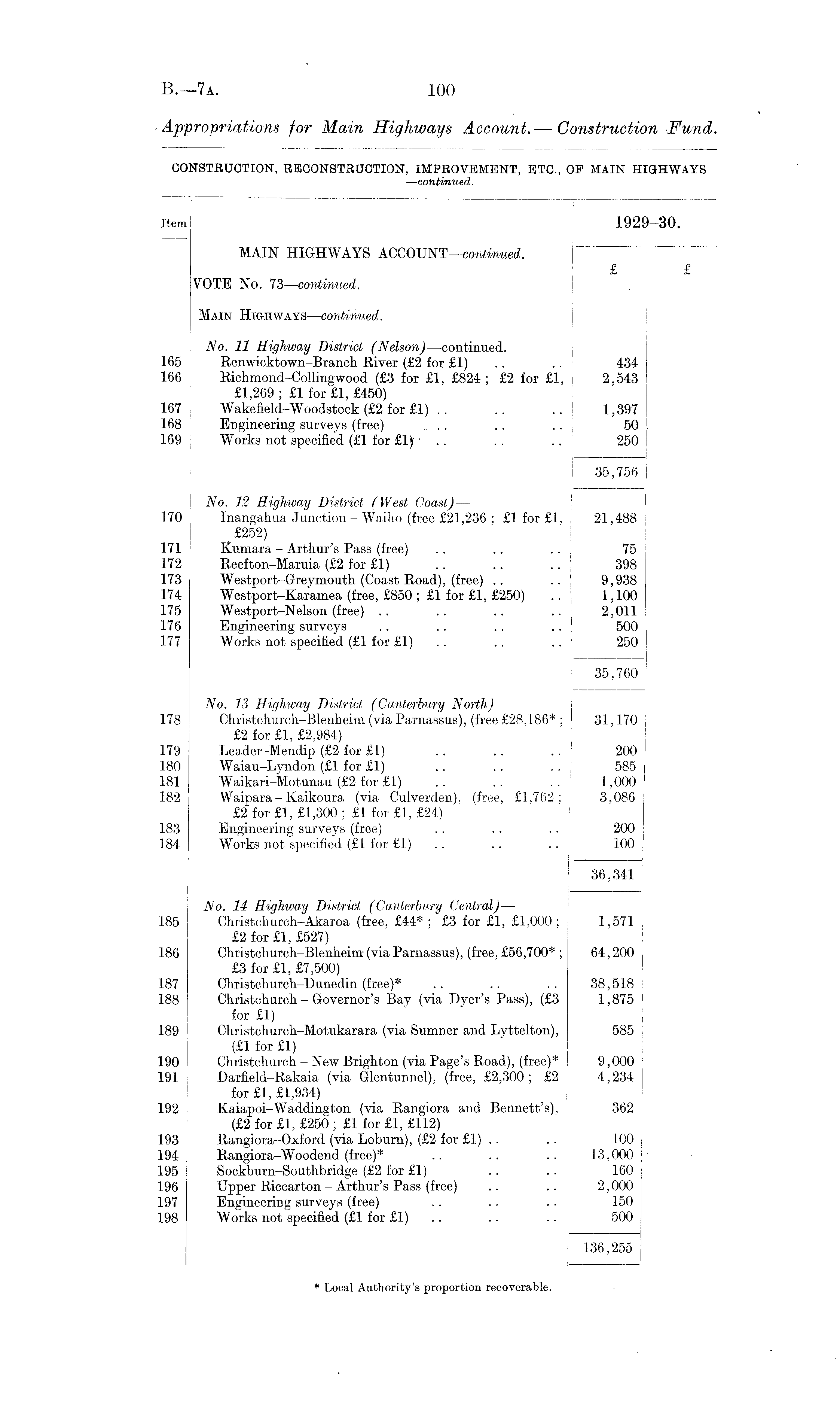 I ~ I Item 1929-30. MAIN HIGHWAYS ACCOUNT —continued. \" ~ , £ I £ VOTE No. 73 —continued. Main Highways—continued. No. 11 Highway District (Nelson) —continued. 165 | Renwicktown-Branch River (£2 for £1) .. .. 434 166 ' Richmond-Collingwood (£3 for £1, £824; £2 for £1, 2,543 £1,269 ; £1 for £1, £450) 167 Wakefield-Woodstock (£2 for £1) .. .. .. 1,397 168 Engineering surveys (free) . . .. .. 50 169 Works not specified (£1 for £1) .. .. .. 250 35,756 No. 12 Highway District (West Coast) — 170 Inangahua Junction - Waiho (free £21,236 ; £1 for £1. . 21,488 £252) 171 . Kumara - Arthur's Pass (free) . . .. . . 75 172 ! Reefton-Maruia (£2 for £1) . . .. . . 398 173 Westport-Greymouth (Coast Road), (free) .. .. 9,938 174 Westport-Karamea (free, £850 ; £1 for £1, £250) .. 1,100 175 Westport-Nelson (free) .. .. .. .. 2,011 176 Engineering surveys .. . . .. . . 500 177 Works not specified (£1 for £1) . . .. .. 250 35,760 No. IS Highway District (Canterbury North) — 178 Christchurch-Blenheim (via Parnassus), (free £28.186* : 31,170 ! £2 for £1, £2,984) 179 Leader-Mendip (£2 for £1) .. .. .. 200 180 Waiau-Lyndon (£1 for £1) . . . . .. I 585 181 Waikari-Motunau (£2 for £1) .. .. .. 1,000 182 Waipara-Kaikoura, (via Culverden), (free, £1,762; 3,086 £2 for £1, £1,300 ; £1 for £1, £24) 183 Engineering surveys (free) .. .. .. 200 184 Works not specified (£1 for £1) .. .. .. 100 ! 36,341 i No. 14 Highway District (Canterbury Central) — 185 Christchurch-Akaroa (free, £44*; £3 for £1, £1,000; 1,571 £2 for £1, £527) 186 Christchurch-Blenheim (via Parnassus), (free, £56,700* ; 64,200 £3 for £1, £7,500) 187 Christchurch-Dunedin (free)* .. .. .. 38,518 188 Christchurch - Governor's Bay (via Dyer's Pass), (£3 1,875 for £1) 189 1 Christchurch-Motukarara (via Sumner and Lyttelton), 585 (£1 for £1) 190 Christchurch - New Brighton (via Page's Road), (free)* 9,000 191 ! Darfield-Rakaia (via Glentunnel), (free, £2,300; £2 4,234 for £1, £1,934) 192 i Kaiapoi-Waddington (via Rangiora and Bennett's), 362 (£2 for £1, £250 ; £1 for £1, £112) 193 | Rangiora-Oxford (via Loburn), (£2 for £1) . . ,. j 100 194 Rangiora-Woodend (free)* .. .. .. 13,000 195 Sockburn-Southbridge (£2 for £1) . . .. 160 196 Upper Riccarton - Arthur's Pass (free) .. .. 2,000 197 Engineering surveys (free) .. .. .. 150 198 Works not specified (£1 for £1) .. .. .. 500 136,255 * Local Authority's proportion recoverable.