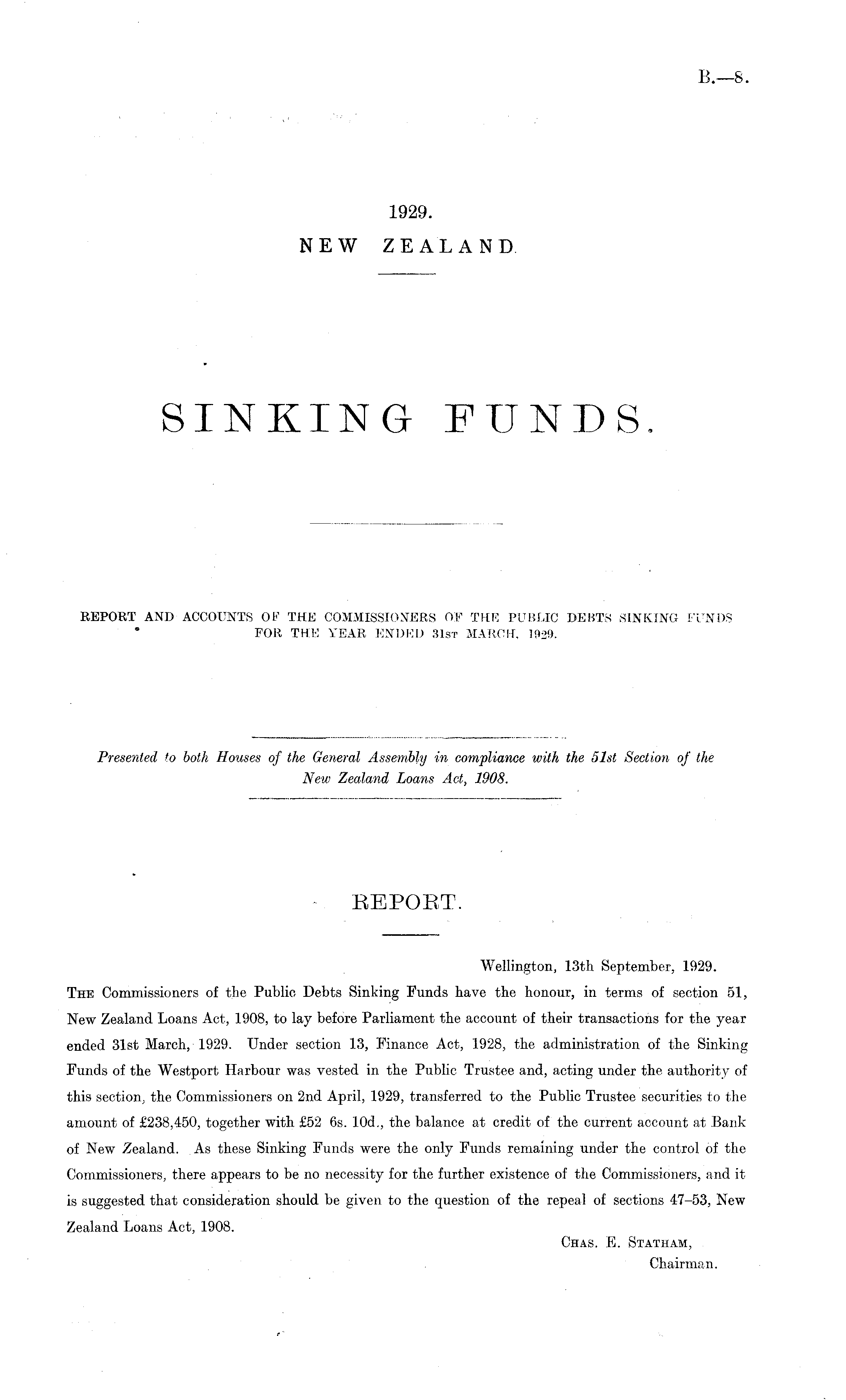 REPORT. Wellington, 13th September, 1929. The Commissioners of the Public Debts Sinking Funds have the honour, in terms of section 51, New Zealand Loans Act, 1908, to lay before Parliament the account of their transactions for the year ended 31st March, 1929. Under section 13, Finance Act, 1928, the administration of the Sinking Funds of the Westport Harbour was vested in the Public Trustee and, acting under the authority of this section, the Commissioners on 2nd April, 1929, transferred to the Public Trustee securities to the amount of £238,450, together with £52 6s. 10d., the balance at credit of the current account at Bank of New Zealand. As these Sinking Funds were the only Funds remaining under the control of the Commissioners, there appears to be no necessity for the further existence of the Commissioners, and it is suggested that consideration should be given to the question of the repeal of sections 47-53, New Zealand Loans Act, 1908. Chas. E. Statham, Chairman.