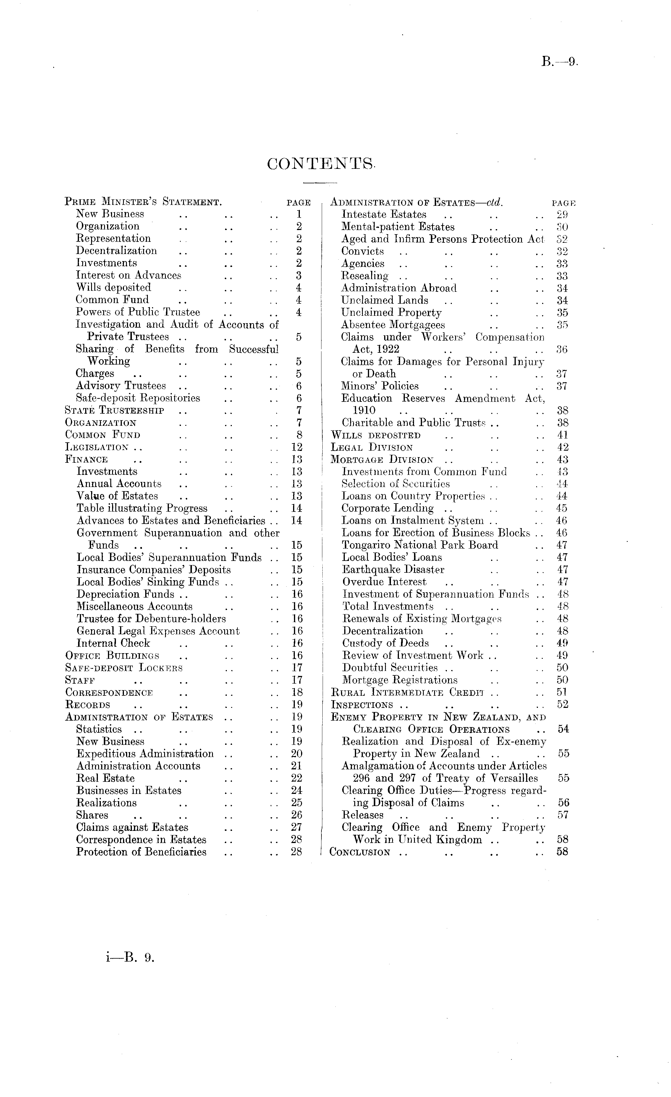 CONTENTS. Prime Minister's Statement. page Administration of Estates—ctd. page New Business .. .. .. 1 Intestate Estates .. . . 29 Organization .. .. 2 Mental-patient Estates .. .. SO Representation .. 2 Aged and Infirm Persons Protection Act S2 Decentralization .. .. . . 2 Convicts . . .. .. 32 Investments .. .. 2 Agencies .. .. . . . . 33 Interest on Advances .. . . 3 Resealing . . .. .. .. 33 Wills deposited . . .. 4 Administration Abroad .. 34 Common Fund .. . . 4 Unclaimed Lands .. . . . . 34 Powers of Public Trustee .. .. 4 Unclaimed Property .. 35 Investigation and Audit of Accounts of Absentee Mortgagees .. .. 35 Private Trustees .. .. 5 Claims under Workers' Compensation Sharing of Benefits from Successful Act, 1922 .. .. .. 36 Working .. . . 5 Claims for Damages for Personal Injury Charges .. .. .. 5 or Death .. .. .. 37 Advisory Trustees .. .. .. 6 Minors' Policies .. .. .. 37 Safe-deposit Repositories .. .. 6 Education Reserves Amendment Act, State Trusteeship .. .. .7 1910 .. .. .. .. 38 Organization .. .. 7 Charitable and Public Trusts .. 38 Common Fund .. .. 8 Wills deposited .. ~ .. 41 Legislation .. .. .. .12 Legal Division .. .. .. 42 Finance .. .. .. .. 13 Mortgage Division .. .. .. 43 Investments .. .. 13 Investments from Common Fund .. 43 Annual Accounts .. .. 13 Selection of Securities .. .. 44 Value of Estates .. .. 13 Loans on Country Properties . . 44 Table illustrating Progress .. 14 Corporate Lending .. . . 45 Advances to Estates and Beneficiaries . . 14 Loans on Instalment System .. . . 46 Government Superannuation and other Loans for Erection of Business Blocks .. 46 Funds .. .. .. 15 Tongariro National Park Board .. 47 Local Bodies' Superannuation Funds .. 15 Local Bodies' Loans .. 47 Insurance Companies' Deposits . . 15 Earthquake Disaster .. 47 Local Bodies' Sinking Funds . . . . 15 Overdue Interest .. . . . . 47 Depreciation Funds .. .. ..16 Investment of Superannuation Funds .. 48 Miscellaneous Accounts .. 16 Total Investments .. .. .. 48 Trustee for Debenture-holders .. 16 Renewals of Existing Mortgages .. 48 General Legal Expenses Account . . 16 Decentralization .. .. 48 Internal Check .. .. 16 Custody of Deeds .. .. 49 Office Buildings .. .. .. 16 Review of Investment Work .. .. 49 Safe-deposit Lockers .. 17 Doubtful Securities .. .. .. 50 Staff .. .. .. 17 Mortgage Registrations .. .. 50 Correspondence .. .. 18 Rural Intermediate Credit .. .. 51 Records .. .. .. .. 19 Inspections .. .. .. .. 52 Administration of Estates .. 19 Enemy Property in New Zealand, and Statistics .. .. .. .. 19 Clearing Office Operations .. 54 New Business .. .. 19 Realization and Disposal of Ex-enemy Expeditious Administration . . 20 Property in New Zealand .. 55 Administration Accounts .. ..21 Amalgamation of Accounts under Articles Real Estate .. .. 22 296 and 297 of Treaty of Versailles 55 Businesses in Estates .. 24 Clearing Office Duties —Progress regardRealizations .. .. . . 25 ing Disposal of Claims .. .. 56 Shares .. .. .. .. 26 Releases .. .. .. .. 57 Claims against Estates .. 27 Clearing Office and Enemy Property Correspondence in Estates .. .. 28 Work in United Kingdom .. .. 58 Protection of Beneficiaries .. .. 28 Conclusion .. .. .. .. 58