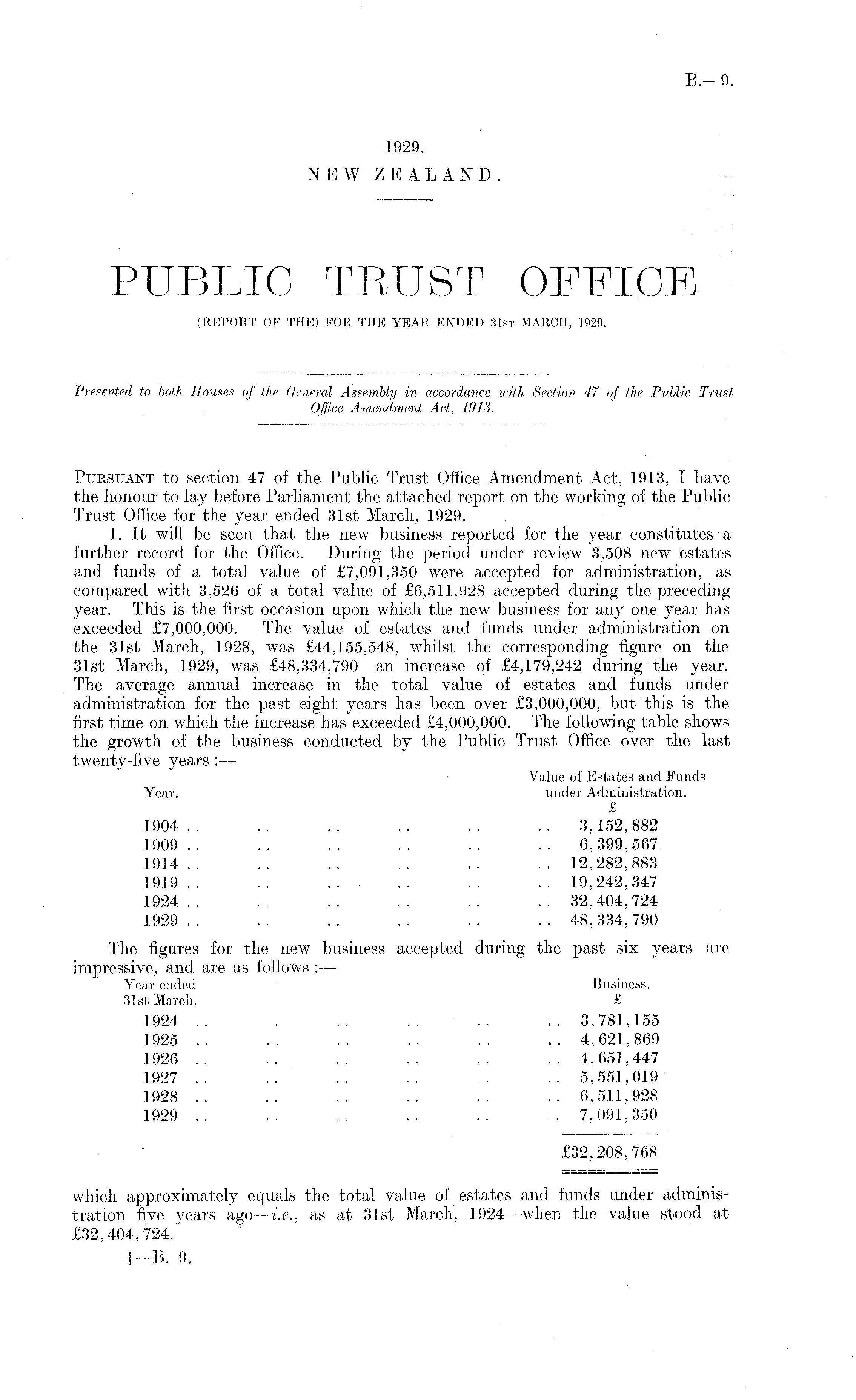 Pursuant to section 47 of the Public Trust Office Amendment Act, 1913, I have the honour to lay before Parliament the attached report on the working of the Public Trust Office for the year ended 31st March, 1929. 1. It will be seen that the new business reported for the year constitutes a further record for the Office. During the period under review 3,508 new estates and funds of a total value of £7,091,350 were accepted for administration, as compared with 3,526 of a total value of £6,511,928 accepted during the preceding year. This is the first occasion upon which the new business for any one year has exceeded £7,000,000. The value of estates and funds under administration on the 31st March, 1928, was £44,155,548, whilst the corresponding figure on the 31st March, 1929, was £48,334,790 —an increase of £4,179,242 during the year. The average annual increase in the total value of estates and funds under administration for the past eight years has been over £3,000,000, but this is the first time on which the increase has exceeded £4,000,000. The following table shows the growth of the business conducted by the Public Trust Office over the last twenty-five years : — Value of Estates and Funds Year. under Administration. £ 1904 . . . . .. .. . . . . 3,152,882 1909 . . . . .. . . . . . . 6,399,567 1914.. .. .. .. .. .. 12,282,883 1919.. .. .. .. .. .. 19,242,347 1924.. .. .. .. .. .. 32,404,724 1929.. .. .. .. .. .. 48,334,790 The figures for the new business accepted during the past six years are impressive, and are as follows : — Year ended Business. 31st March, £ 1924 .. . .. .. .. .. 3,781,155 1925 .. .. .. . ..4,621,869 1926 .. .. .. .. .. 4,651,447 1927 .. .. .. .. . . . . 5,551,019 1928 .. .. .. .. .. .. 6,511,928 1929 ~ .. .. .. . . 7,091,350 £32,208,768 which approximately equals the total value of estates and funds under administration five years ago —i.e., as at 31st March, 1924 —when the value stood at £32,404,724.'