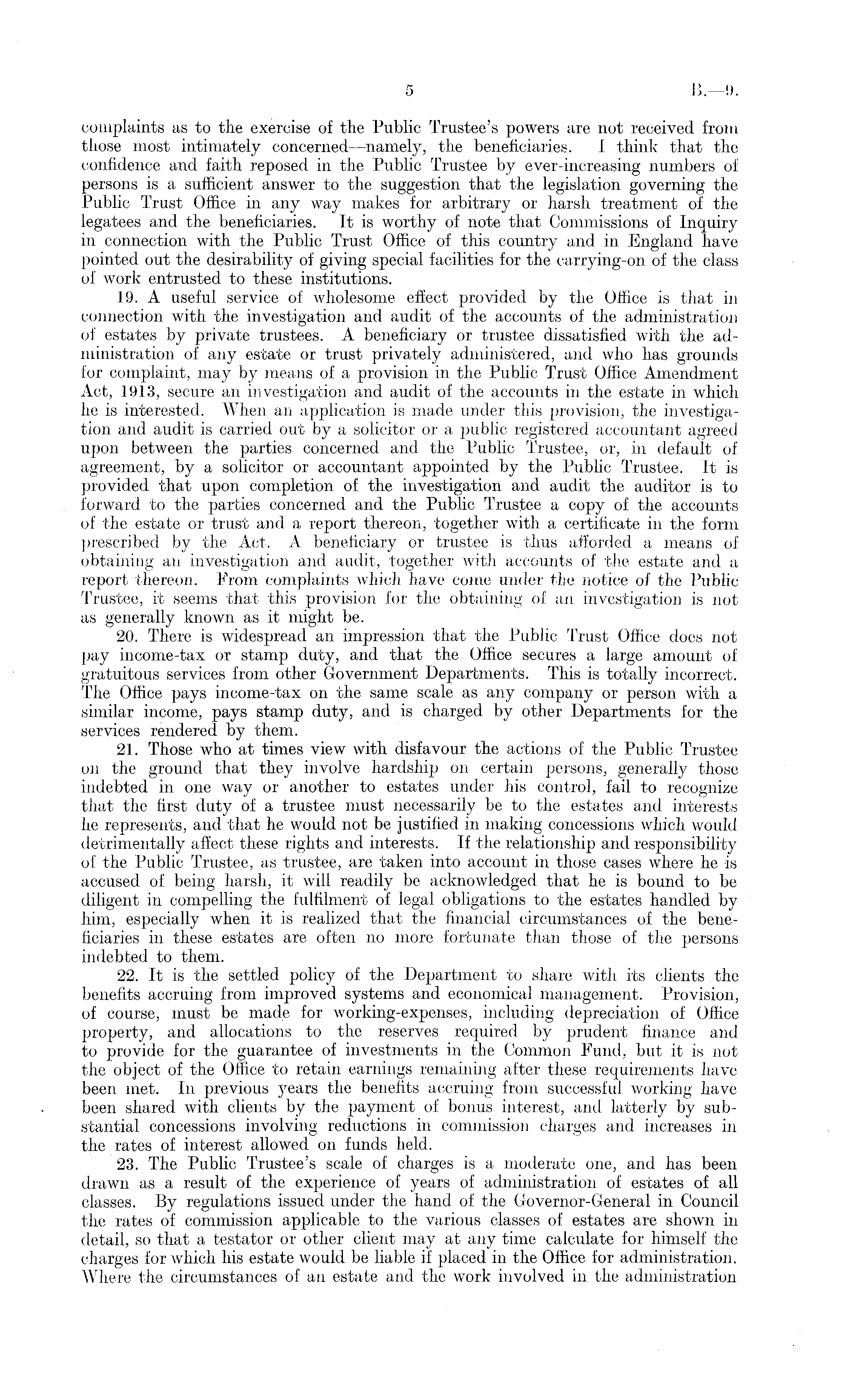 complaints as to the exercise of the Public Trustee's powers are not received from those most intimately concerned —namely, the beneficiaries. I think that the confidence and faith reposed in the Public Trustee by ever-increasing numbers of persons is a sufficient answer to the suggestion that the legislation governing the Public Trust Office in any way makes for arbitrary or harsh treatment of the legatees and the beneficiaries. It is worthy of note that Commissions of Inquiry in connection with the Public Trust Office of this country and in England have pointed out the desirability of giving special facilities for the carrying-on of the class of work entrusted to these institutions. 19. A useful service of wholesome effect provided by the Office is that in connection with the investigation and audit of the accounts of the administration of estates by private trustees. A beneficiary or trustee dissatisfied with the administration of any estate or trust privately administered, and who has grounds for complaint, may by means of a provision in the Public Trust Office Amendment Act, 1913, secure an investigation and audit of the accounts in the estate in which he is interested. When an application is made under this provision, the investigation and audit is carried out by a solicitor or a public registered accountant agreed upon between the parties concerned and the Public Trustee, or, in default of agreement, by a solicitor or accountant appointed by the Public Trustee. It is provided that upon completion of the investigation and audit the auditor is to forward to the parties concerned and the Public Trustee a copy of the accounts of the estate or trust and a report thereon, together with a certificate in the form prescribed by the Act. A beneficiary or trustee is thus afforded a means of obtaining an investigation and audit, together with accounts of the estate and a report thereon. From complaints which have come under the notice of the Public Trustee, it seems that this provision for the obtaining of an investigation is not as generally known as it might be. 20. There is widespread an impression that the Public Trust Office does not pay income-tax or stamp duty, and that the Office secures a large amount of gratuitous services from other Government Departments. This is totally incorrect. The Office pays income-tax on the same scale as any company or person with a similar income, pays stamp duty, and is charged by other Departments for the services rendered by them. 21. Those who at times view with disfavour the actions of the Public Trustee on the ground that they involve hardship on certain persons, generally those indebted in one way or another to estates under his control, fail to recognize that the first duty of a trustee must necessarily be to the estates and interests he represents, and that he would not be justified in making concessions which would detrimentally affect these rights and interests. If the relationship and responsibility of the Public Trustee, as trustee, are taken into account in those cases where he is accused of being harsh, it will readily be acknowledged that he is bound to be diligent in compelling the fulfilment of legal obligations to the estates handled by him, especially when it is realized that the financial circumstances of the beneficiaries in these estates are often no more fortunate than those of the persons indebted to them. 22. It is the settled policy of the Department to share with its clients the benefits accruing from improved systems and economical management. Provision, of course, must be made for working-expenses, including depreciation of Office property, and allocations to the reserves required by prudent finance and to provide for the guarantee of investments in the Common Fund, but it is not the object of the Office to retain earnings remaining after these requirements have been met. In previous years the benefits accruing from successful working have been shared with clients by the payment of bonus interest, and latterly by substantial concessions involving reductions in commission charges and increases in the rates of interest allowed on funds held. 23. The Public Trustee's scale of charges is a moderate one, and has been drawn as a result of the experience of years of administration of estates of all classes. By regulations issued under the hand of the Governor-General in Council the rates of commission applicable to the various classes of estates are shown in detail, so that a testator or other client may at any time calculate for himself the charges for which his estate would be liable if placed in the Office for administration. Where the circumstances of an estate and the work involved in the administration