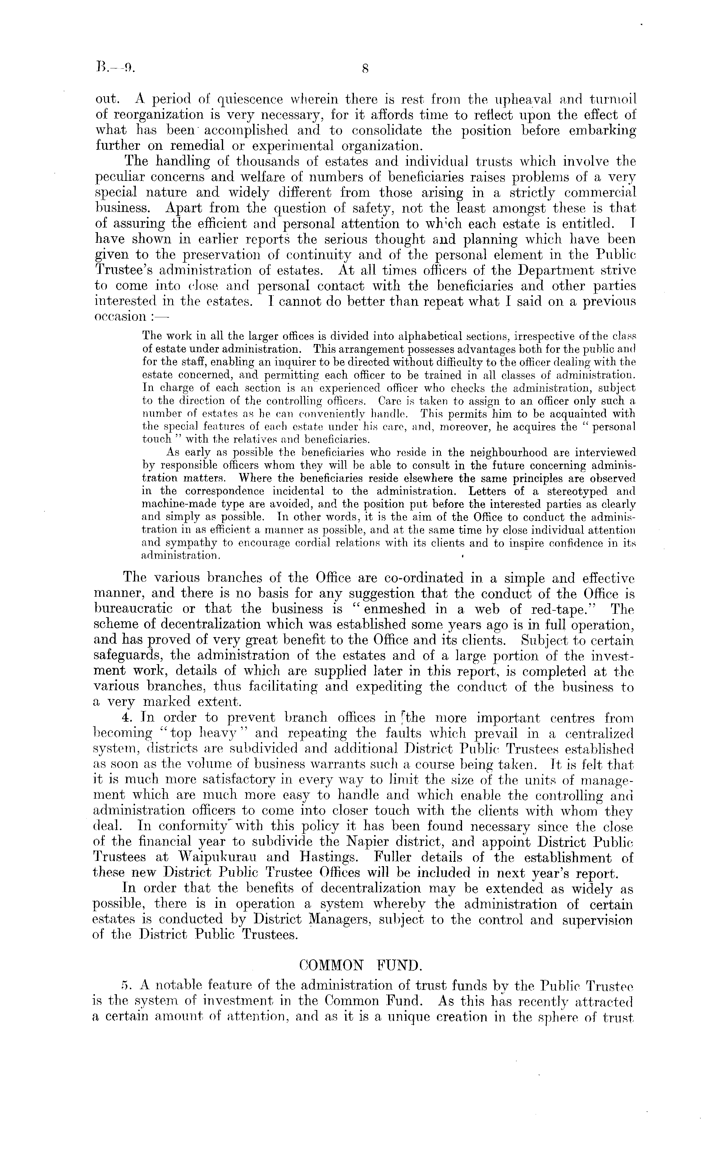 out. A period of quiescence wherein there is rest from the upheaval and turmoil of reorganization is very necessary, for it affords time to reflect upon the effect of what has been accomplished and to consolidate the position before embarking further on remedial or experimental organization. The handling of thousands of estates and individual trusts which involve the peculiar concerns and welfare of numbers of beneficiaries raises problems of a very special nature and widely different from those arising in a strictly commercial business. Apart from the question of safety, not the least amongst these is that of assuring the efficient and personal attention to wh : ch each estate is entitled. T have shown in earlier reports the serious thought and planning which have been given to the preservation of continuity and of the personal element in the Public Trustee's administration of estates. At all times officers of the Department strive to come into close and personal contact with the beneficiaries and other parties interested in the estates. I cannot do better than repeat what I said on a previous occasion :— The work in all the larger offices is divided into alphabetical sections, irrespective of the class of estate under administration. This arrangement possesses advantages both for the public and for the staff, enabling an inquirer to be directed without difficulty to the officer dealing with the estate concerned, and permitting each officer to be trained in all classes of administration. In charge of each section is an experienced officer who checks the administration, subject to the direction of the controlling officers. Care is taken to assign to an officer only such a number of estates as he can conveniently handle. This permits him to be acquainted with the special features of each estate under his care, and, moreover, he acquires the " personal touch " with the relatives and beneficiaries. As early as possible the beneficiaries who reside in the neighbourhood are interviewed by responsible officers whom they will be able to consult in the future concerning administration matters. Where the beneficiaries reside elsewhere the same principles are observed in the correspondence incidental to the administration. Letters of a stereotyped and machine-made type are avoided, and the position put before the interested parties as clearly and simply as possible. In other words, it is the aim of the Office to conduct the administration in as efficient a manner as possible, and at the same time by close individual attention and sympathy to encourage cordial relations with its clients and to inspire confidence in its administration. • The various branches of the Office are co-ordinated in a simple and effective manner, and there is no basis for any suggestion that the conduct of the Office is bureaucratic or that the business is " enmeshed in a web of red-tape." The scheme of decentralization which was established some years ago is in full operation, and has proved of very great benefit to the Office and its clients. Subject to certain safeguards, the administration of the estates and of a large portion of the investment work, details of which are supplied later in this report, is completed at the various branches, thus facilitating and expediting the conduct of the business to a very marked extent. 4. In order to prevent branch offices in fthe more important centres from becoming "top heavy" and repeating the faults which prevail in a centralized system, districts are subdivided and additional District Public Trustees established as soon as the volume of business warrants such a course being taken. It is felt that it is much more satisfactory in every way to limit the size of the units of management which are much more easy to handle and which enable the controlling and administration officers to come into closer touch with the clients with whom they deal. In conformity" with this policy it has been found necessary since the close of the financial year to subdivide the Napier district, and appoint District Public Trustees at Waipukurau and Hastings. Fuller details of the establishment of these new District Public Trustee Offices will be included in next year's report. In order that the benefits of decentralization may be extended as widely as possible, there is in operation a system whereby the administration of certain estates is conducted by District Managers, subject to the control and supervision of the District Public Trustees. COMMON FUND. 5. A notable feature of the administration of trust funds by the Public Trustee is the system of investment in the Common Fund. As this has recently attracted a certain amount of attention, and as it is a unique creation in the sphere of trust