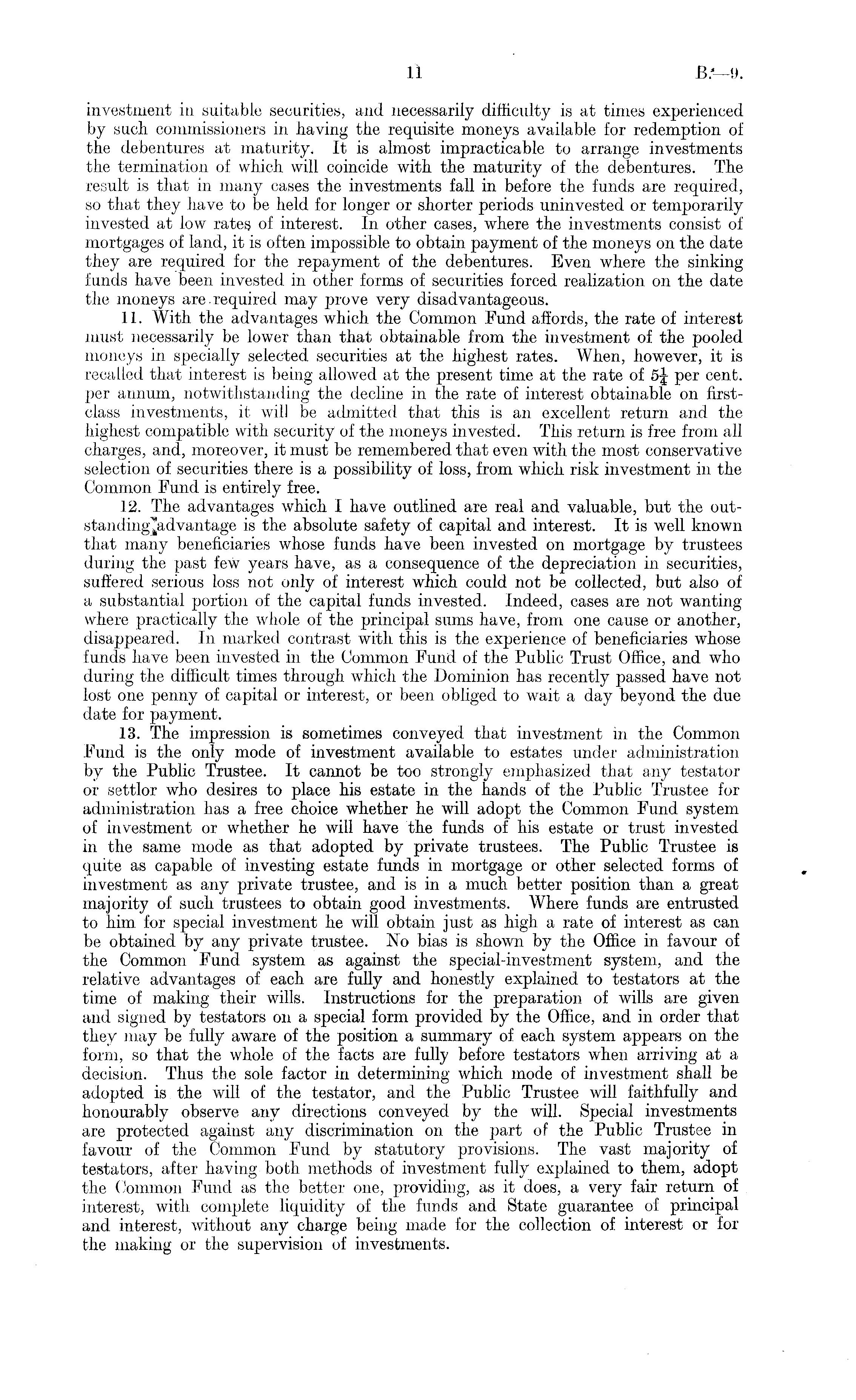investment in suitable securities, and necessarily difficulty is at times experienced by such commissioners in having the requisite moneys available for redemption of the debentures at maturity, It is almost impracticable to arrange investments the termination of which will coincide with the maturity of the debentures. The result is that in many cases the investments fall in before the funds are required, so that they have to be held for longer or shorter periods uninvested or temporarily invested at low rates of interest. In other cases, where the investments consist of mortgages of land, it is often impossible to obtain payment of the moneys on the date they are required for the repayment of the debentures. Even where the sinking funds have been invested in other forms of securities forced realization on the date the moneys are. required may prove very disadvantageous. 11. With the advantages which the Common Fund affords, the rate of interest must necessarily be lower than that obtainable from the investment of the pooled moneys in specially selected securities at the highest rates. When, however, it is recalled that interest is being allowed at the present time at the rate of per cent, per annum, notwithstanding the decline in the rate of interest obtainable on firstclass investments, it will be admitted that this is an excellent return and the highest compatible with security of the moneys invested. This return is free from all charges, and, moreover, it must be remembered that even with the most conservative selection of securities there is a possibility of loss, from which risk investment in the Common Fund is entirely free. 12. The advantages which I have outlined are real and valuable, but the outis the absolute safety of capital and interest. It is well known that many beneficiaries whose funds have been invested on mortgage by trustees during the past few years have, as a consequence of the depreciation in securities, suffered serious loss not only of interest which could not be collected, but also of a substantial portion of the capital funds invested. Indeed, cases are not wanting where practically the whole of the principal sums have, from one cause or another, disappeared. In marked contrast with this is the experience of beneficiaries whose funds have been invested in the Common Fund of the Public Trust Office, and who during the difficult times through which the Dominion has recently passed have not lost one penny of capital or interest, or been obliged to wait a day beyond the due date for payment. 13. The impression is sometimes conveyed that investment in the Common Fund is the only mode of investment available to estates under administration by the Public Trustee. It cannot be too strongly emphasized that any testator or settlor who desires to place his estate in the hands of the Public Trustee for administration has a free choice whether he will adopt the Common Fund system of investment or whether he will have the funds of his estate or trust invested in the same mode as that adopted by private trustees. The Public Trustee is quite as capable of investing estate funds in mortgage or other selected forms of investment as any private trustee, and is in a much better position than a great majority of such trustees to obtain good investments. Where funds are entrusted to him for special investment he will obtain just as high a rate of interest as can be obtained by any private trustee. No bias is shown by the Office in favour of the Common Fund system as against the special-investment system, and the relative advantages of each are fully and honestly explained to testators at the time of making their wills. Instructions for the preparation of wills are given and signed by testators on a special form provided by the Office, and in order that they may be fully aware of the position a summary of each system appears on the form, so that the whole of the facts are fully before testators when arriving at a decision. Thus the sole factor in determining which mode of investment shall be adopted is the will of the testator, and the Public Trustee will faithfully and honourably observe any directions conveyed by the will. Special investments are protected against any discrimination on the part of the Public Trustee in favour of the Common Fund by statutory provisions. The vast majority of testators, after having both methods of investment fully explained to them, adopt the Common Fund as the better one, providing, as it does, a very fair return of interest, with complete liquidity of the funds and State guarantee of principal and interest, without any charge being made for the collcction of interest or for the making or the supervision of investments.
