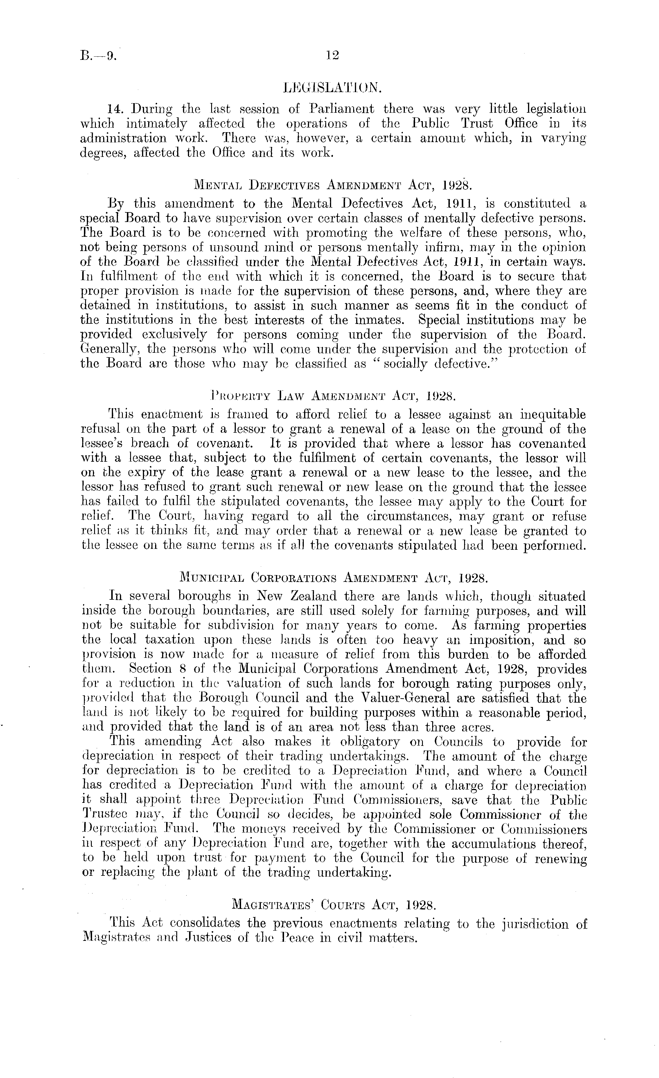 LEGISLATION. 14. During the last session of Parliament there was very little legislation which intimately affected the operations of the Public Trust Office in its administration work. There was, however, a certain amount which, in varying degrees, affected the Office and its work. Mental Defectives Amendment Act, 1928. By this amendment to the Mental Defectives Act, 1911, is constituted a special Board to have supervision over certain classes of mentally defective persons. The Board is to be concerned with promoting the welfare of these persons, who, not being persons of unsound mind or persons mentally infirm, may in the opinion of the Board be classified under the Mental Defectives Act, 1911, in certain ways. In fulfilment of the end with which it is concerned, the Board is to secure that proper provision is made for the supervision of these persons, and, where they are detained in institutions, to assist in such manner as seems fit in the conduct of the institutions in the best interests of the inmates. Special institutions may be provided, exclusively for persons coming under the supervision of the Board. Generally, the persons who will come under the supervision and the protection of the Board are those who may be classified as " socially defective." Property Law Amendment Act, 1928. This enactment is framed to afford relief to a lessee against an inequitable refusal on the part of a lessor to grant a renewal of a lease on the ground of the lessee's breach of covenant. It is provided that where a lessor has covenanted with a lessee that, subject to the fulfilment of certain covenants, the lessor will on the expiry of the lease grant a renewal or a new lease to the lessee, and the lessor has refused to grant such renewal or new lease on the ground that the lessee has failed to fulfil the stipulated covenants, the lessee may apply to the Court for relief. The Court, having regard to all the circumstances, may grant or refuse relief as it thinks fit, and may order that a renewal or a new lease be granted to the lessee on the same terms as if all the covenants stipulated had been performed. Municipal Corporations Amendment Act, 1928. In several boroughs in New Zealand there are lands which, though situated inside the borough boundaries, are still used solely for farming purposes, and will not be suitable for subdivision for many years to come. As farming properties the local taxation upon these lands is often too heavy an imposition, and so provision is now made for a measure of relief from this burden to be afforded them. Section 8 of the Municipal Corporations Amendment Act, 1928, provides for a reduction in the valuation of such lands for borough rating purposes only, provided that the Borough Council and the Valuer-General are satisfied that the land is not likely to be required for building purposes within a reasonable period, and provided that the land is of an area not less than three acres. This amending Act also makes it obligatory on Councils to provide for depreciation in respect of their trading undertakings. The amount of the charge for depreciation is to be credited to a Depreciation Fund, and where a Council has credited a Depreciation Fund with the amount of a charge for depreciation it shall appoint three Depreciation Fund Commissioners, save that the Public Trustee may, if the Council so decides, be appointed sole Commissioner of the Depreciation Fund. The moneys received by the Commissioner or Commissioners in respect of any Depreciation Fund are, together with the accumulations thereof, to be held upon trust for payment to the Council for the purpose of renewing or replacing the plant of the trading undertaking. Magistrates' Courts Act, 1928. This Act consolidates the previous enactments relating to the jurisdiction of Magistrates and Justices of the Peace in civil matters.