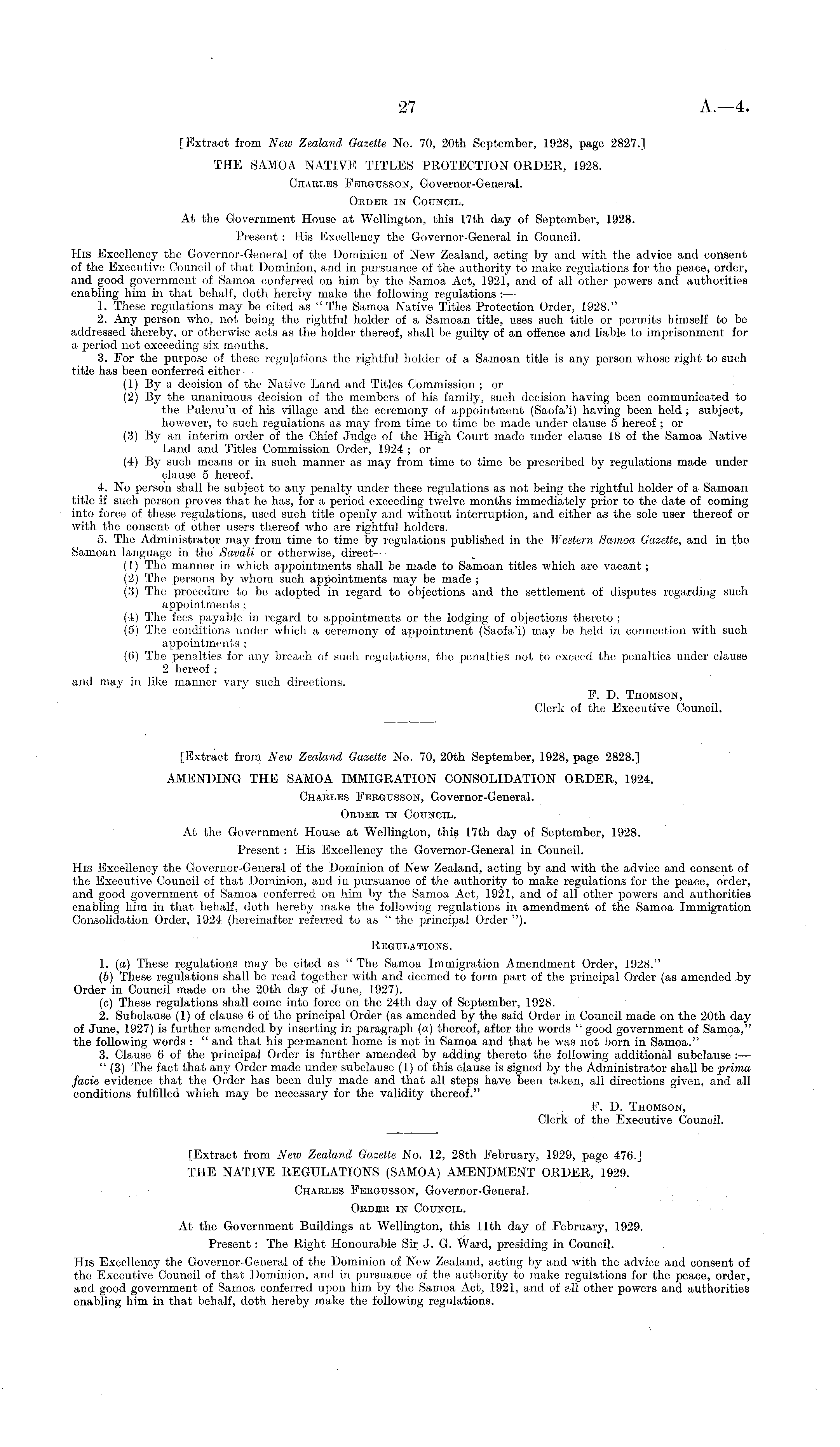 [Extract from New Zealand Gazette No. 70, 20th September, 1928, page 2827.] THE SAMOA NATIVE TITLES PROTECTION ORDER, 1928. Charles Fergusson, Governor-General. Order in Council. At the Government House at Wellington, this 17th day of September, 1928. Present : His Excellency the Governor-General in Council. His Excellency the Governor-General of the Dominion of New Zealand, acting by and with the advice and consent of the Executive Council of tiiat Dominion, and in pursnanoe of the authority to make regulations for the peace, order, and good government of Samoa conferred on him by the Samoa Act, 1921, and of all other powers and authorities enabling him in that behalf, doth hereby make the following regulations : — 1. These regulations may be cited as "The Samoa Native Titles Protection Order, 1928." 2. Any person who, not being the rightful holder of a Samoan title, uses such title or permits himself to be addressed thereby, or otherwise acts as the holder thereof, shall be guilty of an offence and liable to imprisonment for a period not exceeding six months. 3. For the purpose of these regulations the rightful holder of a Samoan title is any person whose right to such title has been conferred either — (1) By a decision of the Native Land and Titles Commission ; or (2) By the unanimous decision of the members of his family, such decision having been communicated to the Pulenu'u of his village and the ceremony of appointment (Saofa'i) having been held ; subject, however, to such regulations as may from time to time be made under clause 5 hereof ; or (3) By an interim order of the Chief Judge of the High Court made under clause 18 of the Samoa Native Land and Titles Commission Order, 1924 ; or (4) By such means or in such manner as may from time to time be prescribed by regulations made under clause 5 hereof. 4. No person shall be subject to any penalty under these regulations as not being the rightful holder of a Samoan title if such person proves that he has, for a period exceeding twelve months immediately prior to the date of coming into force of these regulations, used such title openly and without interruption, and either as the sole user thereof or with the consent of other users thereof who are rightful holders. 5. The Administrator may from time to time by regulations published in the Western Samoa Gazette, and in the Samoan language in the Savali or otherwise, direct— (1) The manner in which appointments shall be made to Samoan titles which are vacant; (2) The persons by whom such appointments may be made ; (3) The procedure to bo adopted in regard to objections and the settlement of disputes regarding such appointments ; (4) The fees payable in regard to appointments or the lodging of objections thereto ; (5) The conditions under which a ceremony of appointment (Saofa'i) may be held in connection with such appointments ; (6) The penalties for any breach of such regulations, the penalties not to exceed the penalties under clause 2 hereof; and may in like manner vary such directions. F. D. Thomson, Clerk of the Executive Council. [Extract from New Zealand Gazette No. 70, 20th September, 1928, page 2828.] AMENDING THE SAMOA IMMIGRATION CONSOLIDATION ORDER, 1924. Charles Fergusson, Governor-General. Order in Council. At the Government House at Wellington, this 17th day of September, 1928. Present: His Excellency the Governor-General in Council. His Excellency the Governor-General of the Dominion of New Zealand, acting by and with the advice and consent of the Executive Council of that Dominion, and in pursuance of the authority to make regulations for the peace, order, and good government of Samoa conferred on him by the Samoa Act, 1921, and of all other powers and authorities enabling him in that behalf, doth hereby make the following regulations in amendment of the Samoa Immigration Consolidation Order, 1924 (hereinafter referred to as " the principal Order "). Regulations. 1. (a) These regulations may be cited as " The Samoa Immigration Amendment Order, 1928." (b) These regulations shall be read together with and deemed to form part of the principal Order (as amended by Order in Council made on the 20th day of June, 1927). (c) These regulations shall come into force on the 24th day of September, 1928. 2. Subclause (1) of clause 6 of the principal Order (as amended by the said Order in Council made on the 20th day of June, 1927) is further amended by inserting in paragraph (a) thereof, after the words " good government of Samoa," the following words : " and that his permanent home is not in Samoa and that he was not born in Samoa." 3. Clause 6 of the principal Order is further amended by adding thereto the following additional subclause : — " (3) The fact that any Order made under subclause (1) of this clause is signed by the Administrator shall be prima facie evidence that the Order has been duly made and that all steps have been taken, all directions given, and all conditions fulfilled which may be necessary for the validity thereof." F. D. Thomson, Clerk of the Executive Council. [Extract from New Zealand Gazette No. 12, 28th February, 1929, page 476.] THE NATIVE REGULATIONS (SAMOA) AMENDMENT ORDER, 1929. Charles Fergusson, Governor-General. Order in Council. At the Government Buildings at Wellington, this 11th day of February, 1929. Present: The Right Honourable Sir J. G. Ward, presiding in Council. His Excellency the Governor-General of the Dominion of New Zealand, acting by and with the advice and consent of the Executive Council of that Dominion, and in pursuance of the authority to make regulations for the peace, order, and good government of Samoa conferred upon him by the Samoa Act, 1921, and of all other powers and authorities enabling him in that behalf, doth hereby make the following regulations.