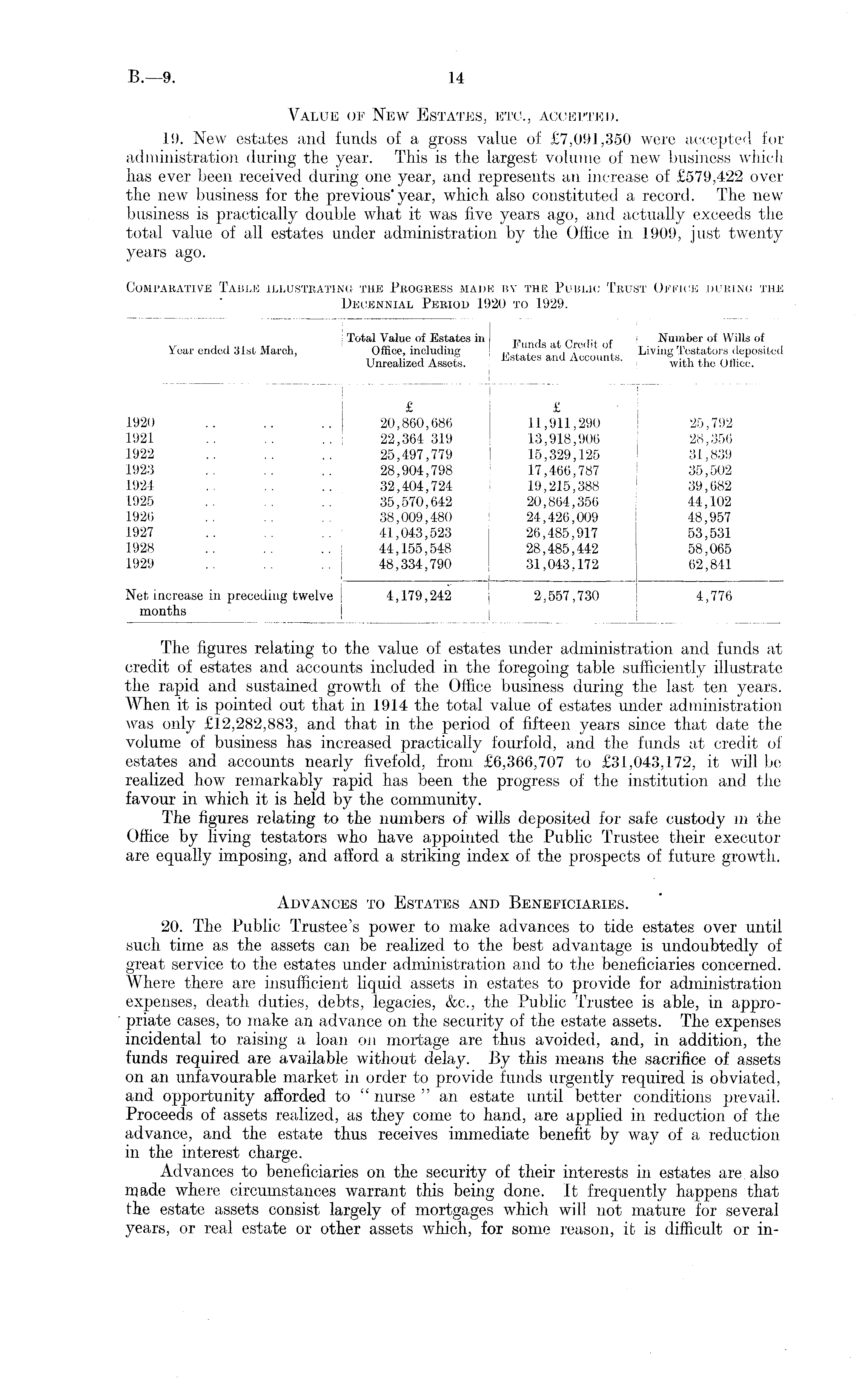 The figures relating to the value of estates under administration and funds at credit of estates and accounts included in the foregoing table sufficiently illustrate the rapid and sustained growth of the Office business during the last ten years. When it is pointed out that in 1914 the total value of estates under administration was only £12,282,883, and that in the period of fifteen years since that date the volume of business has increased practically fourfold, and the funds at credit of estates and accounts nearly fivefold, from £6,366,707 to £31,043,172, it will be realized how remarkably rapid has been the progress of the institution and the favour in which it is held by the community. The figures relating to the numbers of wills deposited for safe custody m the Office by living testators who have appointed the Public Trustee their executor are equally imposing, and afford a striking index of the prospects of future growth. Advances to Estates and Beneficiaries. 20. The Public Trustee's power to make advances to tide estates over until such time as the assets can be realized to the best advantage is undoubtedly of great service to the estates under administration and to the beneficiaries concerned. Where there are insufficient liquid assets in estates to provide for administration expenses, death duties, debts, legacies, &c., the Public Trustee is able, in appropriate cases, to make an advance on the security of the estate assets. The expenses incidental to raising a loan on mortage are thus avoided, and, in addition, the funds required are available without delay. By this means the sacrifice of assets on an unfavourable market in order to provide funds urgently required is obviated, and opportunity afforded to " nurse " an estate until better conditions prevail. Proceeds of assets realized, as they come to hand, are applied in reduction of the advance, and the estate thus receives immediate benefit by way of a reduction in the interest charge. Advances to beneficiaries on the security of their interests in estates are also made where circumstances warrant this being done. It frequently happens that the estate assets consist largely of mortgages which will not mature for several years, or real estate or other assets which, for some reason, it is difficult or in-