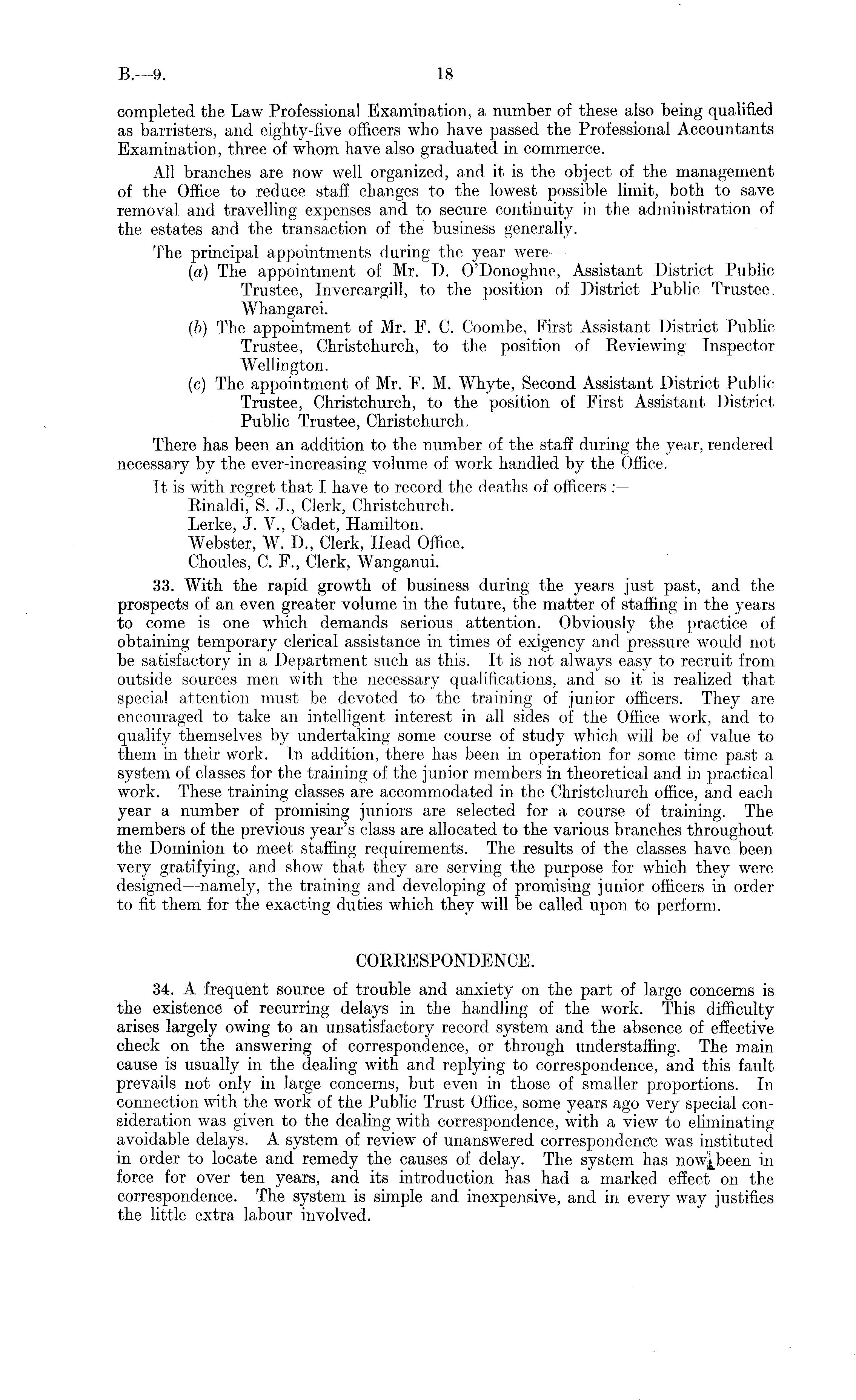 completed the Law Professional Examination, a number of these also being qualified as barristers, and eighty-five officers who have passed the Professional Accountants Examination, three of whom have also graduated in commerce. All branches are now well organized, and it is the object of the management of the Office to reduce staff changes to the lowest possible limit, both to save removal and travelling expenses and to secure continuity in the administration of the estates and the transaction of the business generally. The principal appointments during the year were — (a) The appointment of Mr. D. O'Donoglme, Assistant District Public Trustee, Invercargill, to the position of District Public Trustee. Whangarei. (■b) The appointment of Mr. F. C. Coombe, First Assistant District Public Trustee, Christchurch, to the position of Reviewing Inspector Wellington. (c) The appointment of Mr. F. M. Whyte, Second Assistant District Public Trustee, Christchurch, to the position of First Assistant District Public Trustee, Christchurch, There has been an addition to the number of the staff during the year, rendered necessary by the ever-increasing volume of work handled by the Office. It is with regret that I have to record the deaths of officers : — Rinaldi, S. J., Clerk, Christchurch. Lerke, J. V., Cadet, Hamilton. Webster, W. D., Clerk, Head Office. Choules, C. F., Clerk, Wanganui. 33. With the rapid growth of business during the years just past, and the prospects of an even greater volume in the future, the matter of staffing in the years to come is one which demands serious attention. Obviously the practice of obtaining temporary clerical assistance in times of exigency and pressure would not be satisfactory in a Department such as this. It is not always easy to recruit from outside sources men with the necessary qualifications, and so it is realized that special attention must be devoted to the training of junior officers. They are encouraged to take an intelligent interest in all sides of the Office work, and to qualify themselves by undertaking some course of study which will be of value to them in their work. In addition, there has been in operation for some time past a system of classes for the training of the junior members in theoretical and in practical work. These training classes are accommodated in the Christchurch office, and each year a number of promising juniors are selected for a course of training. The members of the previous year's class are allocated to the various branches throughout the Dominion to meet staffing requirements. The results of the classes have been very gratifying, and show that they are serving the purpose for which they were designed —namely, the training and developing of promising junior officers in order to fit them for the exacting duties which they will be called upon to perform. CORRESPONDENCE. 34. A frequent source of trouble and anxiety on the part of large concerns is the existence of recurring delays in the handling of the work. This difficulty arises largely owing to an unsatisfactory record system and the absence of effective check on the answering of correspondence, or through understaffing. The main cause is usually in the dealing with and replying to correspondence, and this fault prevails not only in large concerns, but even in those of smaller proportions. In connection with the work of the Public Trust Office, some years ago very special consideration was given to the dealing with correspondence, with a view to eliminating avoidable delays. A system of review of unanswered correspondence was instituted in order to locate and remedy the causes of delay. The system has in force for over ten years, and its introduction has had a marked effect on the correspondence. The system is simple and inexpensive, and in every way justifies the little extra labour involved.