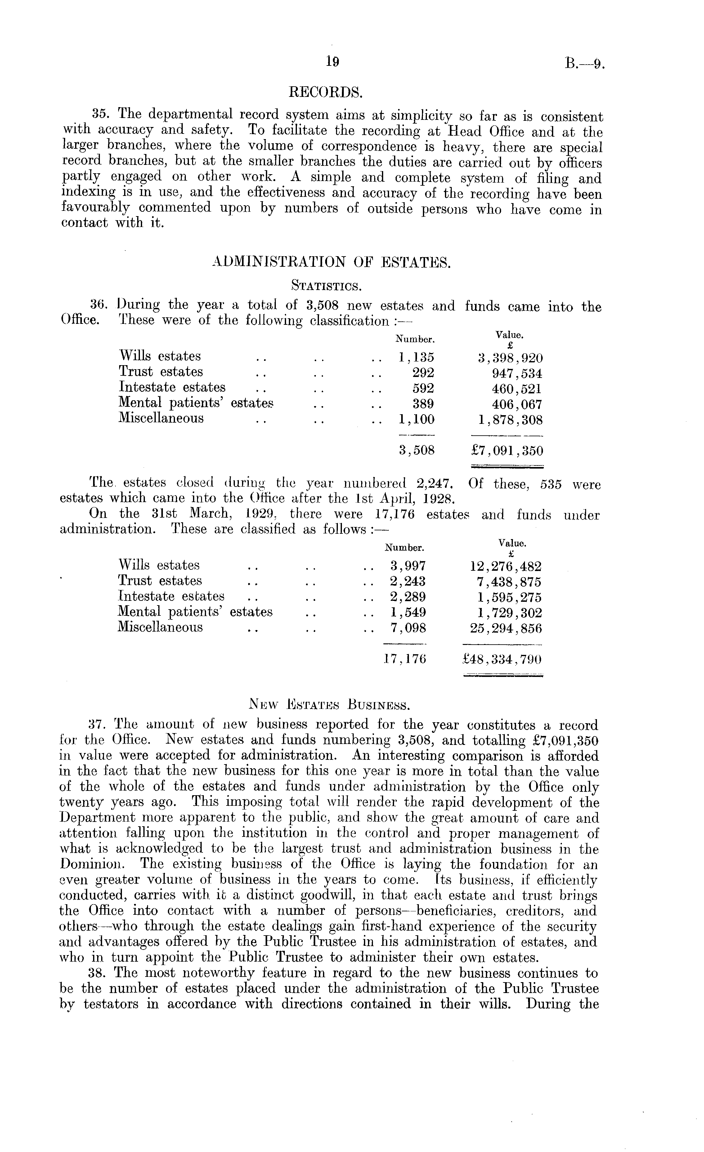 RECORDS. 35. The departmental record system aims at simplicity so far as is consistent with accuracy and safety. To facilitate the recording at Head Office and at the larger branches, where the volume of correspondence is heavy, there are special record branches, but at the smaller branches the duties are carried out by officers partly engaged on other work. A simple and complete system of filing and indexing is in use, and the effectiveness and accuracy of the recording have been favourably commented upon by numbers of outside persons who have come in contact with it. ADMINISTRATION OF ESTATES. Statistics. 36. During the year a total of 3,508 new estates and funds came into the Office. These were of the following classification : — Number. Va^ ue - Wills estates .. .. .. 1,135 3,398,920 Trust estates . . . . . . 292 947,534 Intestate estates . . . . . . 592 460,521 Mental patients' estates .. . . 389 406,067 Miscellaneous .. .. .. 1,100 1,878,308 3,508 £7,091,350 The. estates closed during the year numbered 2,247. Of these, 535 were estates which came into the Office after the Ist April, 1928. On the 31st March, 1929, there were 17,176 estates and funds under administration. These are classified as follows : — Number. Va £ ue " Wills estates .. .. .. 3,997 12,276,482 Trust estates .. .. .. 2,243 7,438,875 Intestate estates .. .. .. 2,289 1,595,275 Mental patients' estates .. . . 1,549 1,729,302 Miscellaneous .. .. .. 7,098 25,294,856 17,176 £48,334,790 New Estates Business. 37. The amount of new business reported for the year constitutes a record for the Office. New estates and funds numbering 3,508, and totalling £7,091,350 in value were accepted for administration. An interesting comparison is afforded in the fact that the new business for this one year is more in total than the value of the whole of the estates and funds under administration by the Office only twenty years ago. This imposing total will render the rapid development of the Department more apparent to the public, and show the great amount of care and attention falling upon the institution in the control and proper management of what is acknowledged to be the largest trust and administration business in the Dominion. The existing business of the Office is laying the foundation for an even greater volume of business in the years to come. Its business, if efficiently conducted, carries with it a distinct goodwill, in that each estate and trust brings the Office into contact with a number of persons —beneficiaries, creditors, and others —who through the estate dealings gain first-hand experience of the security and advantages offered by the Public Trustee in his administration of estates, and who in turn appoint the Public Trustee to administer their own estates. 38. The most noteworthy feature in regard to the new business continues to be the number of estates placed under the administration of the Public Trustee by testators in accordance with directions contained in their wills. During the