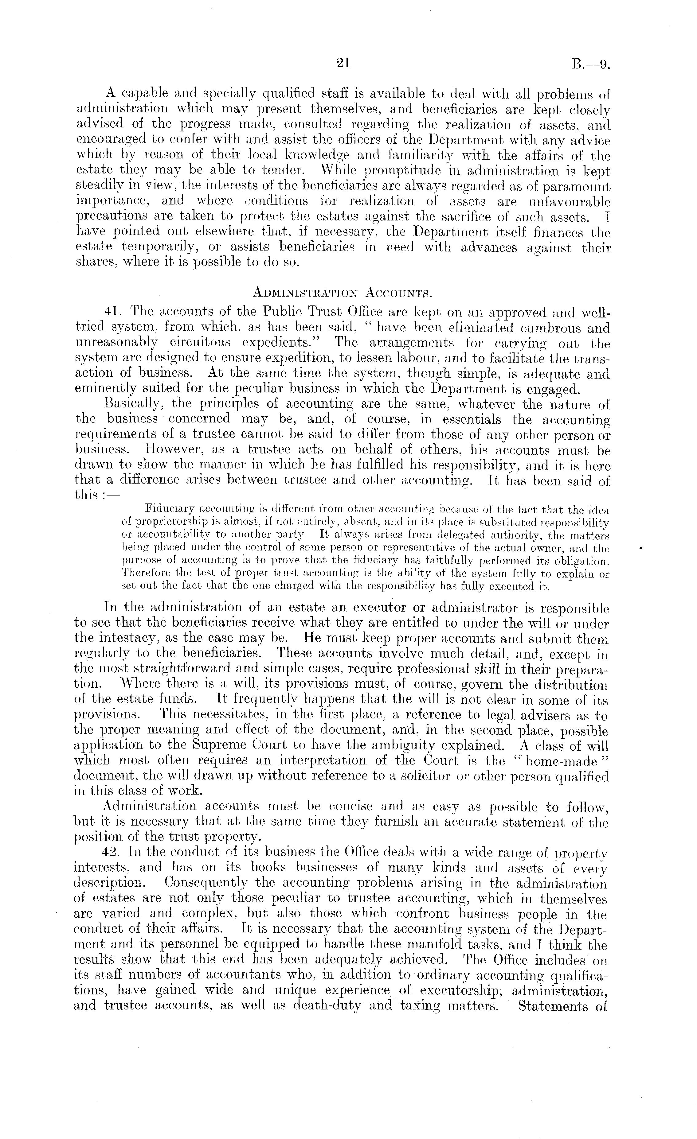 A capable and specially qualified staff is available to deal with all problems of administration which may present themselves, and beneficiaries are kept closely advised of the progress made, consulted regarding the realization of assets, and encouraged to confer with and assist the officers of the Department with any advice which by reason of their local knowledge and familiarity with the affairs of the estate they may be able to tender. While promptitude in administration is kept steadily in View, the interests of the beneficiaries are always regarded as of paramount importance, and where conditions for realization of assets are unfavourable precautions are taken to protect the estates against the sacrifice of such assets. 1 have pointed out elsewhere that, if necessary, the Department itself finances the estate temporarily, or assists beneficiaries in need with advances against their shares, where it is possible to do so. Administration Accounts. 41. The accounts of the Public Trust Office are kept on an approved and welltried system, from, which, as has been said, " have been eliminated cumbrous and unreasonably circuitous expedients." The arrangements for carrying out the system are designed to ensure expedition, to lessen labour, and to facilitate the transaction of business. At the same time the system, though simple, is adequate and eminently suited for the peculiar business in which the Department is engaged. Basically, the principles of accounting are the same, whatever the nature of the business concerned may be, and, of course, in essentials the accounting requirements of a trustee cannot be said to differ from those of any other person or business. However, as a trustee acts on behalf of others, his accounts must be drawn to show the manner in which he has fulfilled his responsibility, and it is here that a difference arises between trustee and other accounting. Tt has been said of this :— Fiduciary accounting is different from other accounting because of the fact that the idea of proprietorship is almost, if not entirely, absent, and in its place is substituted responsibility or accountability to another party. It always arises from delegated authority, the matters being placed under the control of some person or representative of the actual owner, and the purpose of accounting is to prove that the fiduciary has faithfully performed its obligation. Therefore the test of proper trust accounting is the ability of the system fully to explain or set out the fact that the one charged with the responsibility has full v executed it. In the administration of an estate an executor or administrator is responsible to see that the beneficiaries receive what they are entitled to under the will or under the intestacy, as the case may be. He must keep proper accounts and submit them regularly to the beneficiaries. These accounts involve much detail, and, except in the most straightforward and simple cases, require professional skill in their preparation. AVhere there is a will, its provisions must, of course, govern the distribution of the estate funds. It frequently happens that the will is not clear in some of its provisions. This necessitates, in the first place, a reference to legal advisers as to the proper meaning and effect of the document, and, in the second place, possible application to the Supreme Court to have the ambiguity explained. A class of will which most often requires an interpretation of the Court is the ""home-made" document, the will drawn up without reference to a solicitor or other person qualified in this class of work. Administration accounts must be concise and as easy as possible to follow, but it is necessary that at the same time they furnish an accurate statement of the position of the trust property. 42. In the conduct of its business the Office deals with a wide range of property interests, and has on its books businesses of many kinds and assets of every description. Consequently the accounting problems arising in the administration of estates are not only those peculiar to trustee accounting, which in themselves are varied and complex, but also those which confront business people in the conduct of their affairs. It is necessary that the accounting system of the Department and its personnel be equipped to handle these manifold tasks, and I think the results show that this end has been adequately achieved. The Office includes on its staff numbers of accountants who, in addition to ordinary accounting qualifications, have gained wide and unique experience of executorship, administration, and trustee accounts, as well as death-duty and taxing matters. Statements of