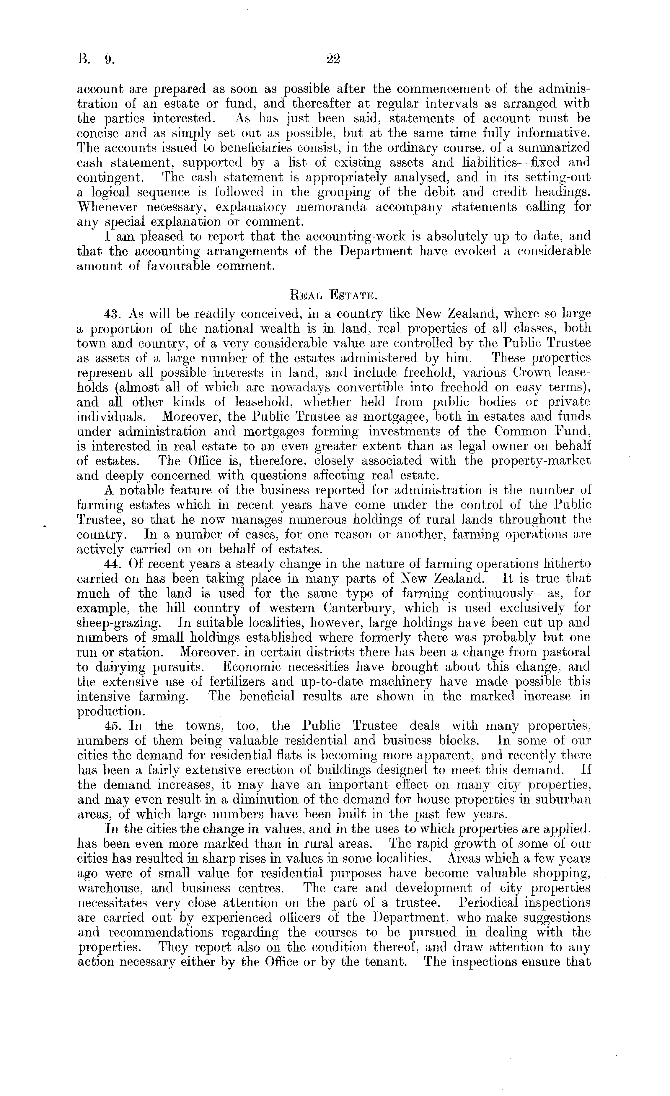 account are prepared as soon as possible after the commencement of the administration of an estate or fund, and thereafter at regular intervals as arranged with the parties interested. As has just been said, statements of account must be concise and as simply set out as possible, but at the same time fully informative. The accounts issued to beneficiaries consist, in the ordinary course, of a summarized cash statement, supported by a list of existing assets and liabilities—fixed and contingent. The cash statement is appropriately analysed, and in its setting-out a logical sequence is followed in the grouping of the debit and credit headings. Whenever necessary, explanatory memoranda accompany statements calling for any special explanation or comment. I am pleased to report that the accounting-work is absolutely up to date, and that the accounting arrangements of the Department have evoked a considerable amount of favourable comment. Real Estate. 43. As will be readily conceived, in a country like New Zealand, where so large a proportion of the national wealth is in land, real properties of all classes, both town and country, of a very considerable value are controlled by the Public Trustee as assets of a large number of the estates administered by him. These properties represent all possible interests in land, and include freehold, various Crown leaseholds (almost all of which are nowadays convertible into freehold on easy terms), and all other kinds of leasehold, whether held from public bodies or private individuals. Moreover, the Public Trustee as mortgagee, both in estates and funds under administration and mortgages forming investments of the Common Fund, is interested in real estate to an even greater extent than as legal owner 011 behalf of estates. The Office is, therefore, closely associated with the property-market and deeply concerned with questions affecting real estate. A notable feature of the business reported for administration is the number of farming estates which in recent years have come under the control of the Public Trustee, so that he now manages numerous holdings of rural lands throughout the country. In a number of cases, for one reason or another, farming operations are actively carried on on behalf of estates. 44. Of recent years a steady change in the nature of farming operations hitherto carried on has been taking place in many parts of New Zealand. It is true that much of the land is used for the same type of farming continuously —as, for example, the hill country of western Canterbury, which is used exclusively for sheep-grazing. In suitable localities, however, large holdings have been cut up and numbers of small holdings established where formerly there was probably but one run or station. Moreover, in certain districts there has been a change from pastoral to dairying pursuits. Economic necessities have brought about this change, and the extensive use of fertilizers and up-to-date machinery have made possible this intensive farming. The beneficial results are shown in the marked increase in production. 45. In the towns, too, the Public Trustee deals with many properties, numbers of them being valuable residential and business blocks. In some of our cities the demand for residential flats is becoming more apparent, and recently there has been a fairly extensive erection of buildings designed to meet this demand. If the demand increases, it may have an important effect 011 many city properties, and may even result in a diminution of the demand for house properties in suburban areas, of which large numbers have been built in the past few years. In the cities the change in values, and in the uses to which properties are applied, has been even more marked than in rural areas. The rapid growth of some of our cities has resulted in sharp rises in values in some localities. Areas which a few years ago were of small value for residential purposes have become valuable shopping, warehouse, and business centres. The care and development of city properties necessitates very close attention 011 the part of a trustee. Periodical inspections are carried out by experienced officers of the Department, who make suggestions and recommendations regarding the courses to be pursued in dealing with the properties. They report also on the condition thereof, and draw attention to any action necessary either by the Office or by the tenant. The inspections ensure that