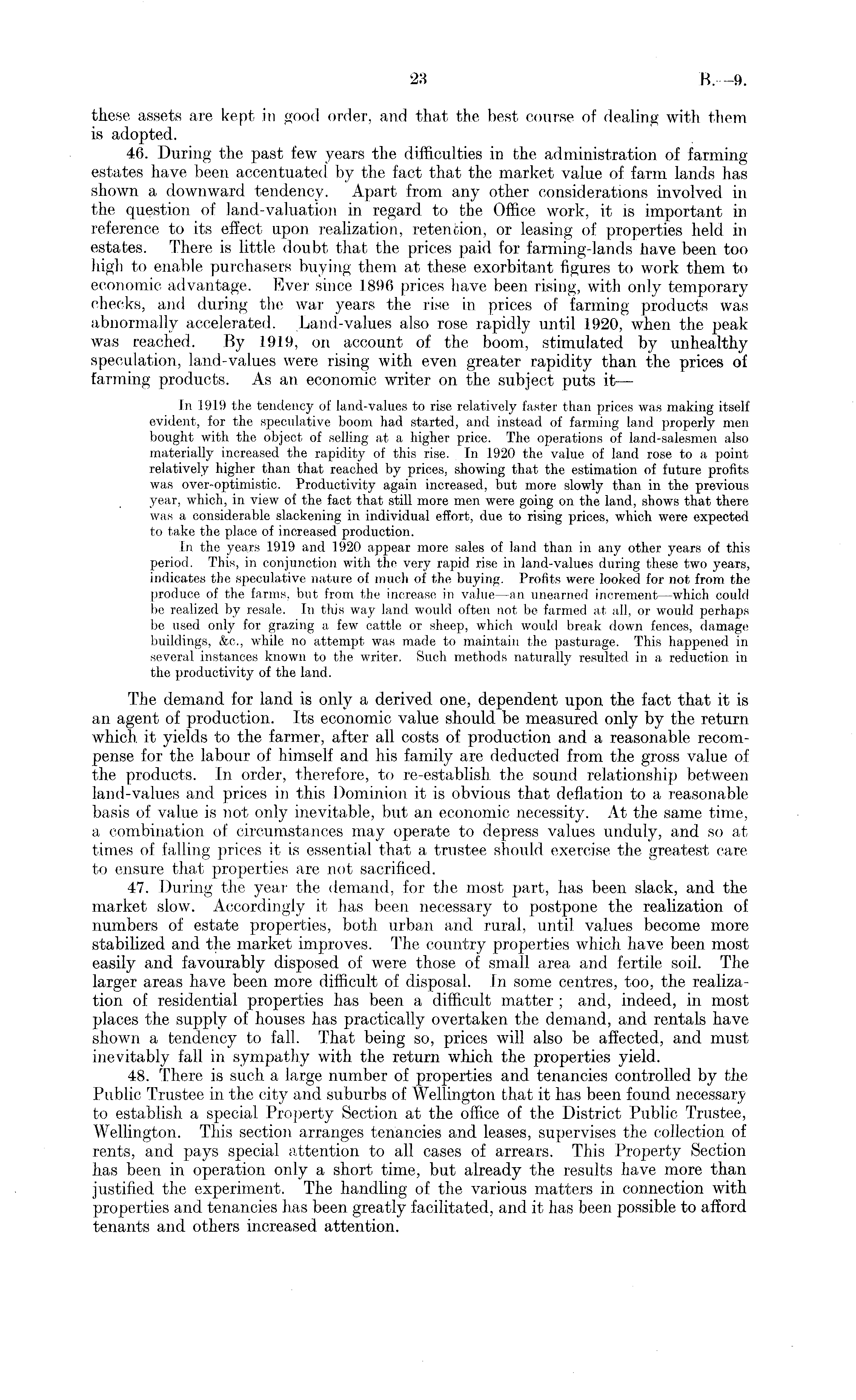 these assets are kept in good order, and that the best course of dealing with them is adopted. 46. During the past few years the difficulties in the administration of farmingestates have been accentuated by the fact that the market value of farm lands has shown a downward tendency. Apart from any other considerations involved in the question of land-valuation in regard to the Office work, it is important in reference to its effect upon realization, retention, or leasing of properties held in estates. There is little doubt that the prices paid for farming-lands have been too high to enable purchasers buying them at these exorbitant figures to work them to economic advantage. Ever since 1896 prices have been rising, with only temporary checks, and during the war years the rise in prices of farming products was abnormally accelerated. Land-values also rose rapidly until 1920, when the peak was reached. By 1919, on account of the boom, stimulated by unhealthy speculation, land-values were rising with even greater rapidity than the prices of farming products. As an economic writer on the subject puts it— In 1919 the tendency of land-values to rise relatively faster than prices was making itself evident, for the speculative boom had started, and instead of farming land properly men bought with the object of selling at a higher price. The operations of land-salesmen also materially increased the rapidity of this rise. In 1920 the value of land rose to a point relatively higher than that reached by prices, showing that the estimation of future profits was over-optimistic. Productivity again increased, but more slowly than in the previous year, which, in view of the fact that still more men were going on the land, shows that there was a considerable slackening in individual effort, due to rising prices, which were expected to take the place of increased production. In the years 1919 and 1920 appear more sales of land than in any other years of this period. This, in conjunction with the very rapid rise in land-values during these two years, indicates the speculative nature of much of the buying. Profits were looked for not from the produce of the farms, but from the increase in value —an unearned increment—which could be realized by resale. In this way land would often not be farmed at all, or would perhaps be used only for grazing a few cattle or sheep, which would break down fences, damage buildings, &c., while no attempt was made to maintain the pasturage. This happened in several instances known to the writer. Such methods naturally resulted in a reduction in the productivity of the land . The demand for land is only a derived one, dependent upon the fact that it is an agent of production. Its economic value should be measured only by the return which it yields to the farmer, after all costs of production and a reasonable recompense for the labour of himself and his family are deducted from the gross value of the products. In order, therefore, to re-establish the sound relationship between land-values and prices in this Dominion it is obvious that deflation to a reasonable basis of value is not only inevitable, but an economic necessity. At the same time, a combination of circumstances may operate to depress values unduly, and so at times of falling prices it is essential that a trustee should exercise the greatest care to ensure that properties are not sacrificed. 47. During the year the demand, for the most part, has been slack, and the market slow. Accordingly it has been necessary to postpone the realization of numbers of estate properties, both urban and rural, until values become more stabilized and the market improves. The country properties which have been most easily and favourably disposed of were those of small area and fertile soil. The larger areas have been more difficult of disposal. In some centres, too, the realization of residential properties has been a difficult matter ; and, indeed, in most places the supply of houses has practically overtaken the demand, and rentals have shown a tendency to fall. That being so, prices will also be affected, and must inevitably fall in sympathy with the return which the properties yield. 48. There is such a large number of properties and tenancies controlled by the Public Trustee in the city and suburbs of Wellington that it has been found necessary to establish a special Property Section at the office of the District Public Trustee, Wellington. This section arranges tenancies and leases, supervises the collection of rents, and pays special attention to all cases of arrears. This Property Section has been in operation only a short time, but already the results have more than justified the experiment. The handling of the various matters in connection with properties and tenancies has been greatly facilitated, and it has been possible to afford tenants and others increased attention.