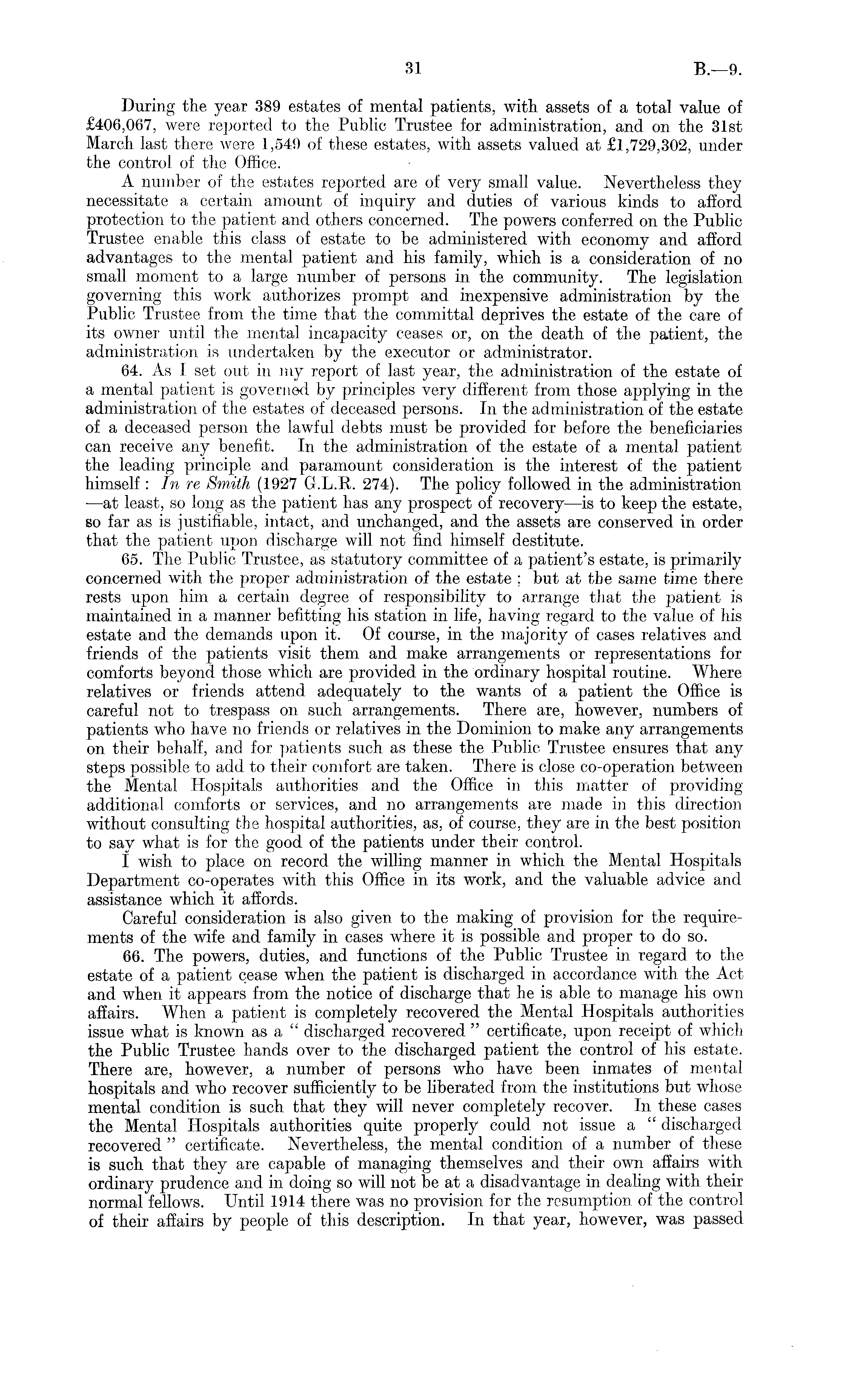 During the year 389 estates of mental patients, with assets of a total value of £406,067, were reported to the Public Trustee for administration, and on the 31st March last there were 1,54!) of these estates, with assets valued at £1,729,302, under the control of the Office. A number of the estates reported are of very small value. Nevertheless they necessitate a certain amount of inquiry and duties of various kinds to afford protection to the patient and others concerned. The powers conferred on the Public Trustee enable this class of estate to be administered with economy and afford advantages to the mental patient and his family, which is a consideration of no small moment to a large number of persons in the community. The legislation governing this work authorizes prompt and inexpensive administration by the Public Trustee from the time that the committal deprives the estate of the care of its owner until the mental incapacity ceases or, on the death of the patient, the administration is undertaken by the executor or administrator. 64. As I set out in my report of last year, the administration of the estate of a mental patient is governed by principles very different from those applying in the administration of the estates of deceased persons. In the administration of the estate of a deceased person the lawful debts must be provided for before the beneficiaries can receive any benefit. In the administration of the estate of a mental patient the leading principle and paramount consideration is the interest of the patient himself: In re Smith (1927 G.L.R. 274). The policy followed in the administration -—at least, so long as the patient has any prospect of recovery —is to keep the estate, so far as is justifiable, intact, and unchanged, and the assets are conserved in order that the patient upon discharge will not find himself destitute. 65. The Public Trustee, as statutory committee of a patient's estate, is primarily concerned with the proper administration of the estate ; but at the same time there rests upon him a certain degree of responsibility to arrange that the patient is maintained in a manner befitting his station in life, having regard to the value of his estate and the demands upon it. Of course, in the majority of cases relatives and friends of the patients visit them and make arrangements or representations for comforts beyond those which are provided in the ordinary hospital routine. Where relatives or friends attend adequately to the wants of a patient the Office is careful not to trespass on such arrangements. There are, however, numbers of patients who have no friends or relatives in the Dominion to make any arrangements on their behalf, and for patients such as these the Public Trustee ensures that any steps possible to add to their comfort are taken. There is close co-operation between the Mental Hospitals authorities and the Office in this matter of providing additional comforts or services, and no arrangements are made in this direction without consulting the hospital authorities, as, of course, they are in the best position to say what is for the good of the patients under their control. I wish to place on record the willing manner in which the Mental Hospitals Department co-operates with this Office in its work, and the valuable advice and assistance which it affords. Careful consideration is also given to the making of provision for the requirements of the wife and family in cases where it is possible and proper to do so. 66. The powers, duties, and functions of the Public Trustee in regard to the estate of a patient cease when the patient is discharged in accordance with the Act and when it appears from the notice of discharge that he is able to manage his own affairs. When a patient is completely recovered the Mental Hospitals authorities issue what is known as a " discharged recovered " certificate, upon receipt of which the Public Trustee hands over to the discharged patient the control of his estate. There are, however, a number of persons who have been inmates of mental hospitals and who recover sufficiently to be liberated from the institutions but whose mental condition is such that they will never completely recover. In these cases the Mental Hospitals authorities quite properly could not issue a " discharged recovered " certificate. Nevertheless, the mental condition of a number of these is such that they are capable of managing themselves and their own affairs with ordinary prudence and in doing so will not be at a disadvantage in dealing with their normal fellows. Until 1914 there was no provision for the resumption of the control of their affairs by people of this description. In that year, however, was passed