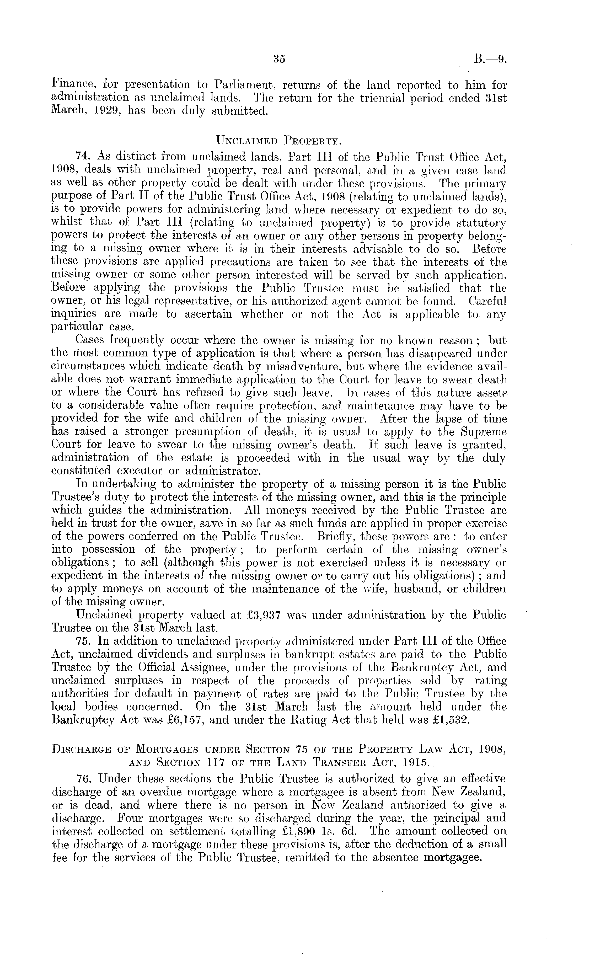 Finance, for presentation to Parliament, returns of tlie land reported to him for administration as unclaimed lands. The return for the triennial period ended 31st March, 1929, has been duly submitted. Unclaimed Property. 74. As distinct from unclaimed lands, Part 111 of the Public Trust Office Act, 1908, deals with unclaimed property, real and personal, and in a given case land as well as other property could be dealt with under these provisions. The primary purpose of Part II of the Public Trust Office Act, 1908 (relating to unclaimed lands), is to provide powers for administering land where necessary or expedient to do so, whilst that of Part 111 (relating to unclaimed property) is to provide statutory powers to protect the interests of an owner or any other persons in property belonging to a missing owner where it is in their interests advisable to do so. Before these provisions are applied precautions are taken to see that the interests of the missing owner or some other person interested will be served by such application. Before applying the provisions the Public Trustee must be satisfied that the owner, or his legal representative, or his authorized agent cannot be found. Careful inquiries are made to ascertain whether or not the Act is applicable to any particular case. Cases frequently occur where the owner is missing for no known reason ; but the most common type of application is that where a person has disappeared under circumstances which indicate death by misadventure, but where the evidence available does not warrant immediate application to the Court for leave to swear death or where the Court has refused to give such leave. In cases of this nature assets to a considerable value often require protection, and maintenance may have to be provided for the wife and children of the missing owner. After the lapse of time has raised a stronger presumption of death, it is usual to apply to the Supreme Court for leave to swear to the missing owner's death. If such leave is granted, administration of the estate is proceeded with in the usual way by the duly constituted executor or administrator. In undertaking to administer the property of a missing person it is the Public Trustee's duty to protect the interests of the missing owner, and this is the principle which guides the administration. All moneys received by the Public Trustee are held in trust for the owner, save in so far as such funds are applied in proper exercise of the powers conferred on the Public Trustee. Briefly, these powers are : to enter into possession of the property; to perform certain of the missing owner's obligations ; to sell (although this power is not exercised unless it is necessary or expedient in the interests of the missing owner or to carry out his obligations) ; and to apply moneys on account of the maintenance of the wife, husband, or children of the missing owner. Unclaimed property valued at £3,937 was under administration by the Public Trustee on the 31st March last. 75. In addition to unclaimed property administered under Part 111 of the Office Act, unclaimed dividends and surpluses in bankrupt estates are paid to the Public Trustee by the Official Assignee, under the provisions of the Bankruptcy Act, and unclaimed surpluses in respect of the proceeds of properties sold by rating authorities for default in payment of rates are paid to the Public Trustee by the local bodies concerned. On the 31st March last the amount held under the Bankruptcy Act was £6,157, and under the Rating Act that held was £1,532. Discharge of Mortgages under Section 75 of the Property Law Act, 1908, and Section 117 of the Land Transfer Act, 1915. 76. Under these sections the Public Trustee is authorized to give an effective discharge of an overdue mortgage where a mortgagee is absent from New Zealand, or is dead, and where there is no person in New Zealand authorized to give a discharge. Four mortgages were so discharged during the year, the principal and interest collected on settlement totalling £1,890 Is. 6d. The amount collected on the discharge of a mortgage under these provisions is, after the deduction of a small fee for the services of the Public Trustee, remitted to the absentee mortgagee.