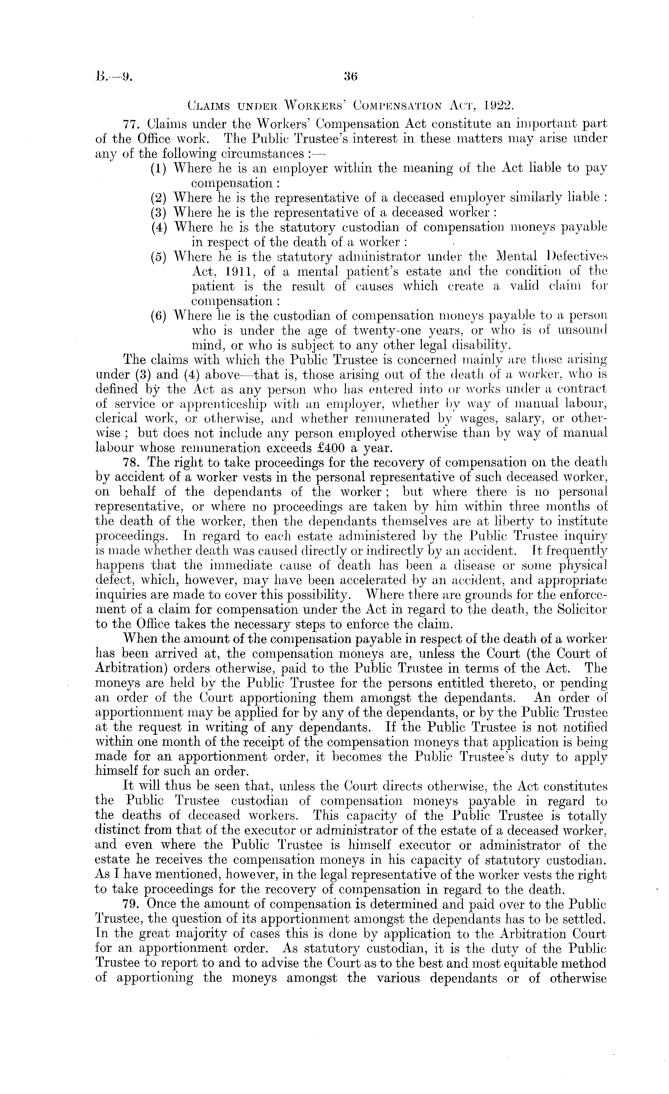 Claims under Workers' Compensation Act, 1922. 77. Claims under the Workers' Compensation Act constitute an important part of the Office work. The Public Trustee's interest in these matters may arise under any of the following circumstances : — (1) Where he is an employer within the meaning of the Act liable to pay compensation : (2) Where lie is the representative of a deceased employer similarly liable : (3) Where he is the representative of a deceased worker : (4) Where he is the statutory custodian of compensation moneys payable in respect of the death of a worker : (5) Where he is the statutory administrator under the Mental Defectives Act, 1911, of a mental patient's estate and the condition of the patient is the result of causes which create a valid claim for compensation : (6) Where he is the custodian of compensation moneys payable to a person who is under the age of twenty-one years, or who is of unsound mind, or who is subject to any other legal disability. The claims with which the Public Trustee is concerned mainly are those arising under (3) and (4) above —that is, those arising out of the death of a worker, who is defined by the Act as any person who has entered into or works under a contract of service or apprenticeship with an employer, whether by way of manual labour, clerical work, or otherwise, and whether remunerated by wages, salary, or otherwise ; but does not include any person employed otherwise than by way of manual labour whose remuneration exceeds £400 a year. 78. The right to take proceedings for the recovery of compensation on the death by accident of a worker vests in the personal representative of such deceased worker, on behalf of the dependants of the worker ; but where there is no personal representative, or where no proceedings are taken by him within three months of the death of the worker, then the dependants themselves are at liberty to institute proceedings. In regard to each estate administered by the Public Trustee inquiry is made whether death was caused directly or indirectly by an accident. Tt frequently happens that the immediate cause of death has been a disease or some physical defect, which, however, may have been accelerated by an accident, and appropriate inquiries are made to cover this possibility. Where there are grounds for the enforcement of a claim for compensation under the Act in regard to the death, the Solicitor to the Office takes the necessary steps to enforce the claim. When the amount of the compensation payable in respect of the death of a worker has been arrived at, the compensation moneys are, unless the Court (the Court of Arbitration) orders otherwise, paid to the Public Trustee in terms of the Act. The moneys are held by the Public Trustee for the persons entitled thereto, or pending an order of the Court apportioning them amongst the dependants. An order of apportionment may be applied for by any of the dependants, or by the Public Trustee at the request in writing of any dependants. If the Public Trustee is not notified within one month of the receipt of the compensation moneys that application is being made for an apportionment order, it becomes the Public Trustee's duty to apply himself for such an order. It will thus be seen that, unless the Court directs otherwise, the Act constitutes the Public Trustee custodian of compensation moneys payable in regard to the deaths of deceased workers. This capacity of the Public Trustee is totally distinct from that of the executor or administrator of the estate of a deceased worker, and even where the Public Trustee is himself executor or administrator of the estate he receives the compensation moneys in his capacity of statutory custodian. As I have mentioned, however, in the legal representative of the worker vests the right to take proceedings for the recovery of compensation in regard to the death. 79. Once the amount of compensation is determined and paid over to the Public Trustee, the question of its apportionment amongst the dependants has to be settled. In the great majority of cases this is done by application to the Arbitration Court for an apportionment order. As statutory custodian, it is the duty of the Public Trustee to report to and to advise the Court as to the best and most equitable method of apportioning the moneys amongst the various dependants or of otherwise