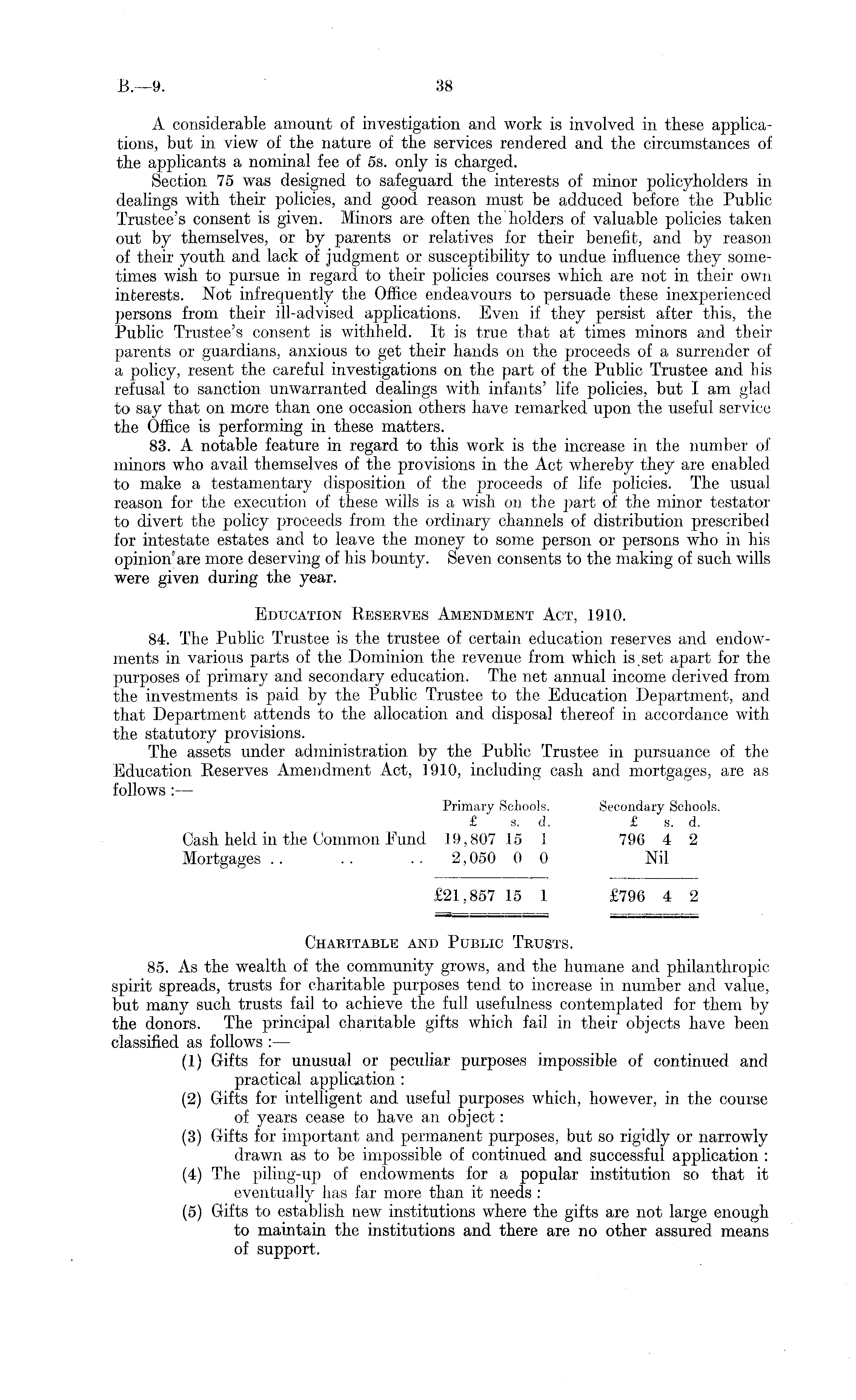 A considerable amount of investigation and work is involved in these applications, but in view of the nature of the services rendered and the circumstances of the applicants a nominal fee of ss. only is charged. Section 75 was designed to safeguard the interests of minor policyholders in dealings with their policies, and good reason must be adduced before the Public Trustee's consent is given. Minors are- often the holders of valuable policies taken out by themselves, or by parents or relatives for their benefit, and by reason of their youth and lack of judgment or susceptibility to undue influence they sometimes wish to pursue in regard to their policies courses which are not in their own interests. Not infrequently the Office endeavours to persuade these inexperienced persons from their ill-advised applications. Even if they persist after this, the Public Trustee's consent is withheld. It is true that at times minors and their parents or guardians, anxious to get their hands on the proceeds of a surrender of a policy, resent the careful investigations on the part of the Public Trustee and his refusal to sanction unwarranted dealings with infants' life policies, but I am glad to say that on more than one occasion others have remarked upon the useful service the Office is performing in these matters. 83. A notable feature in regard to this work is the increase in the number of minors who avail themselves of the provisions in the Act whereby they are enabled to make a testamentary disposition of the proceeds of life policies. The usual reason for the execution of these wills is a wish on the j>art of the minor testator to divert the policy proceeds from the ordinary channels of distribution prescribed for intestate estates and to leave the money to some person or persons who in his opinion*are more deserving of his bounty. Seven consents to the making of such wills were given during the year. Education Reserves Amendment Act, 1910. 84. The Public Trustee is the trustee of certain education reserves and endowments in various parts of the Dominion the revenue from which is set apart for the purposes of primary and secondary education. The net annual income derived from the investments is paid by the Public Trustee to the Education Department, and that Department attends to the allocation and disposal thereof in accordance with the statutory provisions. The assets under administration by the Public Trustee in pursuance of the Education Reserves Amendment Act, 1910, including cash and mortgages, are as follows : — Primary Schools. Secondary Schools. £ s. d. £ s. d. Cash held in the Common Eund 19,807 15 1 796 4 2 Mortgages .. .. .. 2,050 0 0 Nil £21,857 15 1 £796 4 2 Charitable and Public Trusts. 85. As the wealth of the community grows, and the humane and philanthropic spirit spreads, trusts for charitable purposes tend to increase in number and value, but many such trusts fail to achieve the full usefulness contemplated for them by the donors. The principal charitable gifts which fail in their objects have been classified as follows : — (1) Gifts for unusual or peculiar purposes impossible of continued and practical application: (2) Gifts for intelligent and useful purposes which, however, in the course of years cease to have an object: (3) Gifts for important and permanent purposes, but so rigidly or narrowly drawn as to be impossible of continued and successful application : (4) The piling-up of endowments for a popular institution so that it eventually has far more than it needs : (5) Gifts to establish new institutions where the gifts are not large enough to maintain the institutions and there are no other assured means of support.