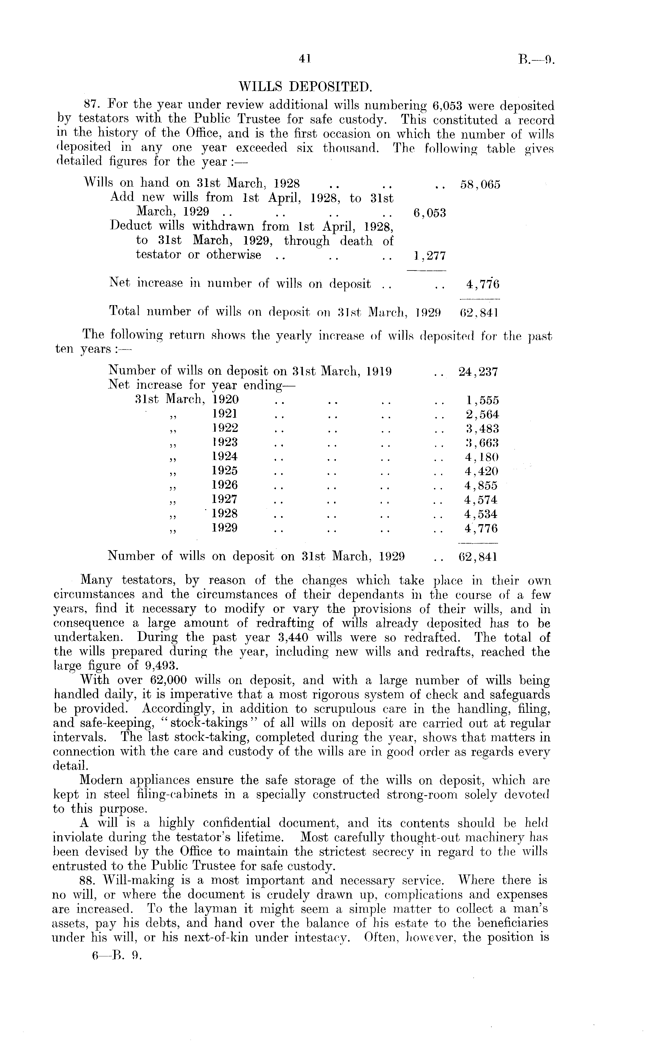 WILLS DEPOSITED. 87. For the year under review additional wills numbering 6,053 were deposited by testators with the Public Trustee for safe custody. This constituted a record in the history of the Office, and is the first occasion on which the number of wills deposited in any one year exceeded six thousand. The following table gives detailed figures for the year : — Wills on hand on 31st March, 1928 .. .. .. 58,065 Add new wills from Ist April, 1928, to 31st March, 1929 .. .. .. .. 6,053 Deduct wills withdrawn from Ist April, 1928, to 31st March, 1929, through death of testator or otherwise .. .. .. I , 277 Net increase in number of wills on deposit . . . . 4,776 Total number of wills on deposit on 31st March, 1929 62,841 The following return shows the yearly increase of wills deposited for the past ten years : — Number of wills on deposit on 31st March, 1919 . . 24,237 Net increase for year ending— 31st March, 1920 .. .. .. .. 1,555 192] .. .. .. .. 2,564 1922 .. .. .. .. 3,483 1923 .. .. .. .. 3,663 1924 .. .. .. .. 4,180 1925 .. .. .. .. 4,420 1926 .. .. .. .. 4,855 1927 .. .. .. .. 4,574 1928 .. .. .. .. 4,534 1929 .. .. .. .. 4,776 Number of wills on deposit on 31st March, 1929 .. 62,841 Many testators, by reason of the changes which take place in their own circimistances and the circumstances of their dependants in the course of a few years, find it necessary to modify or vary the provisions of their wills, and in consequence a large amount of redrafting of wills already deposited has to be undertaken. During the past year 3,440 wills were so redrafted. The total of the wills prepared during the year, including new wills and redrafts, reached the large figure of 9,493. With over 62,000 wills on deposit, and with a large number of wills being handled daily, it is imperative that a most rigorous system of check and safeguards he provided. Accordingly, in addition to scrupulous care in the handling, filing, and safe-keeping, "stock-takings" of all wills on deposit are carried out at regular intervals. The last stock-taking, completed during the year, shows that matters in connection with the care and custody of the wills are in good order as regards every detail. Modern appliances ensure the safe storage of the wills on deposit, which are kept in steel filing-cabinets in a specially constructed strong-room solely devoted to this purpose. A will is a highly confidential document, and its contents should be held inviolate during the testator's lifetime. Most carefully thought-out machinery has been devised by the Office to maintain the strictest secrecy in regard to the wills entrusted to the Public Trustee for safe custody. 88. Will-making is a most important and necessary service. Where there is no will, or where the document is crudely drawn up, complications and expenses are increased. To the layman it might seem a simple matter to collect a man's assets, pay his debts, and hand over the balance of his estate to the beneficiaries under his will, or his next-of-kin under intestacy. Often, however, the position is