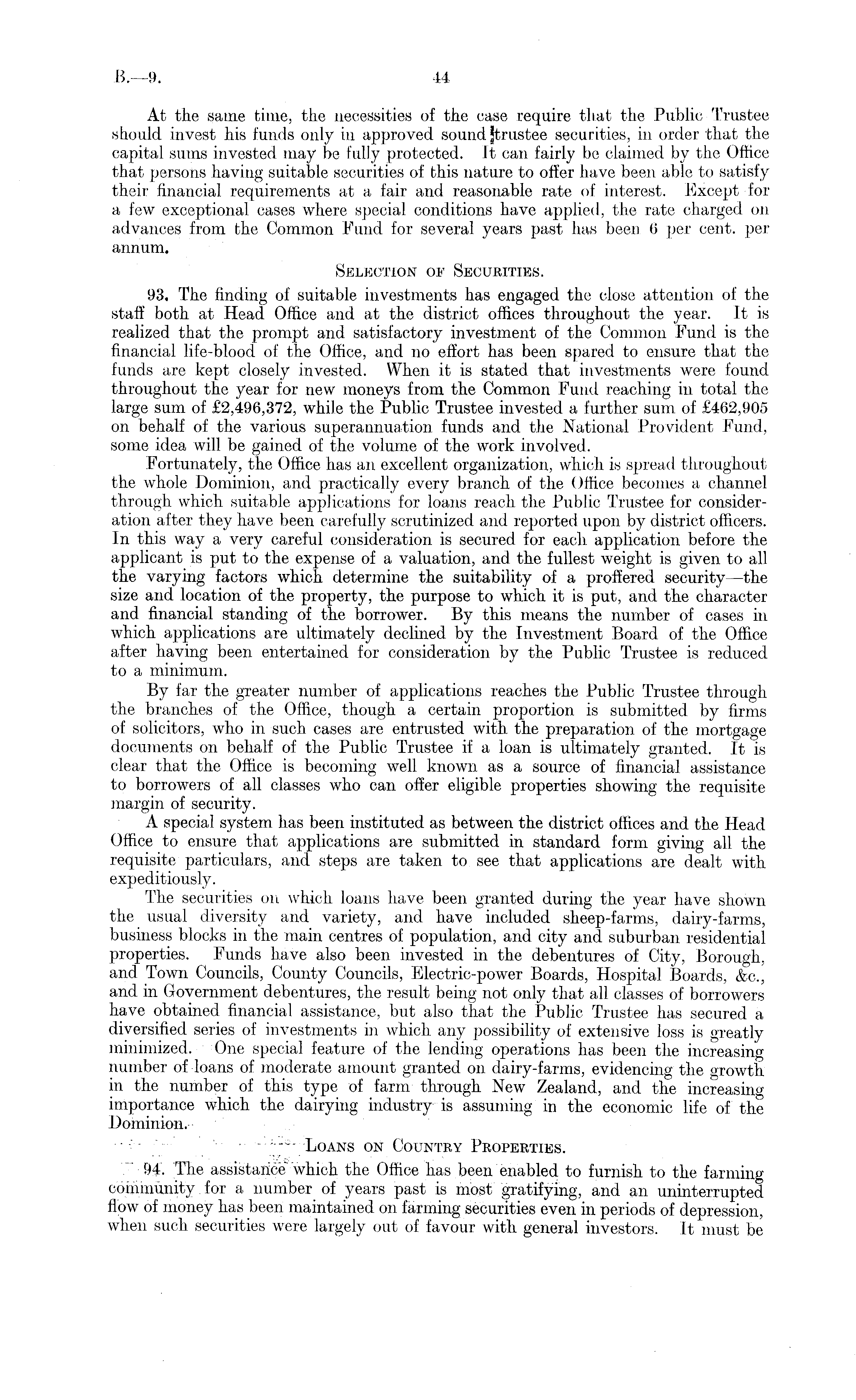 At the same time, the necessities of the case require that the Public Trustee should invest his funds only in approved sound securities, in order that the capital sums invested may be fully protected. It can fairly be claimed by the Office that persons having suitable securities of this nature to offer have been able to satisfy their financial requirements at a fair and reasonable rate of interest. Except for a few exceptional cases where special conditions have applied, the rate charged on advances from the Common Fund for several years past has been 6 per cent, per annum. Selection of Securities. 93. The finding of suitable investments has engaged the close attention of the staff both at Head Office and at the district offices throughout the year. It is realized that the prompt and satisfactory investment of the Common Fund is the financial life-blood of the Office, and 110 effort has been spared to ensure that the funds are kept closely invested. When it is stated that investments were found throughout the year for new moneys from the Common Fund reaching in total the large sum of £2,496,372, while the Public Trustee invested a further sum of £462,905 on behalf of the various superannuation funds and the National Provident Fund, some idea will be gained of the volume of the work involved. Fortunately, the Office has an excellent organization, which is spread throughout the Avhole Dominion, and practically every branch of the Office becomes a channel through which suitable applications for loans reach the Public Trustee for consideration after they have been carefully scrutinized and reported upon by district officers. In this way a very careful consideration is secured for each application before the applicant is put to the expense of a valuation, and the fullest weight is given to all the varying factors which determine the suitability of a proffered security —the size and location of the property, the purpose to which it is put, and the character and financial standing of the borrower. By this means the number of cases in which applications are ultimately declined by the Investment Board of the Office after having been entertained for consideration by the Public Trustee is reduced to a minimum. By far the greater number of applications reaches the Public Trustee through the branches of the Office, though a certain proportion is submitted by firms of solicitors, who in such cases are entrusted with the preparation of the mortgage documents 011 behalf of the Public Trustee if a loan is ultimately granted. It is clear that the Office is becoming well known as a source of financial assistance to borrowers of all classes who can offer eligible properties showing the requisite margin of security. A special system has been instituted as between the district offices and the Head Office to ensure that applications are submitted in standard form giving all the requisite particulars, and steps are taken to see that applications are dealt with expeditiously. The securities 011 which loans have been granted during the year have shown the usual diversity and variety, and have included sheep-farms, dairy-farms, business blocks in the main centres of population, and city and suburban residential properties. Funds have also been invested in the debentures of City, Borough, and Town Councils, County Councils, Electric-power Boards, Hospital Boards, &c., and in Government debentures, the result being not only that all classes of borrowers have obtained financial assistance, but also that the Public Trustee has secured a diversified series of investments in which any possibility of extensive loss is greatly minimized. One special feature of the lending operations has been the increasing number of loans of moderate amount granted on dairy-farms, evidencing the growth in the number of this type of farm through New Zealand, and the increasing importance which the dairying industry is assuming in the economic life of the Dominion. Loans on Country Properties. ■ 94. The assistance which the Office has been enabled to furnish to the farming community for a number of years past is most gratifying, and an uninterrupted flow of money has been maintained 011 farming securities even in periods of depression, when such securities were largely out of favour with general investors. It must be