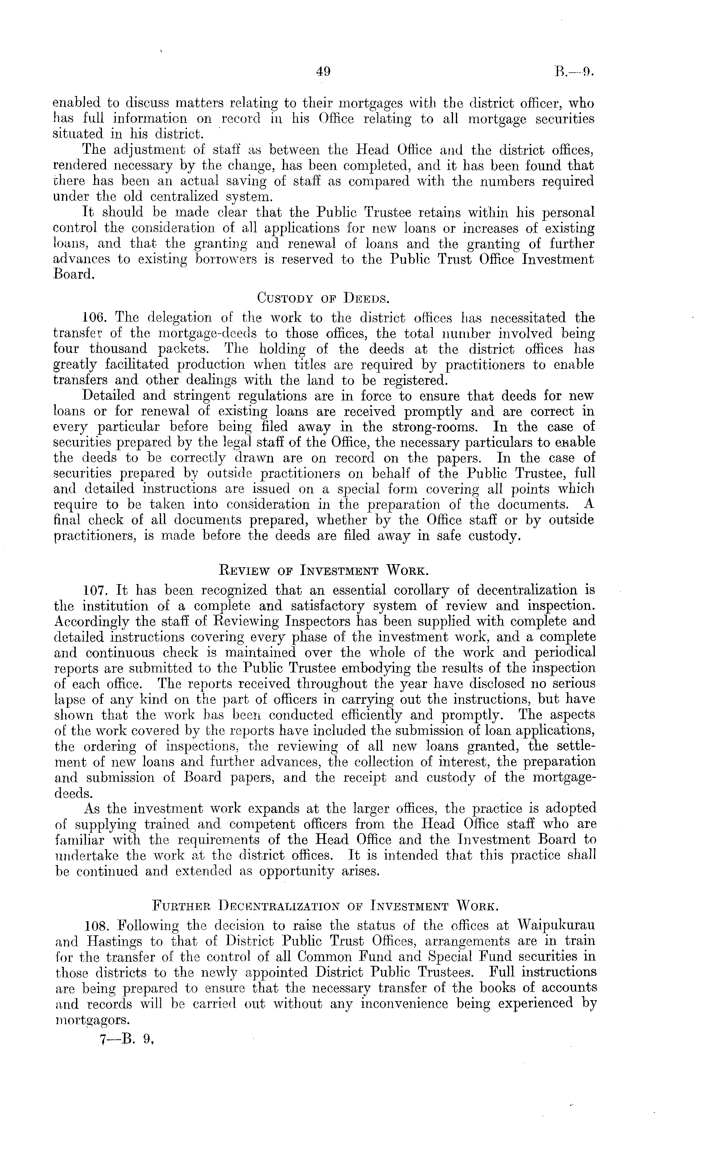 enabled to discuss matters relating to their mortgages with the district officer, who has full information on record in his Office relating to all mortgage securities situated in his district. The adjustment of staff as between the Head Office and the district offices, rendered necessary by the change, has been completed, and it has been found that there has been an actual saving of staff as compared with the numbers required under the old centralized system. It. should be made clear that the Public Trustee retains within his personal control the consideration of all applications for new loans or increases of existing loans, and that the granting and renewal of loans and the granting of further advances to existing borrowers is reserved to the Public Trust Office Investment Board. Custody op Deeds. 106. The delegation of the work to the district offices has necessitated the transfer of the mortgage-deeds to those offices, the total number involved being four thousand packets. The holding of the deeds at the district offices has greatly facilitated production when titles are required by practitioners to enable transfers and other dealings with the land to be registered. Detailed and stringent regulations are in force to ensure that deeds for new loans or for renewal of existing loans are received promptly and are correct in every particular before being filed away in the strong-rooms. In the case of securities prepared by the legal staff of the Office, the necessary particulars to enable the deeds to be correctly drawn are on record on the papers. In the case of securities prepared by outside practitioners on behalf of the Public Trustee, full and detailed instructions are issued on a special form covering all points which require to be taken into consideration in the preparation of the documents. A final check of ail documents prepared, whether by the Office staff or by outside practitioners, is made before the deeds are filed away in safe custody. Review of Investment Work. 107. It has been recognized that an essential corollary of decentralization is the institution of a complete and satisfactory system of review and inspection. Accordingly the staff of Reviewing Inspectors has been supplied with complete and detailed instructions covering every phase of the investment work, and a complete and continuous check is maintained over the whole of the work and periodical reports are submitted to the Public Trustee embodying the results of the inspection of each office. The reports received throughout the year have disclosed no serious lapse of any kind on the part of officers in carrying out the instructions, but have shown that the work has been conducted efficiently and promptly. The aspects of the work covered by the reports have included the submission of loan applications, the ordering of inspections, the reviewing of all new loans granted, the settlement of new loans and further advances, the collection of interest, the preparation and submission of Board papers, and the receipt and custody of the mortgagedeeds. As the investment work expands at the larger offices, the practice is adopted of supplying trained and competent officers from the Head Office staff who are familiar with the requirements of the Head Office and the Investment Board to undertake the work at the district offices. It is intended that this practice shall be continued and extended as opportunity arises. Further Decentralization of Investment Work. 108. Following the decision to raise the status of the offices at Waipukurau and Hastings to that of District Public Trust Offices, arrangements are in train for the transfer of the control of all Common Fund and Special Fund securities in those districts to the newly appointed District Public Trustees. Full instructions are being prepared to ensure that the necessary transfer of the books of accounts and records will be carried out without any inconvenience being experienced by mortgagors.