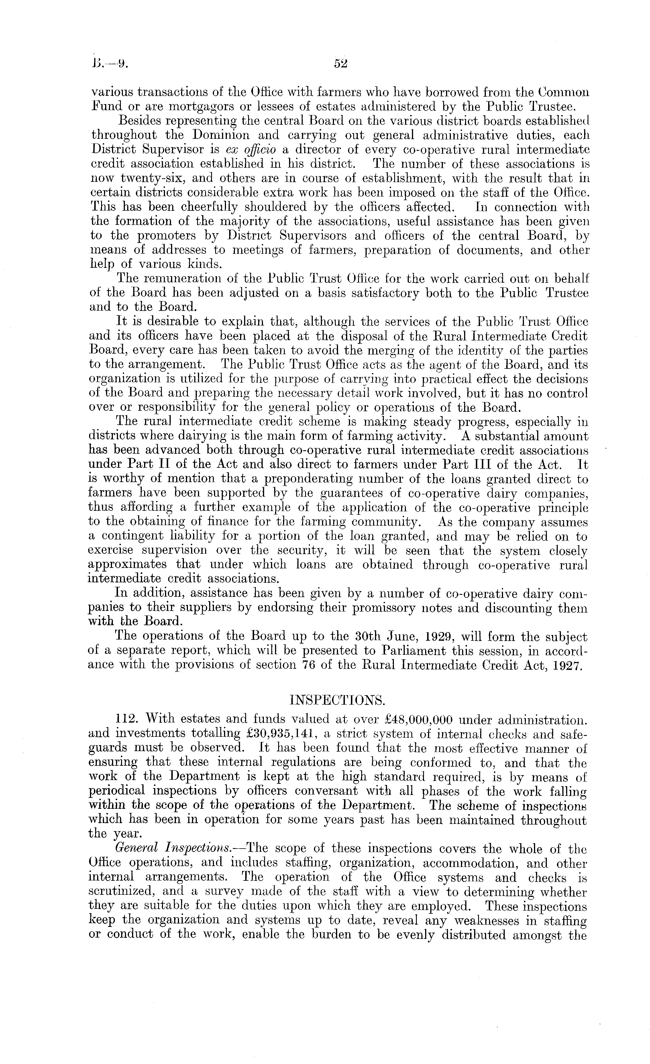 various transactions of the Office with farmers who have borrowed from the Common Fund or are mortgagors or lessees of estates administered by the Public Trustee. Besides representing the central Board on the various district boards established throughout the Dominion and carrying out general administrative duties, each District Supervisor is ex officio a director of every co-operative rural intermediate credit association established in his district. The number of these associations is now twenty-six, and others are in course of establishment, with the result that in certain districts considerable extra work has been imposed on the staff of the Office. This kas been cheerfully shouldered by the officers affected. In connection with the formation of the majority of the associations, useful assistance has been given to the promoters by District Supervisors and officers of the central Board, by means of addresses to meetings of farmers, preparation of documents, and other help of various kinds. The remuneration of tke Public Trust Office for the work carried out on behalf of the Board has been adjusted on a basis satisfactory both to the Public Trustee and to the Board. It is desirable to explain that, although the services of the Public Trust Office and its officers have been placed at tke disposal of the Rural Intermediate Credit Board, every care has been taken to avoid tke merging of the identity of the parties to the arrangement. The Public Trust Office acts as the agent of the Board, and its organization is utilized for the purpose of carrying into practical effect the decisions of the Board and preparing the necessary detail work involved, but it kas no control over or responsibility for the general policy or operations of the Board. The rural intermediate credit scheme is making steady progress, especially in districts wkere dairying is tke main form of farming activity. A substantial amount kas been advanced both through co-operative rural intermediate credit associations under Part II of the Act and also direct to farmers under Part 111 of the Act. It is worthy of mention that a preponderating number of the loans granted direct to farmers have been supported by the guarantees of co-operative dairy companies, thus affording a further example of the application of tke co-operative principle to tke obtaining of finance for tke farming community. As tke company assumes a contingent liability for a portion of tke loan granted, and may be relied on to exercise supervision over the security, it will be seen that the system closely approximates that under which loans are obtained through co-operative rural intermediate credit associations. In addition, assistance has been given by a number of co-operative dairy companies to their suppliers by endorsing their promissory notes and discounting them with the Board. The operations of the Board up to the 30th June, 1929, will form the subject of a separate report, which will be presented to Parliament this session, in accordance with the provisions of section 76 of the Rural Intermediate Credit Act, 1927. INSPECTIONS. 112. With estates and funds valued at over £48,000,000 under administration, and investments totalling £30,935,141, a strict system of internal ckecks and safeguards must be observed. It kas been found tkat tke most effective manner of ensuring tkat these internal regulations are being conformed to, and that the work of the Department is kept at tke high standard required, is by means of periodical inspections by officers conversant with all phases of the work falling witkin tke scope of the operations of the Department. The scheme of inspections which has been in operation for some years past has been maintained throughout the year. General Inspections.—The scope of these inspections covers the whole of the Office operations, and includes staffing, organization, accommodation, and other internal arrangements. The operation of the Office systems and checks is scrutinized, and a survey made of tke staff with a view to determining whether they are suitable for the duties upon which they are employed. These inspections keep tke organization and systems up to date, reveal any weaknesses in staffing or conduct of tke work, enable tke burden to be evenly distributed amongst the