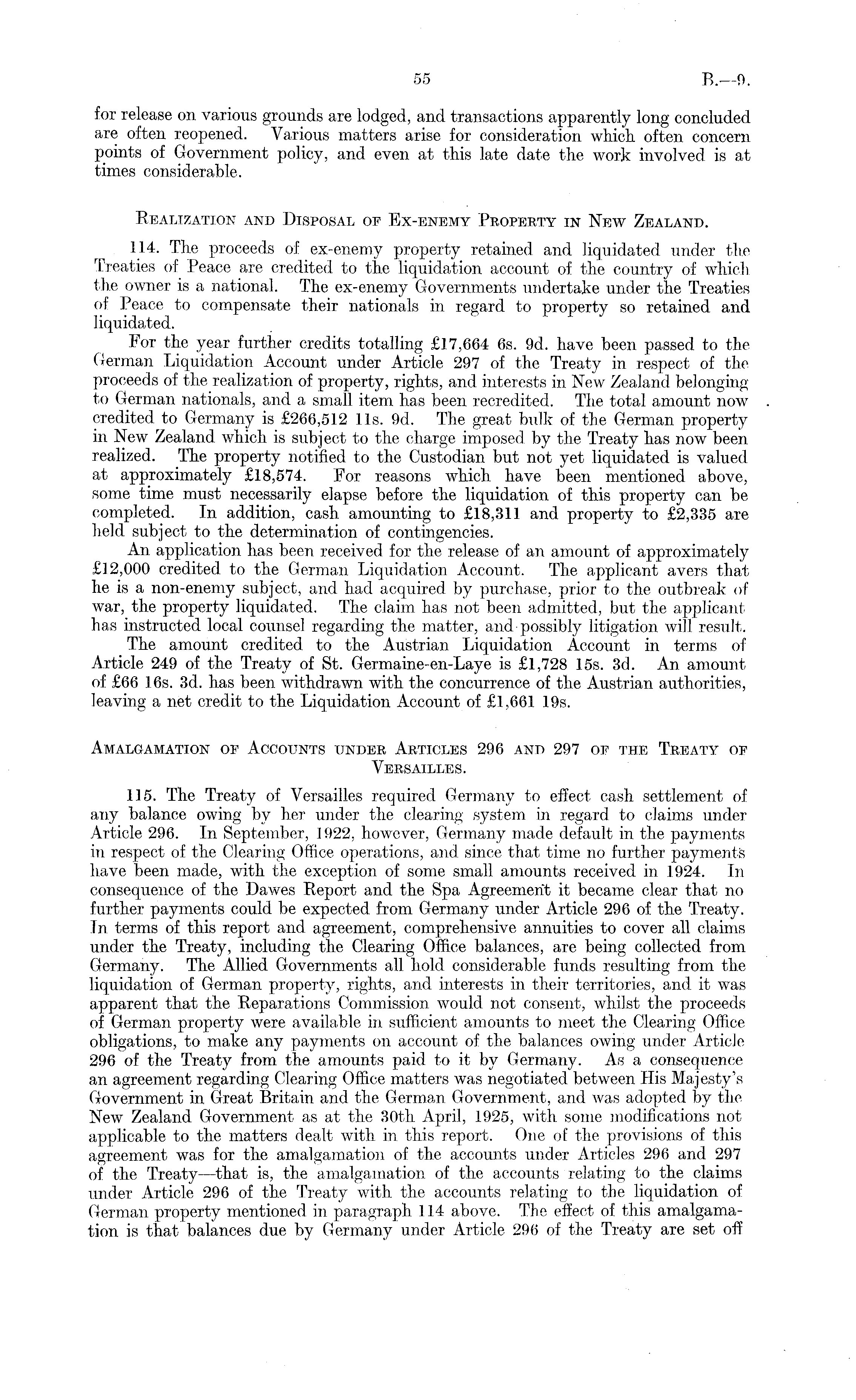 for release on various grounds are lodged, and transactions apparently long concluded are often reopened. Various matters arise for consideration which, often concern points of Government policy, and even at this late date the work involved is at times considerable. Realization and Disposal of Ex-enemy Property in New Zealand. 114. The proceeds of ex-enemy property retained and liquidated under the Treaties of Peace are credited to the liquidation account of the country of which the owner is a national. The ex-enemy Governments undertake under the Treaties of Peace to compensate their nationals in regard to property so retained and liquidated. For the year further credits totalling £17,664 6s. 9d. have been passed to the German Liquidation Account under Article 297 of the Treaty in respect of the proceeds of the realization of property, rights, and interests in New Zealand belonging to German nationals, and a small item has been recredited. The total amount now credited to Germany is £266,512 lis. 9d. The great bulk of the German property in New Zealand which is subject to the charge imposed by the Treaty has now been realized. The property notified to the Custodian but not yet liquidated is valued at approximately £18,574. For reasons which have been mentioned above, some time must necessarily elapse before the liquidation of this property can be completed. In addition, cash amounting to £18,311 and property to £2,335 are held subject to the determination of contingencies. An application has been received for the release of an amount of approximately £12,000 credited to the German Liquidation Account. The applicant avers that he is a non-enemy subject, and had acquired by purchase, prior to the outbreak of war, the property liquidated. The claim has not been admitted, but the applicant has instructed local counsel regarding the matter, and possibly litigation will result. The amount credited to the Austrian Liquidation Account in terms of Article 249 of the Treaty of St. Germaine-en-Laye is £1,728 15s. 3d. An amount of £66 16s. 3d. has been withdrawn with the concurrence of the Austrian authorities, leaving a net credit to the Liquidation Account of £1,661 19s. Amalgamation of Accounts under Articles 296 and 297 of the Treaty of Versailles. 115. The Treaty of Versailles required Germany to effect cash settlement of any balance owing by her under the clearing system in regard to claims under Article 296. In September, 1922, however, Germany made default in the payments in respect of the Clearing Office operations, and since that time no further payment's have been made, with the exception of some small amounts received in 1924. In consequence of the Dawes Report and the Spa Agreement it became clear that no further payments could be expected from Germany under Article 296 of the Treaty. In terms of this report and agreement, comprehensive annuities to cover all claims under the Treaty, including the Clearing Office balances, are being collected from Germany. The Allied Governments all hold considerable funds resulting from the liquidation of German property, rights, and interests in their territories, and it was apparent that the Reparations Commission would not consent, whilst the proceeds of German property were available in sufficient amounts to meet the Clearing Office obligations, to make any payments on account of the balances owing under Article 296 of the Treaty from the amounts paid to it by Germany. As a consequence an agreement regarding Clearing Office matters was negotiated between His Majesty's Government in Great Britain and the German Government, and was adopted by the New Zealand Government as at the 30th April, 1925, with some modifications not applicable to the matters dealt with in this report. One of the provisions of this agreement was for the amalgamation of the accounts under Articles 296 and 297 of the Treaty —that is, the amalgamation of the accounts relating to the claims under Article 296 of the Treaty with the accounts relating to the liquidation of German property mentioned in paragraph 114 above. The effect of this amalgamation is that balances due by Germany under Article 296 of the Treaty are set off