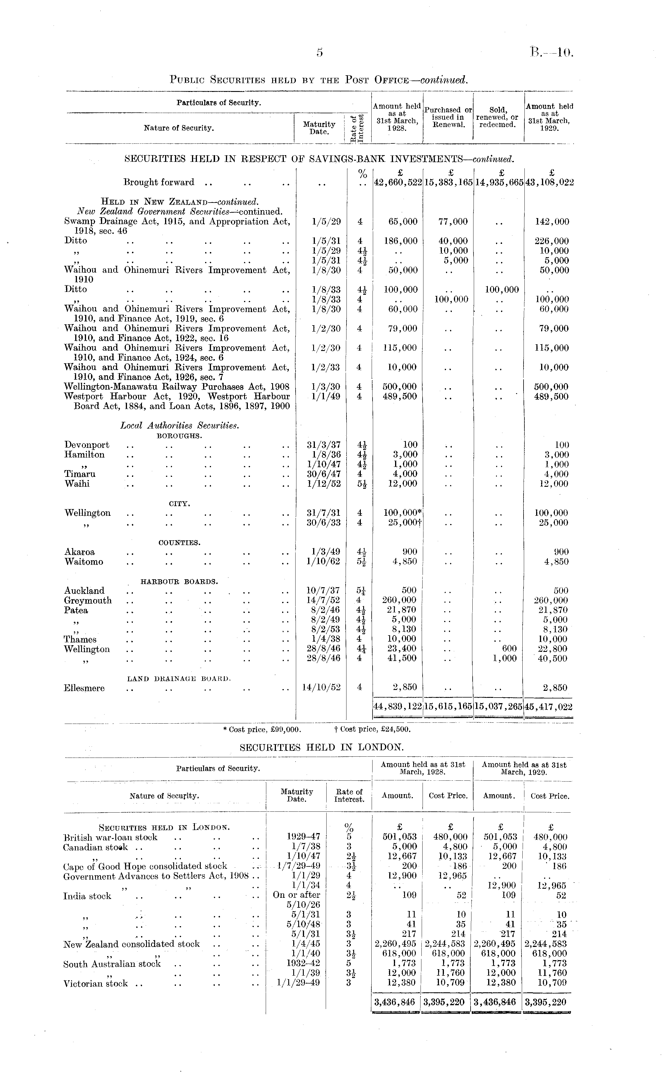 PaitiC " 1 " S ° fMy ' Amount held purcha8edQr Amount he,d o® nit March issued in renewed, or o 1nt warch Nature of Security. 7 si "28. ' redeemed. 31st 1929 . ' ' I tig SECURITIES HELD IN RESPECT OF SAVINGS-BANK INVESTMENTS—continued. % £ £ £ £ Brought forward .. .. .. .. .? 42,660,52215,383,16514,935,66543,108,022 Held in New Zealand—continued. New Zealand Government Securities—continued. Swamp Drainage Act, 1915, and Appropriation Act, 1/5/29 4 65,000 77,000 .. 142,000 1918, sec. 46 Ditto .. .. .. .. .. 1/5/31 4 186,000 40,000 .. 226,000 1/5/29 U ■■ 10,000 .. 10,000 1/5/31 4J .. 5,000 .. 5,000 Waihou and Ohinemuri Rivers Improvement Act, 1/8/30 4 50,000 .. .. 50,000 1910 Ditto .. .. .. .. .. 1/8/33 4| 100,000 .. 100,000 1/8/33 4 .. 100,000 .. 100,000 Waihou and Ohinemuri Rivers Improvement Act, 1/8/30 4 60,000 .. .. 60,000 1910, and Finance Act, 1919, sec. 6 Waihou and Ohinemuri Rivers Improvement Act, 1/2/30 4 79,000 .. .. 79,000 1910, and Finance Act, 1922, sec. 16 Waihou and Ohinemuri Rivers Improvement Act, 1/2/30 4 115,000 .. .. 115,000 1910, and Finance Act, 1924, sec. 6 Waihou and Ohinemuri Rivers Improvement Act, 1/2/33 4 10,000 .. .. 10,000 1910, and Finance Act, 1926, sec. 7 Wellington-Manawatu Railway Purchases Act, 1908 1/3/30 4 500,000 .. .. 500,000 Westport Harbour Act, 1920, Westport Harbour 1/1/49 4 489,500 .. .. 489,500 Board Act, 1884, and Loan Acts, 1896, 1897, 1900 Local Authorities Securities. BOROUGHS. Devonport .. .. .. .. .. 31/3/37 4J 100 .. .. 100 Hamilton .. .. .. .. .. 1/8/36 4J 3,000 .. .. 3,000 1/10/47 4} 1,000 .. .. 1,000 Timaru .. .. .. .. .. 30/6/47 4 4,000 .. .. 4,000 Waihi .. .. .. .. .. 1/12/52 5J 12,000 .. .. 12,000 CITY. Wellington .. .. .. .. .. 31/7/31 4 100,000* .. .. 100,000 30/6/33 4 25,000f .. .. 25,000 COUNTIES. Akaroa .. .. .. .. .. 1/3/49 4J 900 .. .. 900 Waitomo .. .. .. .. .. 1/10/62 5| 4,850 .. .. 4,850 HARBOUR BOARDS. Auckland .. .. .. 10/7/37 5| 500 . . .. 500 Greymouth .. .. .. .. .. 14/7/52 4 260,000 .. .. 260,000 Patea .. .. .. .. .. 8/2/46 4J 21,870 .. .. 21,870 8/2/49 4 5 >°0° •• 5,000 8/2/53 4i 8,130 .. .. 8,130 Thames .. .. .. .. .. 1/4/38 4 10,000 .. .. 10,000 Wellington .. .. .. .. .. 28/8/46 4J 23,400 .. 600 22,800 28/8/46 4 41,500 .. 1,000 40,500 LAND DRAINAGE BOARD. Ellesmere .. .. .. .. .. 14/10/52 4 2,850 .. .. 2,850 44,839,122 15,615,165 15,037,265 45,417,022 * Cost price, £99,000. t Cost price, £24,500. SECURITIES HELD IN LONDON. p»rtin„inr« nf Spc.ritv I Amount held as at 31st Amount held as at 31st I articutars ot becurity. | March, 1928. March, 1929. Nature of Security. | ! Interest i Amount ' Cost Price. Amount. Cost Price. Securities held in London. ! % £ £ £ 1 £ British war-loan stock .. .. .. j 1929-47 5 501,053 480,000 501,053! 480,000 Canadian sto«k .. .. .. •• 1/7/38 3 5,000 4,800 5,000 4,800 .. 1/10/47 2i 12,667 10,13.3 12,667 10,133 Cape of Good Hope consolidated stock ... I 1/7/29-49 3J 200 186 200 ' 186 Government Advances to Settlers Act, 1908 .. j 1/1/29 4 12,900 12,965 .. 1/1/34 4 .. .. 12,900 12,965 India stock .. .. .. .. On or after 2J 109 52 109 52 5/10/26 .. j 5/1/31 3 11 10 11 10 .. 5/10/48 3 41 35 41 35 5/1/31 3J- 217 214 '217 214 New Zealand consolidated stock .. .. 1/4/45 3 2,260,495 2,244,583 2,260,495 2,244,583 .. 1/1/40 3| 618,000 618,000 618,000 618,000 South Australian stock .. .. .. 1932-42 5 1,773 1,773 1,773 1,773 1/1/39 3J 12,000 11,760 12,000 11,760 Victorian stock 1/1/29-49 3 12,380 10,709 12,380 10,709 3,436,846 3,395,220 3,436,846 3,395,220