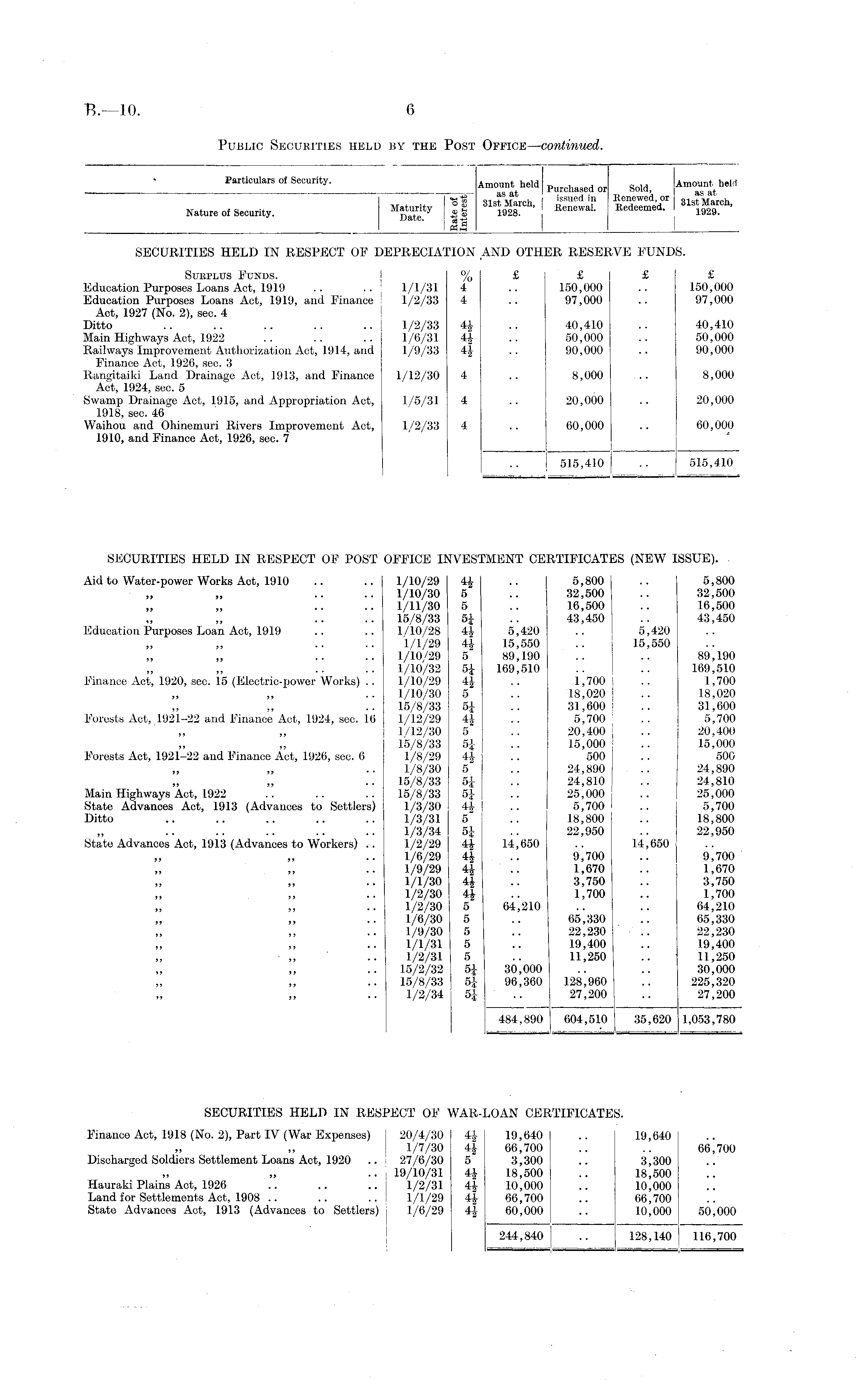 ol Security. Amount held Purchased or Sold , Amounted ■"S h issued in Eenewed, or q-i„ t ' Mar ,, h Nature of Security. <s| 1928. ' fienewaL Hedeemed - 1929. ' I SECURITIES HELD IN RESPECT OF DEPRECIATION AND OTHER RESERVE FUNDS. Surplus Ftjhds. % £ £ £ £ Education Purposes Loans Act, 1919 .. .. 1/1/31 4 .. 150,000 .. 150,000 Education Purposes Loans Act, 1919, and Finance 1/2/33 4 .. 97,000 .. 97,000 Act, 1927 (No. 2), sec. 4 Ditto .. .. .. .. . . 1/2/33 4} .. 40,410 . . 40,410 Main Highways Act, 1922 . . .. . . 1/6/31 4J .. 50,000 .. 50,000 Railways Improvement Authorization Act, 1914, and 1/9/33 4J .. 90,000 .. 90,000 Finance Act, 1926, sec. 3 Rangitaiki Land Drainage Act, 1913, and Finance 1/12/30 4 .. 8,000 .. 8,000 Act, 1924, sec. 5 Swamp Drainage Act, 1915, and Appropriation Act, 1/5/31 4 .. 20,000 .. 20,000 1918, sec. 46 Waihou and Ohinemuri Rivers Improvement Act, 1/2/33 4 .. 60,000 .. 60,000 1910, and Finance Act, 1926, sec. 7 515,410 .. 515,410 SECURITIES HELD IN RESPECT OF POST OFFICE INVESTMENT CERTIFICATES (NEW ISSUE). Aid to Water-power Works Act, 1910 .. .. I 1/10/29 4J .. 5,800 .. 5,800 .. i 1/10/30 5 .. 32,500 .. 32,500 .... 1/11/30 5 .. 16,500 .. 16,500 .... 15/8/33 5i .. 43,450 .. 43,450 Education Purposes Loan Act, 1919 .. .. 1/10/28 5,420 .. 5,420 .... 1/1/29 4 15,550 .. 15,550 1/10/29 5 89,190 .. .. 89,190 .... 1/10/32 5J 169,510 .. .. 169,510 Finance Act, 1920, sec. 15 (Electric-power Works) .. 1/10/29 4J .. 1,700 .. 1,700 1/10/30 5 .. 18,020 .. 18,020 15/8/33 5J .. 31,600 .. 31,600 Forests Act, 1921-22 and Finance Act, 1924, sec. 16 1/12/29 4J .. 5,700 .. 5,700 1/12/30 5 .. 20,400 .. 20,400 15/8/33 5J .. 15,000 .. 15,000 Forests Act, 1921-22 and Finance Act, 1926, sec. 6 1/8/29 4-1- .. 500 . . 500 1/8/30 5" .. 24,890 .. 24,890 15/8/33 5| .. 24,810 .. 24,810 Main Highways Act, 1922 .. .. .. 15/8/33 5J- .. 25,000 .. 25,000 State Advances Act, 1913 (Advances to Settlers) 1/3/30 .. 5,700 .. 5,700 Ditto .. .. .. .. .. 1/3/31 5" .. 18,800 .. 18,800 1/3/34 5£ .. 22,950 .. 22,950 State Advances Act, 1913 (Advances to Workers) .. 1/2/29 4£ 14,650 .. 14,650 1/6/29 4i .. 9,700 .. 9,700 1/9/29 4J .. 1,670 .. 1,670 1/1/30 4| .. 3,750 .. 3,750 1/2/30 4 1,700 .. 1,700 1/2/30 5 64,210 .. .. 64,210 1/6/30 5 .. 65,330 .. 65,330 1/9/30 5 .. 22,230 .. 22,230 „ „ .. 1/1/31 5 .. 19,400 .. 19,400 • „ 1/2/31 5 .. 11,250 .. 11,250 15/2/32 5-i 30,000 .. .. 30,000 15/8/33 5J 96,360 128,960 .. 225,320 1/2/34 5J .. 27,200 .. 27,200 484,890 604,510 35,620 1,053,780 SECURITIES HELD IN RESPECT OF WAR-LOAN CERTIFICATES. Finance Act, 1918 (No. 2), Part IV (War Expenses) 20/4/30 19,640 .. 19,640 1/7/30 4| 66,700 .. .. 66,700 Discharged Soldiers Settlement Loans Act, 1920 .. 27/6/30 5 3,300 .. 3,300 .. 19/10/31 4£ 18,500 .. 18,500 Hauraki Plains Act, 1926 .. .. .. 1/2/31 4J 10,000 .. 10,000 Land for Settlements Act, 1908 .. .. .. 1/1/29 4|- 66,700 .. 66,700 State Advances Act, 1913 (Advances to Settlers) 1/6/29 4-| 60,000 .. 10,000 50,000 244,840 .. 128,140 116,700