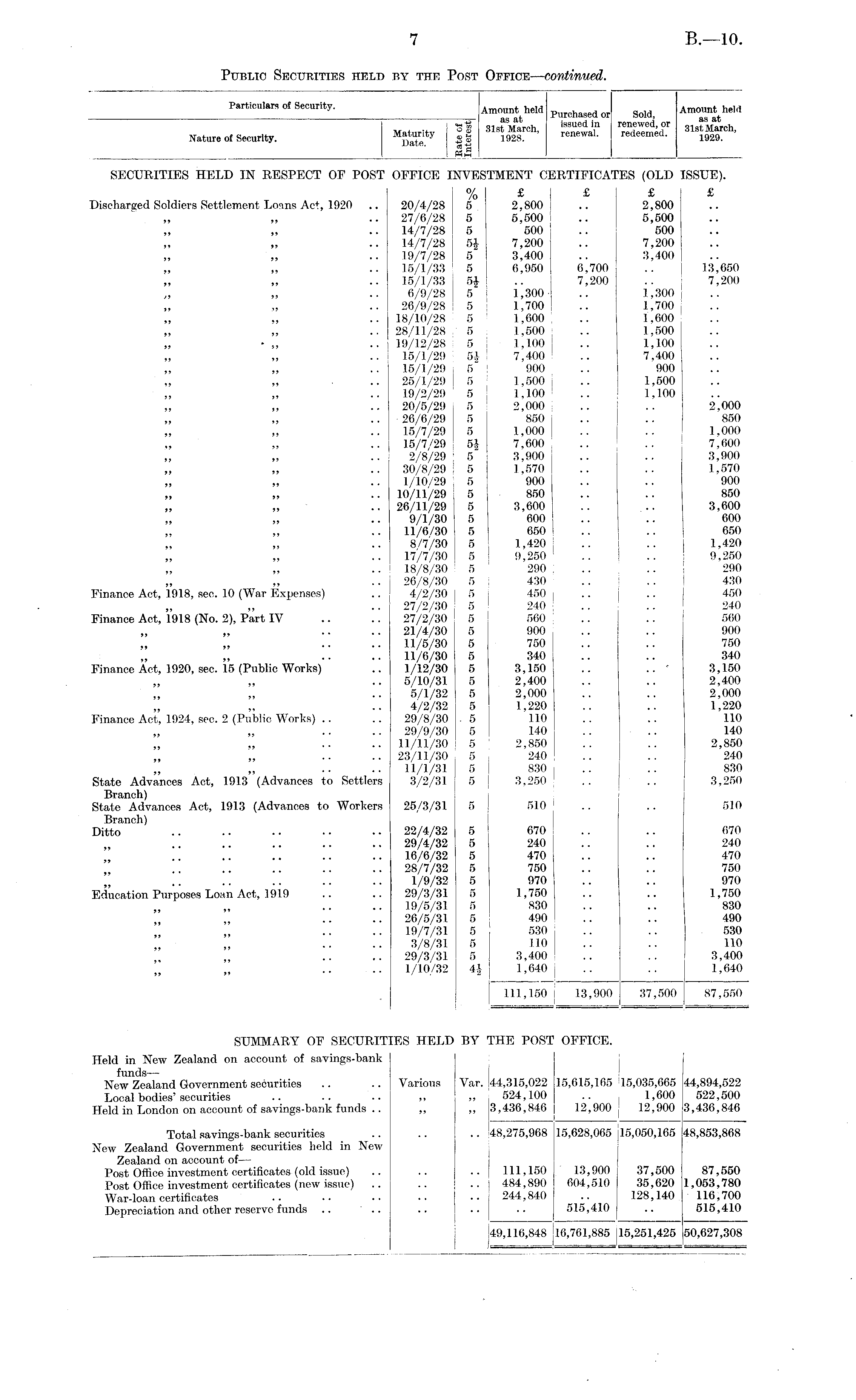 FartlC "' a " 0{SeCUrity - Amount held purchasedor Amount held i «w-g issued in renewed, or 01 a +tvtq,^ Nature of Security. 7 || 1928. renewal. redeemed. ' SECURITIES HELD IN RESPECT OP POST OFFICE INVESTMENT CERTIFICATES (OLD ISSUE). % £ £ £ £ Discharged Soldiers Settlement Lonns Act, 1920 .. 20/4/28 5 2,800 .. 2,800 27/6/28 5 5,500 .. 5,500 14/7/28 5 500 .. 500 14/7/28 5J 7,200 .. 7,200 19/7/28 5 3,400 .. 3,400 15/1/33 5 6,950 6,700 .. 13,650 15/1/33 5£ .. 7,200 .. 7,200 6/9/28 5 1,300 .. 1,300 26/9/28 5 1,700 .. 1,700 .. 18/10/28 5 1,600 .. 1,600 .. 28/11/28 5 1,500 .. 1,500 .. 19/12/28 5 1,100 .. 1,100 ..I 15/1/29 7,400 .. 7,400 15/1/29 5 900 .. 900 25/1/29 5 1,500; .. 1,500 19/2/29 5 1,100 ! .. 1,100 20/5/29 5 2,000 j .. .. 2,000 26/6/29 5 850 .. .. 850 15/7/29 5 1,000 I .. .. 1,000 15/7/29 5i 7,600 .. .. 7,600 2/8/29 5 3,900 j .. .. 3,900 30/8/29 5 1,570 I .. .. 1,570 1/10/29 5 900 S .. .. 900 .. 10/11/29 5 850 : .. .. 850 .. 26/11/29 | 5 3.600 I .. .. 3,600 9/1/30 5 600 1 .. .. 600 11/6/30 5 650 1 .. 650 8/7/30 5 1,420 j .. .. 1,420 17/7/30 5 9,250 .. .. 9,250 .. | 18/8/30 5 290 .... 290 26/8/30 5 430 .. ... 430 Finance Act, 1918, sec. 10 (War Expenses) .. 4/2/30 5 450 j .. .. 450 27/2/30 5 240: .. .. 240 Finance Act, 1918 (No. 2), Part IV .. .. 27/2/30 5 560 .. .. 560 .... 21/4/30 5 900 .. .. 900 .... 11/5/30 5 750 | .. 750 .... 11/6/30 5 340 .. .. 340 Finance Act, 1920, sec. 15 (Public Works) .. 1/12/30 5 3,150 .. .. ' 3,150 5/10/31 5 2.400 .. .. 2,400 5/1/32 5 2,000 .. .. 2,000 4/2/32 5 1,220 .. .. 1,220 Finance Act, 1924, sec. 2 (Public Works) .. .. 29/8/30 5 110 .. .. 110 .... 29/9/30 5 140 .. .. 140 .... 11/11/30 5 2,850 .. .. 2,850 .... 23/11/30 5 240 .. .. 240 .... 11/1/31 5 830 | .. 830 State Advances Act, 1913 (Advances to Settlers 3/2/31 5 3,250 .. .. 3,250 Branch) State Advances Act, 1913 (Advances to Workers 25/3/31 5 510 .. .. 510 Branch) Ditto .. • ■ • • • • ■ • 22/4/32 5 670 .. .. 670 29/4/32 5 240 .. .. 240 16/6/32 5 470 .. .. 470 28/7/32 5 750 .. .. 750 1/9/32 5 970 .. .. 970 Education Purposes Loan Act, 1919 .. .. 29/3/31 5 1,750 .. .. 1,750 .... 19/5/31 5 830 .. .. 830 .... 26/5/31 5 490 .. . . 490 19/7/31 5 530 i .. .. 530 .... 3/8/31 5 110 .. .. 110 29/3/31 5 3,400 ! .. .. 3,400 .... 1/10/32 4i 1,640 j .. .. 1,640 111,150 13,900 37,500 87,550 SUMMARY OF SECURITIES HELD BY THE POST OFFICE. Held in New Zealand on account of savings-bank funds— New Zealand Government securities .. .. Various Var. 44,315,022 15,615,165 ! 15,035,665 44,894,522 Local bodies'securities .. .. .. ,, ,, 524,100 .. 1,600 522,500 Held in London on account of savings-bank funds .. ,, ,, 3,436,846 12,900 j 12,900 3,436,846 Total savings-bank securities .. .. .. 48,275,968 15,628,065 15,050,165 48,853,868 New Zealand Government securities held in New Zealand on account of — Post Office investment certificates (old issue) .. .. .. 111,150 13,900 37,500 87,550 Post Office investment certificates (new issue) .. .. .. 484,890 604,510 35,620 1,053,780 War-loan certificates •• •• •• 244,840 .. 128,140 116,700 Depreciation and other reserve funds .. .. .. .. .. 515,410 .. 515,410 49,116,848 16,761,885 il5,251,425 50,627,308