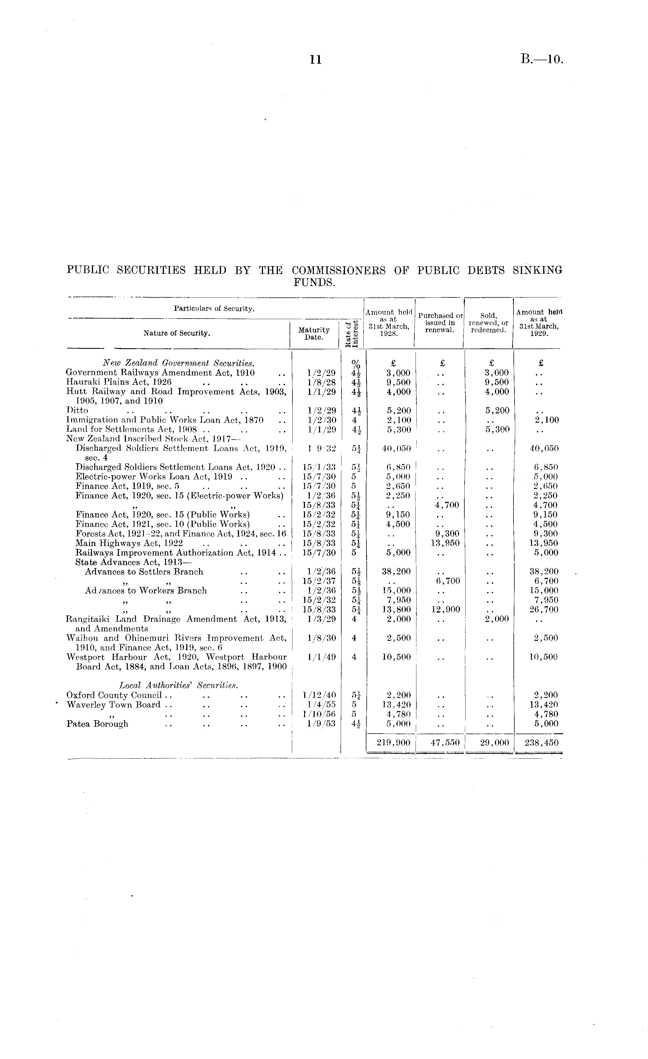 PartiC "' ar,0tSeCUrity - Md Purchased or! Sold, ! of I 31st March issued in renewed, or ow March Nature of Security. S§| 1928. ' renewaL "deemed. 1929> ' L) ate. uj -g I rH I—I I I New Zealand Government Securities. % £ £ £ £ Government Railways Amendment Act, 1910 .. 1./2/29 4£ 3,000 .. 3,000 Hauraki Plains Act, 1926 .. .. .. 1/8/28 41 9,500 .. 9,500 Hutt Railway and Road Improvement Acts, 1903, 1/1/29 4-| 4,000 .. 4,000 1905, 1907,' and 1910 Ditto .. .. .. .. .. 1/2/29 4J 5,200 .. 5,200 immigration and Public Works Loan Act, 1870 .. 1/2/30 4 2,100 .. .. 2,100 Land for Settlements Act, 1908 .. .. .. 1/1/29 4|- 5,300 . . 5,300 New Zealand Inscribed Stock Act, 1917— Discharged Soldiers Settlement Loans Act, 1919, 1/9/32 5J 40,050 .. .. 40,050 sec. 4 Discharged Soldiers Settlement Loans Act, 1920 .. 15/1/33 5J 6,850 .. .. 6,850 Electric-power Works Loan Act, 1.919 .. .. 15/7/30 5 5,000 .. .. 5,000 Finance Act, 1919, sec. 5 .. .. .. 15/7/30 5 2,650 .. .. 2,650 Finance Act, 1920, sec. 15 (Electric-power Works) 1/2/36 5J 2,250 .. .. 2,250 15/8/33 5J .. 4,700 .. 4,700 Finance Act, 1920, sec. 15 (Public Works) .. 15/2/32 5' 9,150 .. .. 9,150 Finance Act, 1921, sec. 10 (Public Works) .. 15/2/32 5J 4,500 .. .. 4,500 Forests Act, 1921-22, and Finance Act, 1924, sec. 16 15/8/33 5 ; |- .. 9,300 .. 9,300 Main Highways Act, 1922 .. .. .. I 15/8/33 5J .. 13,950 .. 13,950 Railways Improvement Authorization Act, 1914 .. 15/7/30 5 5,000 .. .. 5,000 State Advances Act, 1913— Advances to Settlers Branch .. .. 1 2/36 54 38,200 .. .. 38,200 .. 15/2/37 5| .. 6,700 .. 6,700 Ad nances to Workers Branch .. .. 1/2/36 5| 15,000 .. .. 15,000 15/2/32 5i 7,950 .. .. 7,950 .... 15/8/33 5J 13,800 12,900 .. 26,700 Rangitaiki Land Drainage Amendment Act, 1913, 1/3/29 4 2,000 .. 2,000 and Amendments Waihou and Ohinemuri Rivers Improvement Act, 1/8/30 4 2,500 .. .. 2,500 1910, and Finance Act, 1919, sec. 6 Westport Harbour Act, 1920, Westport Harbour 1/1/49 4 10,500 .. .. 10,500 Board Act, 1884, and Loan Acts, 1896, 1897, 1900 Local Authorities' Securities. Oxford County Council .. .. .. .. 1/12/40 5£ 2,200 .. 2,200 Waverley Town Board .. .. .. .. 1/4/55 5 13.420 .. .. 13,420 1/10/56 5 4,780 .. .. 4,780 Patea Borough .. .. .. .. 1/9/53 4J 5,000 .. .. 5,000 219,900 47,550 29,000 238,450