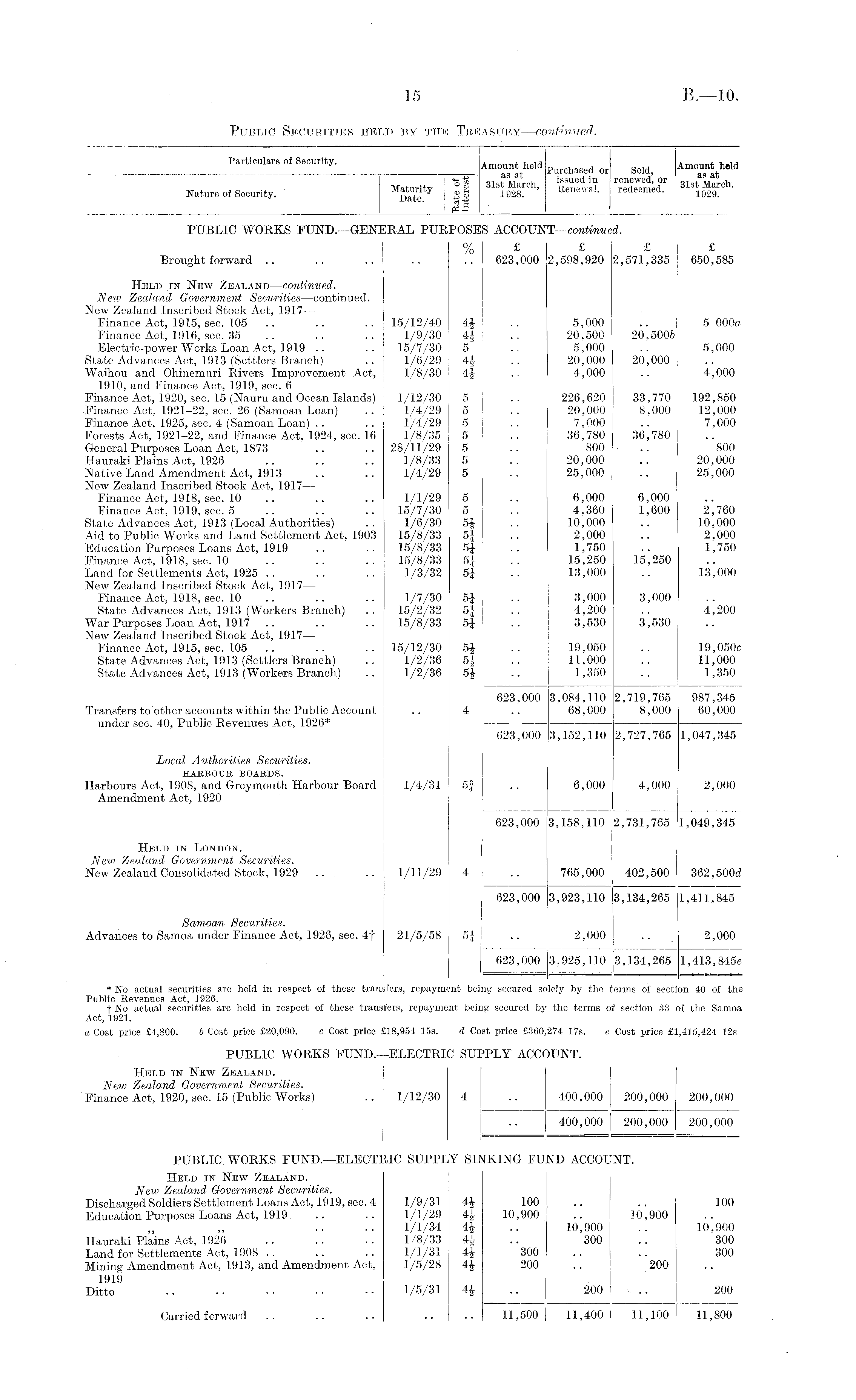 Particulars of Security. Amount held Purchased or gold; Amount held ! of 31st March issued in renewed, or 31st Marc h Nature of Security. Se |! 1928 ' ' Eene ™ ! ' redeemed - lX 1 ll PUBLIC WORKS FUND.—GENERAL PURPOSES ACCOUNT—continued. % £ £ £ £ Brought forward .. .. .. .. .? 623,000 2,598,920 2,571,335 650,585 Held in New Zealand—continued. New Zealand Government Securities —continued. New Zealand Inscribed Stock Act, 1917 — Finance Act, 1915, sec. 105 .. .. .. 15/12/40 .. 5,000 .. 5 000a Finance Act, 1916, sec. 35 .. .. .. 1/9/30 4£ .. 20,500 20,5006 Electric-power Works Loan Act, 1919 .. .. 15/7/30 5 .. 5,000 .. 5,000 State Advances Act, 1913 (Settlers Branch) .. 1/6/29 4£ .. 20,000 20,000 Waihou and Ohinemuri Rivers Improvement Act, 1/8/30 4|- .. 4,000 .. 4,000 1910, and Finance Act, 1919, sec. 6 Finance Act, 1920, sec. 15 (Nauru and Ocean Islands) 1/12/30 5 .. 226,620 33,770 192,850 Finance Act, 1921-22, sec. 26 (Samoan Loan) .. 1/4/29 5 .. 20,000 8,000 12,000 Finance Act, 1925, sec. 4 (Samoan Loan) .. .. 1/4/29 5 .. 7,000 .. 7,000 Forests Act, 1921-22, and Finance Act, 1924, sec. 16 1/8/35 5 .. 36,780 36,780 General Purposes Loan Act, 1873 .. .. 28/11/29 5 .. 800 .. 800 Hauraki Plains Act, 1926 .. .. .. 1/8/33 5 .. 20,000 .. 20,000 Native Land Amendment Act, 1913 .. .. 1/4/29 5 .. 25,000 .. 25,000 New Zealand Inscribed Stock Act, 1917— Finance Act, 1918, sec. 10 .. .. .. 1/1/29 5 .. 6,000 6,000 Finance Act, 1919, sec. 5 .. .. .. 15/7/30 5 .. 4,360 1,600 2,760 State Advances Act, 1913 (Local Authorities) .. 1/6/30 5J .. 10,000 .. 10,000 Aid to Public Works and Land Settlement Act, 1903 15/8/33 5J .. 2,000 .. 2,000 Education Purposes Loans Act, 1919 .. .. 15/8/33 5J .. 1,750 .. 1,750 Finance Act, 1918, sec. 10 .. .. .. 15/8/33 5± .. 15,250 15,250 Land for Settlements Act, 1925 .. .. .. 1/3/32 5J .. 13,000 .. 13,000 New Zealand Inscribed Stock Act, 1917— Finance Act, 1918, sec. 10 .. .. .. 1/7/30 5£ .. 3,000 3,000 State Advances Act, 1913 (Workers Branch) .. 15/2/32 .. 4,200 .. 4,200 War Purposes Loan Act, 1917 .. .. .. 15/8/33 5J .. 3,530 3,530 New Zealand Inscribed Stock Act, 1917— Finance Act, 1915, sec. 105 .. .. .. 15/12/30 .. 19,050 .. 19,050c State Advances Act, 1913 (Settlers Branch) .. 1/2/36 .. 11,000 .. 11,000 State Advances Act, 1913 (Workers Branch) .. 1/2/36 5|- .. 1,350 .. 1,350 623,000 3,084,110 2,719,765 987,345 Transfers to other accounts within the Public Account .. 4 .. 68,000 8,000 60,000 under sec. 40, Public Revenues Act, 1926* 623,000 3,152,110 2,727,765 1,047,345 Local Authorities Securities. HARBOUR BOARDS. Harbours Act, 1908, and Greymouth Harbour Board 1/4/31 5f .. 6,000 4,000 2,000 Amendment Act, 1920 623,000 3,158,110 2,731,765 1,049,345 Held in London. New Zealand Government Securities. New Zealand Consolidated Stock, 1929 .. .. 1/11/29 4 .. 765,000 | 402,500 362,500^ 623,000 3,923,110 13,134,265 1,411,845 Samoan Securities. I Advances to Samoa under Finance Act, 1926, sec. 4f 21/5/58 5-J .. 2,000 ' .. 2,000 623,000 3,925,110 3,134,265 1,413,845c * No actual securities are held in respect of these transfers, repayment being secured solely by the terms of section 40 of the Public llevenues Act, 1926. f No actual securities are held in respect of these transfers, repayment being secured by the terms of section 33 of the Samoa Act, 1921. a Cost price £4,800. b Cost price £20,090. c Cost price £18,954 15s. d Cost price £360,274 17s. e Cost price £1,415,424 12s PUBLIC WORKS FUND.—ELECTRIC SUPPLY ACCOUNT. Held in New Zealand. New Zealand Government Securities. Finance Act, 1920, sec. 15 (Public Works) .. 1/12/30 4 .. 400,000 200,000 200,000 400,000 | 200,000 200,000 PUBLIC WORKS FUND.—ELECTRIC SUPPLY SINKING FUND ACCOUNT. Held in New Zealand. i New Zealand Government Securities. Discharged Soldiers Settlement Loans Act, 1919, sec. 4 1/9/31 100 .. .. 100 Education Purposes Loans Act, 1919 .. .. 1/1/29 4£ 10,900 .. 10,900 .... 1/1/34 4J' .. 10,900 .. 10,900 Hauraki Plains Act, 1926 .. .. .. 1/8/33 4£ .. 300 .. 300 Land for Settlements Act, 1908 .. .. .. 1/1/31 300 .. .. 300 Mining Amendment Act, 1913, and Amendment Act, 1/5/28 4£ 200 .. 200 1919 Ditto 1/5/31 41 .. 200 ' .. 200 Carried forward .. .. .. .. .. 11,5001 11,400 1 11,100 11,800