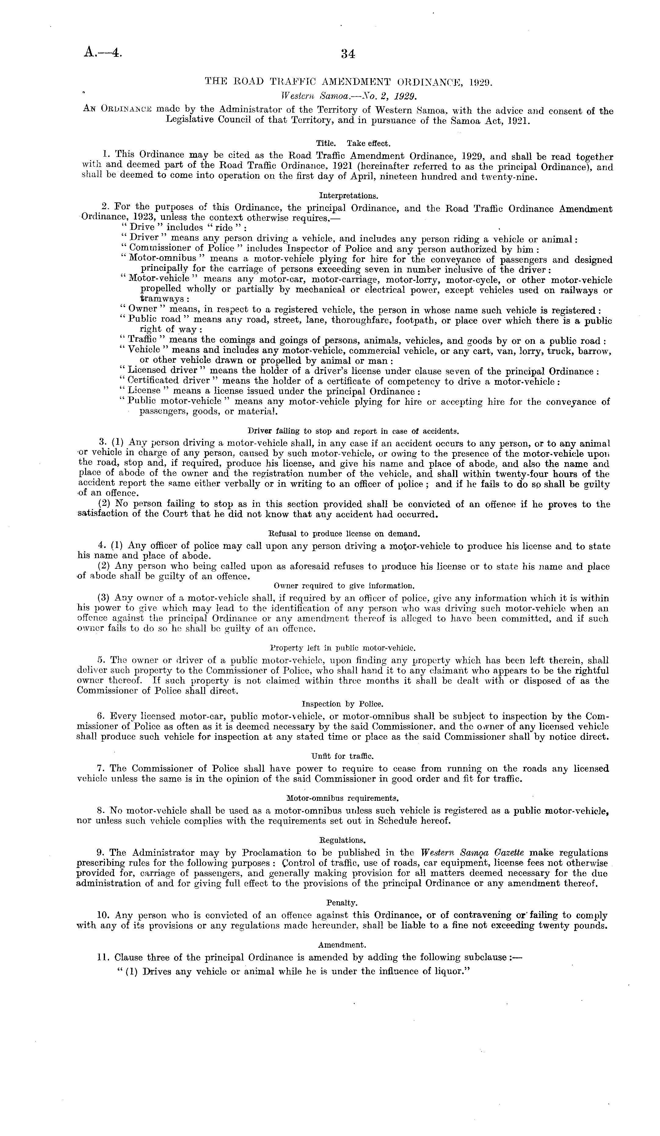 THE ROAD TRAFFIC AMENDMENT ORDINANCE, 1929. Western Samoa.—No. 2, 1929. An made by the Administrator of the Territory of Western Samoa., with the advice and consent of the Legislative Council of that Territory, and in pursuance of the Samoa Act, 1921. Title. Take effect. 1. This Ordinance may be cited as the Road Traffic Amendment Ordinance, 1929, and shall be read together with and deemea part of the Road Traffic Ordinance, 1921 (hereinafter referred to as the principal Ordinance), and shall be deemed to come into operation on the first day of April, nineteen hundred and twenty-nine. Interpretations. 2. For the purposes of this Ordinance, the principal Ordinance, and the Road Traffic Ordinance Amendment Ordinance, 1923, unless the context otherwise requires,— " Drive " includes " ride " : " Driver " means any person driving a vehicle, and includes any person riding a vehicle or animal: " Commissioner of Police " includes Inspector of Police and any person authorized by him : " Motor-omnibus " means a motor-vehicle plying for hire for the conveyance of passengers and designed principally for the carriage of persons exceeding seven in number inclusive of the driver: " Motor-vehicle " means any motor-car, motor-carriage, motor-lorry, motor-cycle, or other motor-vehicle propelled wholly or partially by mechanical or electrical power, except vehicles used on railways or tramways : " Owner " means, in respect to a registered vehicle, the person in whose name such vehicle is registered : " Public road " means any road, street, lane, thoroughfare, footpath, or place over which there is a public right of way: '' Traffic " means the comings and goings of persons, animals, vehicles, and goods by or on a public road : " Vehicle " means and includes any motor-vehicle, commercial vehicle, or any cart, van, lorry, truck, barrow, or other vehicle drawn or propelled by animal or man : " Licensed driver " means the holder of a driver's license under clause seven of the principal Ordinance : " Certificated driver " means the holder of a certificate of competency to drive a motor-vehicle: " License " means a license issued under the principal Ordinance : " Public motor-vehicle " means any mot or-vehicle plying for hire or accepting hire for the conveyance of passengers, goods, or material. Driver failing to stop and report in case of accidents. 3. (1) Any person driving a motor-vehicle shall, in any case if an accident occurs to any person, or to any animal or vehicle in charge of any person, caused by such motor-vehicle, or owing to the presence of the motor-vehicle upon the road, stop and, if required, produce his license, and give his name and place of abode, and also the name and place of abode of the owner and the registration number of the vehicle, and shall within twenty-four hours of the accident report the same either verbally or in writing to an officer of police ; and if he fails to do sp shall be guilty of an offence. (2) No person failing to stop as in this section provided shall be convicted of an offence if he proves to the satisfaction of the Court that he did not know that any accident had occurred. Refusal to produce license on demand. 4. (1) Any officer of police may call upon any person driving a motor-vehicle to produce his license and to state his name and place of abode. (2) Any person who being called upon as aforesaid refuses to produce his license or to state his name and place of abode shall be guilty of an offence. Owner required to give information. (3) Any owner of a motor-vehicle shall, if required by an officer of police, give any information which it is within his power to give which may lead to the identification of any person who was driving such motor-vehicle when an offence against the principal Ordinance or any amendment thereof is alleged to have been committed, and if such owner fails to do so he shall be guilty of an offence. Property left in public motor-vehicle. 5. The owner or driver of a public motor-vehicle, upon finding any property which has been left therein, shall deliver such property to the Commissioner of Police, who shall hand it to any claimant who appears to be the rightful owner thereof. If such property is not claimed within three months it shall be dealt with or disposed of as the Commissioner of Police shall direct. Inspection by Police. 6. Every licensed motor-car, public motor-vehicle, or motor-omnibus shall be subject to inspection by the Commissioner of Police as often as it is deemed necessary by the said Commissioner, and the ovvner of any licensed vehicle shall produce such vehicle for inspection at any stated time or place as the said Commissioner shall by notice direct. Unfit for traffic. 7. The Commissioner of Police shall have power to require to cease from running on the roads any licensed vehicle unless the same is in the opinion of the said Commissioner in good order and fit for traffic. Motor-omnibus requirements. 8. No motor-vehicle shall be used as a motor-omnibus unless such vehicle is registered as a public motor-vehicle, nor unless such vehicle complies with the requirements set out in Schedule hereof. Regulations. 9. The Administrator may by Proclamation to be published in the Western Samoa Gazette make regulations prescribing rules for the following purposes : Control of traffic, use of roads, car equipment, license fees not otherwise provided for, carriage of passengers, and generally making provision for all matters deemed necessary for the due administration of and for giving full effect to the provisions of the principal Ordinance or any amendment thereof. Penalty. 10. Any person who is convicted of an offence against this Ordinance, or of contravening or'failing to comply with any of its provisions or any regulations made hereunder, shall be liable to a fine not exceeding twenty pounds. Amendment. 11. Clause three of the principal Ordinance is amended by adding the following subclause:— " (1) Drives any vehicle or 