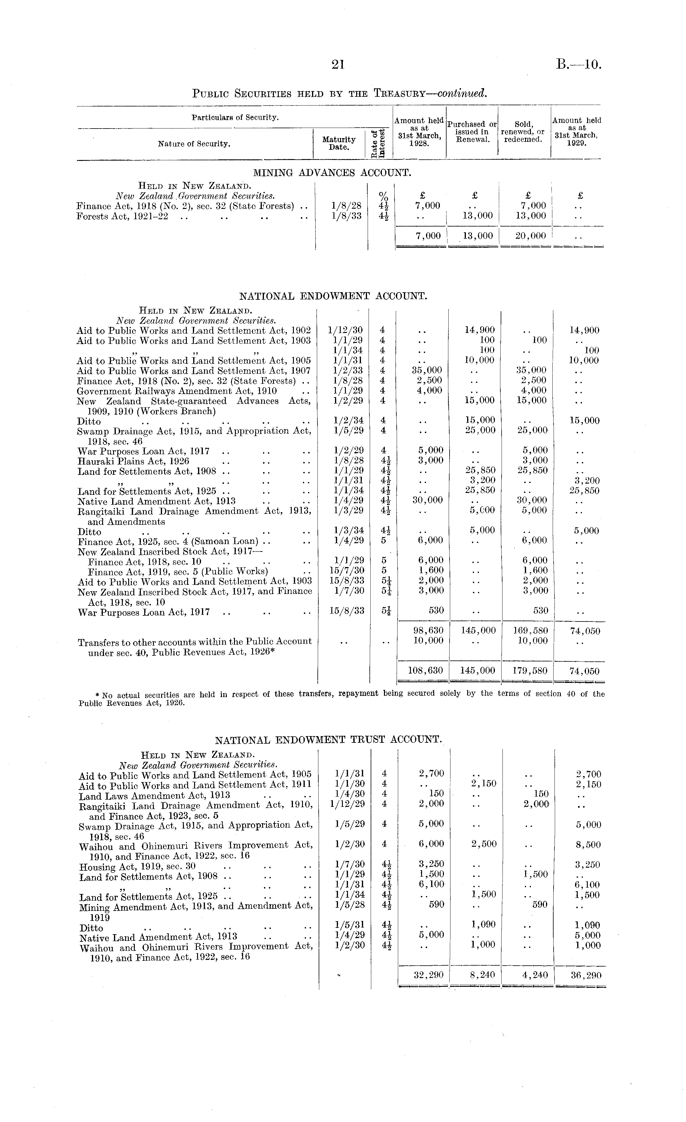 - Particulars of Security. Amount held Purchased or Soldj Amount held ■gf 01 Marcli issued in renewed, or oi<. tM ' ar (.h Nature of Security. M Date. ty fj 1928 ' ' :EeIlewal - redeemed. ig W . MINING ADVANCES ACCOUNT. Held in New Zealand. New Zealand. Government Securities. % £ £ j £ £ Finance Act, 1918 (No. 2), sec. 32 (State Forests) .. 1/8/28 7,000 .. ! 7,000 Forests Act, 1921-22 .. .. .. .. 1/8/33 4J .. j 13,000 13,000 7,000 j 13,000 I 20,000 NATIONAL ENDOWMENT ACCOUNT. Held in New Zealand. New Zealand Government Securities. Aid to Public Worts and Land Settlement Act, 1902 1/12/30 4 .. 14,900 .. 14,900 Aid to Public Works and Land Settlement Act, 1903 1/1/29 4 .. 100 100 1/1/34 4 .. 100 .. 100 Aid to Public Works and Land Settlement Act, 1905 1/1/31 4 .. 10,000 .. 10,000 Aid to Public Works and Land Settlement Act, 1907 1/2/33 4 35,000 .. 35,000 Finance Act, 1918 (No. 2), sec. 32 (State Forests) .. 1/8/28 4 2,500 .. 2,500 Government Railways Amendment Act, 1910 .. 1/1/29 4 4,000 .. 4,000 New Zealand State-guaranteed Advances Acts, 1/2/29 4 .. 15,000 15,000 1909, 1910 (Workers Branch) Ditto .. .. .. .. •• 1/2/34 4 .. 15,000 .. 15,000 Swamp Drainage Act, 1915, and Appropriation Act, 1/5/29 4 .. 25,000 25,000 1918, sec. 46 War Purposes Loan Act, 1917 .. .. •• 1/2/29 4 5,000 .. 5,000 Hauraki Plains Act, 1926 .. .. .. 1/8/28 4J 3,000 .. 3,000 Land for Settlements Act, 1908 .. .. ■■ 1/1/29 4J .. 25,850 25,850 1/1/31 44 .. 3,200 .. 3,200 Land for Settlements Act, 1925 .. .. 1/1/34 4J .. 25,850 .. 25,850 Native Land Amendment Act, 1913 .. .. 1/4/29 4£ 30,000 .. 30,000 Rangitaiki Land Drainage Amendment Act, 1913, 1/3/29 4J .. 5,000 5,000 and Amendments Ditto 1/3/34 4£ .. 5,000 .. 5,000 Finance Act, 1925, sec. 4 (Samoan Loan) .. .. 1/4/29 5 6,000 .. 6,000 New Zealand Inscribed Stock Act, 1917 — Finance Act, 1918, sec. 10 .. ■■ 1/1/29 5 6,000 .. 6,000 Finance Act, 1919, sec. 5 (Public Works) .. 15/7/30 5 1,600 .. 1,600 Aid to Public Works and Land Settlement Act, 1903 15/8/33 5J 2,000 .. 2,000 New Zealand Inscribed Stock Act, 1917, and Finance 1/7/30 5| 3,000 .. 3,000 Act, 1918, sec. 10 War Purposes Loan Act, 1917 .. • • • • 15/8/33 5| 530 .. 530 98,630 145,000 169,580 74,050 Transfers to other accounts within the Public Account .. .. 10,000 .. 10,000 under sec. 40, Public Revenues Act, 1926* 108,630 145,000 179,580 74,050 * No actual securities are held in respect of these transfers, repayment being secured solely by the terms of section 40 of the Public Eevenues Act, 1926. NATIONAL ENDOWMENT TRUST ACCOUNT. Held in New Zealand. New Zealand Government Securities. Aid to Public Works and Land Settlement Act, 1905 1/1/31 4 2,700 .. .. 2,700 Aid to Public Works and Land Settlement Act, 1911 1/1/30 4 .. 2,150 .. 2,150 Land Laws Amendment Act, 1913 .. ■ • 1/4/30 4 150 .. 150 Rangitaiki Land Drainage Amendment Act, 1910, 1/12/29 4 2,000 .. 2,000 and Finance Act, 1923, sec. 5 Swamp Drainage Act, 1915, and Appropriation Act, 1/5/29 4 5,000 .. .. 5,000 1918,sec. 46 Waihou and Ohinemuri Rivers Improvement Act, 1/2/30 4 6,000 2,500 .. 8,500 1910, and Finance Act, 1922, sec. 16 Housing Act, 1919, sec. 30 .. .. 1/7/30 4J 3,250 .. .. 3,250 Land for Settlements Act, 1908 .. .. •• 1/1/29 4£ 1,500 .. 1,500 1/1/31 4J 6,100 .. .. 6,100 Land for Settlements Act, 1925 .. .. •• 1/1/34 4J .. 1,500 .. 1,500 Mining Amendment Act, 1913, and Amendment Act, 1/5/28 4J 590 .. 590 1919 Ditto 1/5/31 4| .. 1,090 .. 1,090 Native Land Amendment Act, 1913 .. •• 1/4/29 4J 5,000 .. .. 5,000 Waihou and Ohinemuri Rivers Improvement Act, 1/2/30 4£ .. 1,000 .. 1,000 1910, and Finance Act, 1922, sec. 16 32,290 8,240 4,240 36,290