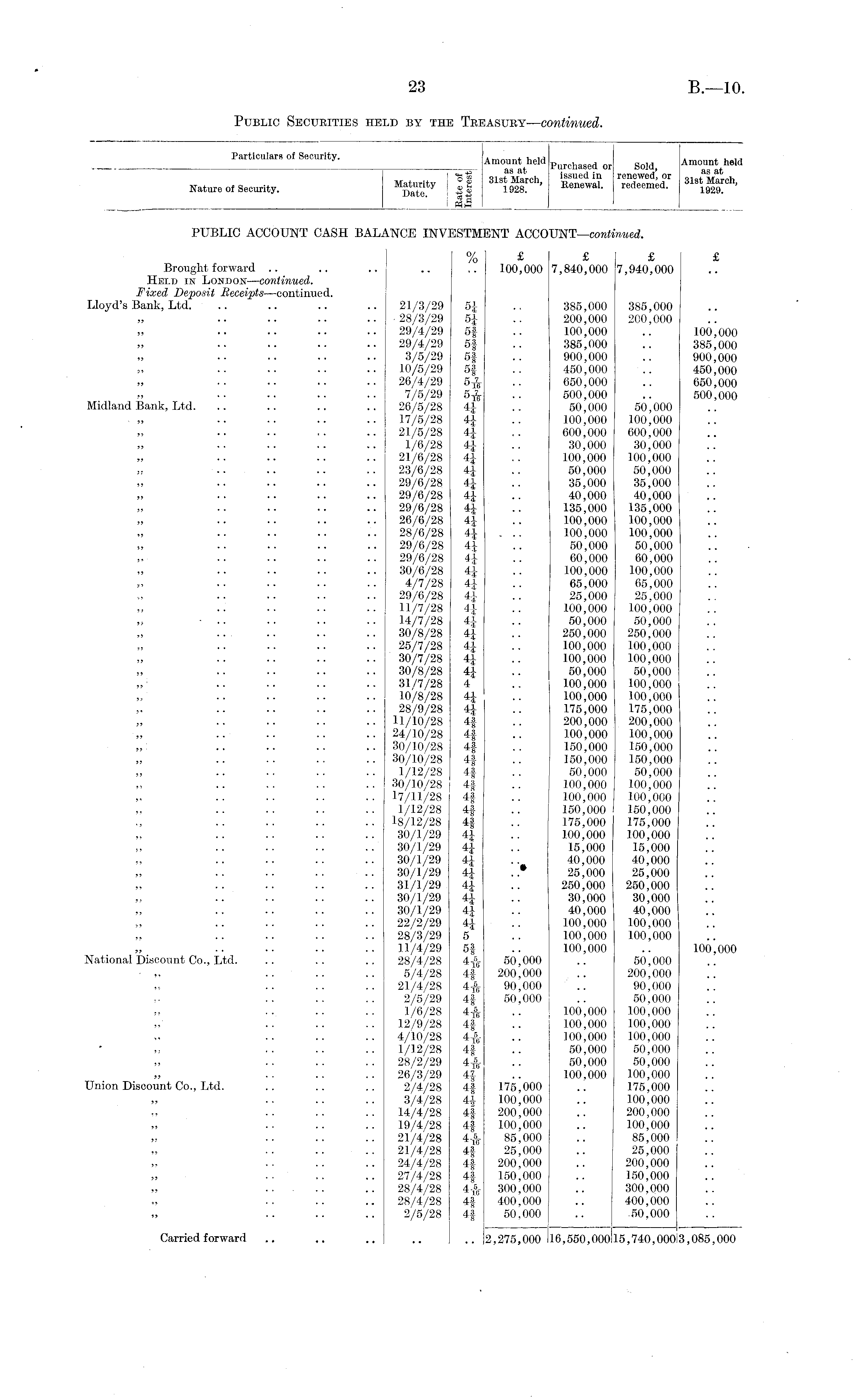 Particulars of Security. a j. l u Amount held Purohase(1 or go]d) Amount held 1 o® issued in renewed, or oi a +tut!™*. Nature ol Security. "Sa™' 47 "I ' Renewal. redeemed. sm 1^ oh ' I II PUBLIC ACCOUNT CASH BALANCE INVESTMENT ACCOUNT —continued. % £ £ £ £ Brought forward .. .. ., .. .. 100,000 7,840,000 7,940,000 Held in London—continued. Fixed Deposit Receipts—continued. Lloyd's Bank, Ltd. .. .. .. .. 21/3/29 5£ .. 385,000 385,000 .. 28/3/29 5J .. 200,000 200,000 29/4/29 5§ .. 100,000 .. 100,000 29/4/29 5f .. 385,000 .. 385,000 3/5/29 5f .. 900,000 .. 900,000 10/5/29 5f .. 450,000 .. 450,000 26/4/29 .. 650,000 .. 650,000 7/5/29 .. 500,000 .. 500,000 Midland Bank, Ltd. .. .. .. .. 26/5/28 4J .. 50,000 50,000 17/5/28 4J .. 100,000 100,000 21/5/28 4£ .. 600,000 600,000 1/6/28 4J .. 30,000 30,000 21/6/28 4| .. 100,000 100,000 23/6/28 4J .. 50,000 50,000 29/6/28 4J .. 35,000 35,000 29/6/28 4J .. 40,000 40,000 29/6/28 4J .. 135,000 135,000 26/6/28 4J .. 100,000 100,000 28/6/28 4\ ... 100,000 100,000 29/6/28 4£ .. 50,000 50,000 29/6/28 4J .. 60,000 60,000 30/6/28 4i .. 100,000 100,000 4/7/28 4£ .. 65,000 65,000 29/6/28 4£ .. 25,000 25,000 11/7/28 4i .. 100,000 100,000 - .. •• .. .. 14/7/28 4J .. 50,000 50,000 .. .. 30/8/28 4\ .. 250,000 250,000 25/7/28 4i .. 100,000 100,000 30/7/28 4| .. 100,000 100,000 30/8/28 4| .. 50,000 50,000 31/7/28 4 .. 100,000 100,000 10/8/28 4J .. 100,000 100,000 28/9/28 41 .. 175,000 175,000 .. 11/10/28 4| .. 200,000 200,000 .. 24/10/28 4§ .. 100,000 100,000 .. .. .. .. 30/10/28 4f .. 150,000 150,000 .. 30/10/28 4f .. 150,000 150,000 1/12/28 4f .. 50,000 50,000 .. 30/10/28 4f .. 100,000 100,000 .. 17/11/28 4J .. 100,000 100,000 1/12/28 4|- .. 150,000 150,000 .. 18/12/28 4| .. 175,000 175,000 30/1/29 4| .. 100,000 100,000 30/1/29 4} .. 15,000 15,000 30/1/29 4£ .. 40,000 40,000 30/1/29 4J . .* 25,000 25,000 31/1/29 4J .. 250,000 250,000 30/1/29 4J .. 30,000 30,000 30/1/29 41 .. 40,000 40,000 22/2/29 4£ .. 100,000 100,000 28/3/29 5 .. 100,000 100,000 U/4/ 29 5f .. 100,000 .. 100,000 National Discount Co., Ltd. .. .. .. 28/4/28 50,000 .. 50,000 • „ .. .. .. 5/4/28 4f 200,000 .. 200,000 21/4/28 90,000 .. 90,000 2/5/29 4f 50,000 .. 50,000 1/6/28 .. 100,000 100,000 12/9/28 4| .. 100,000 100,000 4/10/28 4-& .. 100,000 100,000 1/12/28 4f .. 50,000 50,000 28/2/29 4& .. 50,000 50,000 26/3/29 4J .. 100.000 100,000 Union Discount Co., Ltd. .. .. .. 2/4/28 4§ 175,000 .. 175,000 3/4/28 4* 100,000 .. 100,000 14/4/28 4f 200,000 .. 200,000 19/4/28 4f 100,000 .. 100,000 21/4/28 4-i 85,000 .. 85,000 21/4/28 4| 25,000 .. 25,000 24/4/28 4| 200,000 .. 200,000 27/4/28 4f 150,000 .. 150,000 .. 28/4/28 -I 300,000 .. 300,000 ...... 28/4/28 4| 400.000 .. 400,000 2/5/28 4| 50.000 .. .50,000 Carried forward .. .. .. .. .. 2,275,000 16,550,000 15,740,000i3,085,000