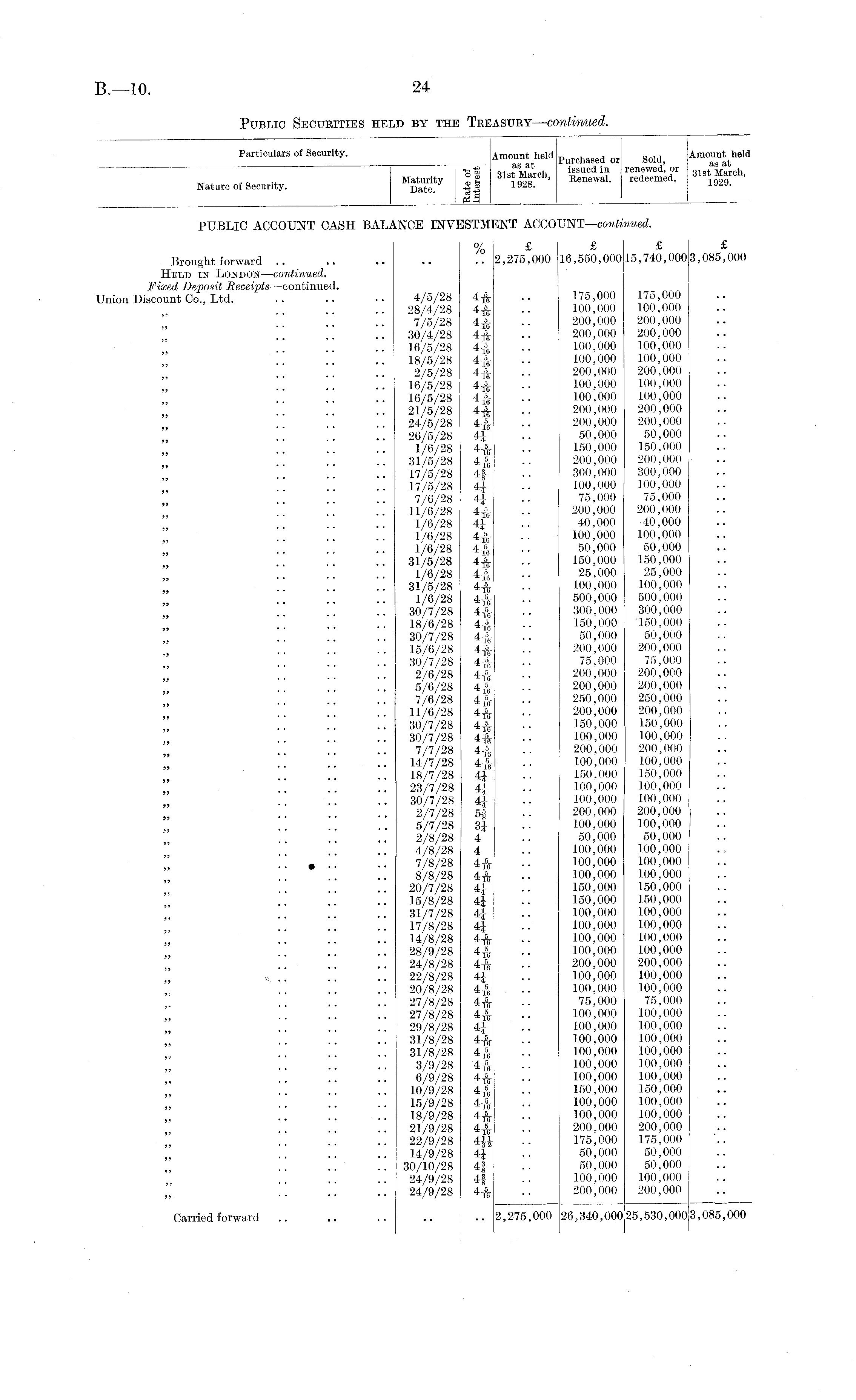 Particulars of Security. Amounted Purchased or Sol a, Amounted — asat issued in renewed, or ... . Maturity lots Renewal. redeemed. 1929 ' Nature of Security. Date PUBLIC ACCOUNT CASH BALANCE INVESTMENT ACCOUNT —continued. % £ £ £ £ Brought forward .. .. 2,275,000 16,550,00015,740,0003,085,000 Held in London—continued. Fixed Deposit Receipts—continued. Union Discount Co., Ltd. .. .. •• 4/5/28 4-4 •• 175,000 175,000 28/4/28 4A .. 100,000 100,000 7/5/28 4A .. 200,000 200,000 " .. .. .. 30/4/28 4A .. 200,000 200,000 16/5/28 44 .. 100,000 100,000 18/5/28 4-4 .. 100,000 100,000 2/5/28 44 .. 200,000 200,000 " .. .. .. 16/5/28 | 4X .. 100,000 100,000 16/5/28 44 .. 100,000 100,000 21/5/28 4A .. 200,000 200,000 24/5/28 44 .. 200,000 200,000 26/5/28 41 .. 50,000 50,000 1/6/28 4-4 .. 150,000 150,000 31/5/28 4A .. 200,000 200,000 17/5/28 4f .. 300,000 300,000 17/5/28 41 .. 100,000 100,000 7/6/28 41 .. 75,000 75,000 11/6/28 44 .. 200,000 200,000 1/6/28 41 .. 40,000 40,000 1/6/28 4A .. 100,000 100,000 ' .. .. .. 1/6/28 4A .. 50,000 50,000 31/5/28 4-4 .. 150,000 150,000 1/6/28 4A .. 25,000 25,000 31/5/28 4-H .. 100,000 100,000 1/6/28 4X .. 500,000 500,000 30/7/28 .. 300,000 300,000 18/6/28 44 .. 150.000 150,000 30/7/28 44 .. 50,000 50,000 15/6/28 4A .. 200,000 200,000 ' .. .. .. 30/7/28 44 .. 75,000 75,000 2/6/28 44 .. 200,000 200,000 " .. .. .. 5/6/28 iS ■■ 200,000 200,000 7/6/28 44 .. 250,000 250,000 11/6/28 44 •• 200,000 200,000 30/7/28 44 .. 150,000 150,000 30/7/28 4-A- .. 100,000 100,000 7/7/28 44 .. 200,000 200,000 .. .. 14/7/28 4-4 .. 100,000 100,000 18/7/28 41 .. 150,000 150,000 " .. .. .. 23/7/28 41 .. 100,000 100,000 .... .. 30/7/28 41 •• 100,000 100,000 2/7/28 64 .. 200,000 200,000 5/7/28 34 .. 100,000 100,000 2/8/28 4 .. 50,000 50,000 4/8/28 4 .. 100,000 100,000 ..... .. 7/8/28 .. 100,000 100,000 8/8/28 .. 100,000 100,000 20/7/28 4J .. 150,000 150,000 15/8/28 41 .. 150,000 150,000 31/7/28 41 .. 100,000 100,000 17/8/28 41 .. 100,000 100,000 14/8/28 .. 100.000 100,000 28/9/28 44 .. 100,000 100,000 24/8/28 44 .. 200,000 200,000 " % .. .. .. 22/8/28 41 .. 100,000 100,000 20/8/28 44 - .. 100,000 100,000 27/8/28 .. 75,000 75,000 27/8/28 4-4 .. 100,000 100,000 " .. .. .. 29/8/28 41 .. 100,000 100,000 31/8/28 44 .. 100,000 100,000 31/8/28 44 .. 100,000 100,000 3/9/28 44 •• 100,000 100,000 6/9/28 4-4 .. 100,000 100,000 ' 10/9/28 44 .. 150,000 150,000 15/9/28 4-4 .. 100,000 100,000 18/9/28 44 .. 100,000 100,000 21/9/28 44 .. 200,000 200,000 " 22/9/28 4Ji .. 175,000 175,000 14/9/28 4|- .. 50,000 50,000 .. 30/10/28 4f .. 50,000 50,000 24/9/28 4| .. 100,000 100,000 24/9/28 44 .. 200,000 200,000 Carried forward .. .. .. .. ..2,275,000 26,340,000 25,530,000 3,085,000