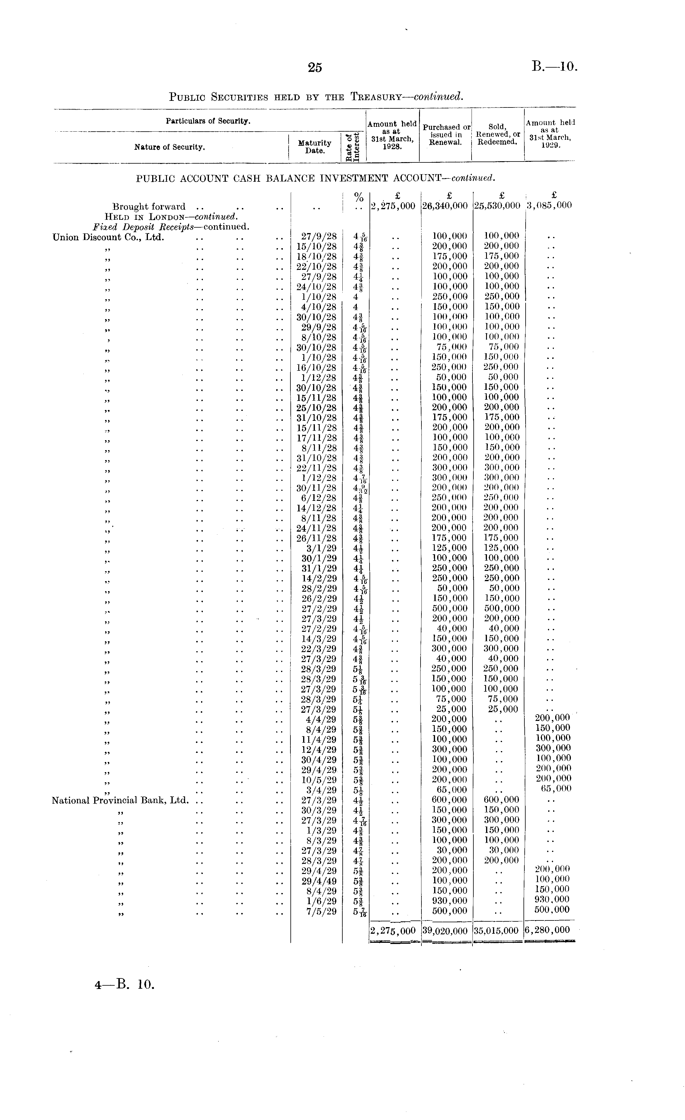 oculars of Security. Amount held purcha9ed or Sold , Amounted I -M-g issued in Renewed, or q 1t . t Maroh Nature o f Security. j H 1929 I Bh PUBLIC ACCOUNT CASH BALANCE INVESTMENT ACCOUNT—continued. % £ £ £ £ Brought forward .. .. .. .. .? 2,275,000 26,340,000 25,630,000 ,3,086,000 Held in London —continued. Fixed Deposit Receipts —continued. Union Discount Co., Ltd. .. .. .. 27/9/28 .. 100,000 100,000 .. 15/10/28 4f .. 200,000 200,000 .. 18/10/28 4f .. 175,000 175,000 .. 22/10/28 4f .. 200,000 200,000 27/9/28 4| .. 100,000 100,000 .. 24/10/28 4? .. 100,000 100,000 1/10/28 4 .. 250,000 250,000 4/10/28 4 .. 150,000 150,000 .. 30/10/28 4f .. 100,000 100,000 29/9/28 4& .. 100,000 100,000 8/10/28 .. 100,000 100,000 .. 30/10/28 4& .. 75,000 75,000 1/10/28 4-fjj .. 150,000 150,000 .. 16/10/28 4& .. 250,000 250,000 1/1.2/28 4f .. 50,000 50,000 .. 30/10/28 4f .. 150,000 150,000 .. 15/11/28 4| .. 100,000 100,000 .. 25/10/28 4f .. 200,000 200,000 .. 31/10/28 4f .. 175,000 175,000 .. 15/11/28 4f .. 200,000 200,000 .. 17/11/28 4| .. 100,000 100,000 8/11/28 4f .. 150,000 150,000 .. 31/10/28 4| .. 200,000 200,000 .. 22/11/28 4f .. 300,000 300,000 1/12/28 4-ft .. 300,000 300,000 .. 30/11/28 4$j .. 200,000 200,000 6/12/28 4| .. 250,000 250,000 .. 14/12/28 4J .. 200,000 200,000 8/11/28 4| .. 200,000 200,000 .. 24/11/28 4$ .. 200,000 200,000 .. 26/11/28 4f .. 175,000 175,000 3/1/29 4| .. 125,000 125,000 30/1/29 4J .. 100,000 100,000 31/1/29 4J .. 250,000 250,000 14/2/29 4& .. 250,000 250,000 28/2/29 4& .. 50,000 50,000 26/2/29 4J .. 150,000 150,000 27/2/29 4£ .. 500,000 500,000 .. 27/3/29 4J .. 200,000 200,000 27/2/29 4-fe .. 40,000 40,000 14/3/29 4-& .. 150,000 150,000 22/3/29 4$ .. 300,000 300,000 27/3/29 4f .. 40,000 40,000 28/3/29 5£ .. 250,000 250,000 28/3/29 5 & .. 150,000 150,000 27/3/29 5-& .. 100,000 100,000 28/3/29 5J .. 75,000 75,000 27/3/29 5i .. 25,000 25,000 4/4/29 5| .. 200,000 .. 200,000 8/4/29 5f .. 150,000 .. 150,000 11/4/29 5§ .. 100,000 .. 100,000 12/4/29 5f .. 300,000 .. 300,000 30/4/29 5J .. 100,000 .. 100,000 29/4/29 5| .. 200,000 .. 200,000 10/5/29 5f .. 200,000 .. 200,000 3/4/29 5} .. 65,000 .. 65,000 National Provincial Bank, Ltd. .. .. .. 27/3/29 4-k .. 600,000 600,000 30/3/29 4£ .. 150,000 150,000 27/3/29 4-& .. 300,000 300,000 1/3/29 4f .. 150,000 150,000 8/3/29 4| .. 100,000 100,000 27/3/29 4} .. 30,000 30,000 28/3/29 4} .. 200,000 200,000 29/4/29 5f .. 200,000 .. 200,000 29/4/49 5f .. 100,000 .. 100,000 8/4/29 5J .. 150,000 .. 150,000 1/6/29 5f .. 930,000 .. 930,000 7/5/29 5& .. 500,000 .. 500,000 2,275,000 39,020,000 35,015,000 6,280,000