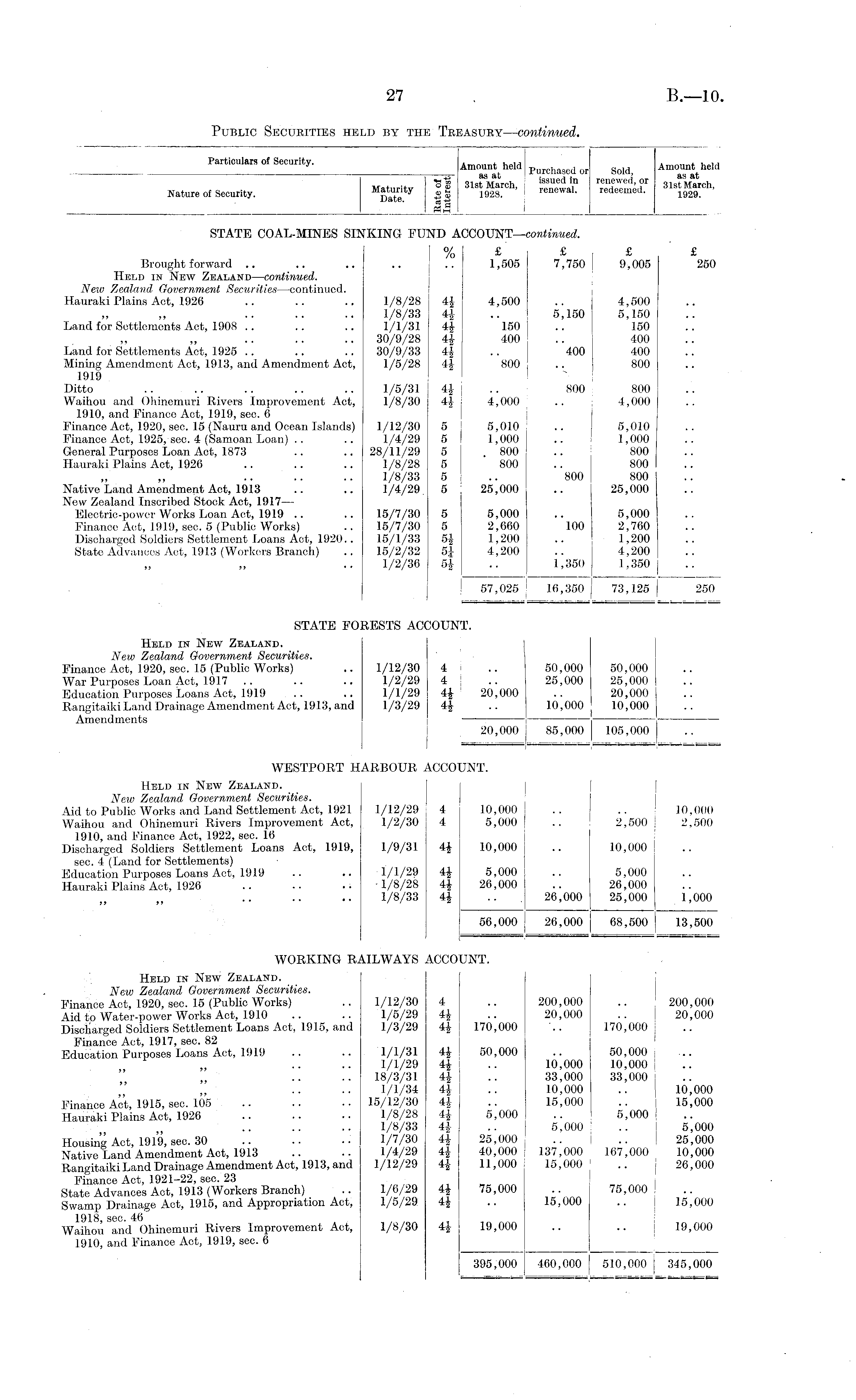 PartiCUlarSOfSeCarity ' Amount held purchasedor Amount hem o"S 31st March issued in renewed, or o ls ? March Nature of Security. g £ 1928. ' renewal. redeemed. 1929 u are. +2 mS I STATE COAL-MINES SINKING FUND ACCOUNT—-continued. % £ £ £ £ Brought forward .. .. .. .. .. 1,505 7,750 9,005 250 Held in New Zealand—continued. New Zealand Government Securities—continued. Hauraki Plains Act, 1926 .. .. .. 1/8/28 44 4,500 .. 4,500 1/8/33 44 .. 5,150 5,150 Land for Settlements Act, 1908 .. .. .. 1/1/31 44 150 .. 150 30/9/28 44 400 .. 400 Land for Settlements Act, 1925 .. .. .. 30/9/33 44 .. 400 400 Mining Amendment Act, 1913, and Amendment Act, 1/5/28 44 800 .. 800 1919 Ditto .. .. .. .. .. 1/5/31 44 .. 800 800 Waihou and Ohinemuri Rivers Improvement Act, 1/8/30 44 4,000 .. 4,000 1910, and Finance Act, 1919, sec. 6 Finance Act, 1920, sec. 15 (Nauru and Ocean Islands) 1/12/30 5 5,010 .. 5,010 Finance Act, 1925, sec. 4 (Samoan Loan) .. .. 1/4/29 5 1,000 .. 1,000 General Purposes Loan Act, 1873 .. .. 28/11/29 5 . 800 .. 800 Hauraki Plains Act, 1926 .. .. .. 1/8/28 5 800 .. 800 1/8/33 5 .. 800 800 Native Land Amendment Act, 1913 .. .. 1/4/29 5 25,000 .. 25,000 New Zealand Inscribed Stock Act, 1917— Electric-power Works Loan Act, 1919 .. .. 15/7/30 5 5,000 .. 5,000 Finance Act, 1919, sec. 5 (Public Works) .. 15/7/30 5 2,660 100 2,760 Discharged Soldiers Settlement Loans Act, 1920.. 15/1/33 54 1,200 .. 1,200 State Advances Act, 1913 (Workers Branch) .. 15/2/32 5| 4,200 .. 4,200 1/2/36 54 .. 1,350 1,350 57,025 16,350 73,125 250 _ STATE FORESTS ACCOUNT. Held in New Zealand. New Zealand Government Securities. Finance Act, 1920, sec. 15 (Public Works) .. 1/12/30 4 .. 50,000 50,000 War Purposes Loan Act, 1917 .. .. .. 1/2/29 4 .. 25,000 25,000 Education Purposes Loans Act, 1919 .. .. 1/1/29 44 20,000 .. 20,000 Rangitaiki Land Drainage Amendment Act, 1913, and 1/3/29 44 .. 10,000 10,000 Amendments — 20,000 85,000 105,000 WESTPORT HARBOUR ACCOUNT. Held in New Zealand. New Zealand Government Securities. Aid to Public Works and Land Settlement Act, 1921 1/12/29 4 10,000 .. .. 10,000 Waihou and Ohinemuri Rivers Improvement Act, 1/2/30 4 5,000 .. 2,500 2,500 1910, and Finance Act, 1922, sec. 16 Discharged Soldiers Settlement Loans Act, 1919, 1/9/31 44 10,000 .. 10,000 sec. 4 (Land for Settlements) Education Purposes Loans Act, 1919 .. .. 1/1/29 44 5,000 .. 5,000 Hauraki Plains Act, 1926 .. ■■ . • 1/8/28 44 26,000 .. 26,000 1/8/33 44 .. 26,000 25,000 1,000 56,000 26,000 68,500 13,500 WORKING RAILWAYS ACCOUNT. Held in New Zealand. New Zealand Government Securities. Finance Act, 1920, sec. 15 (Public Works) .. 1/12/30 4 .. 200,000 .. 200,000 Aid to Water-power Works Act, 1910 .. .. 1/5/29 44 .. 20,000 .. 20,000 Discharged Soldiers Settlement Loans Act, 1915, and 1/3/29 44 170,000 .. 170,000 .. Finance Act, 1917, sec. 82 Education Purposes Loans Act, 1919 .. .. 1/1/31 44 50,000 .. 50,000 1/1/29 44 .. 10,000 10,000 18/3/31 44 .. 33,000 33,000 .... 1/1/34 44 .. 10,000 .. 10,000 Finance Act, 1915, sec. 105 15/12/30 44 .. 15,000 .. 15,000 Hauraki Plains Act, 1926 .. .. •• 1/8/28 4| 5,000 .. 5,000 1/8/33 44 .. 5,000 : .. 5,000 Housing Act, 1919, sec. 30 1/7/30 44 25,000 .. i .. 25,000 Native Land Amendment Act, 1913 .. .. 1/4/29 44 40,000 137,000 167,000 10,000 Rangitaiki Land Drainage Amendment Act, 1913, and 1/12/29 44 11,000 15,000 .. 26,000 Finance Act, 1921-22, sec. 23 State Advances Act, 1913 (Workers Branch) .. 1/6/29 44 75,000 .. 75,000 Swamp Drainage Act, 1915, and Appropriation Act, 1/5/29 44 .. 15,000 .. 15,000 1918, sec. 46 Waihou and Ohinemuri Rivers Improvement Act, 1/8/30 4J 19,000 .. .. 19,000 1910, and Finance Act, 1919, sec. 6 395,000 460,000 510,000 j 345,000