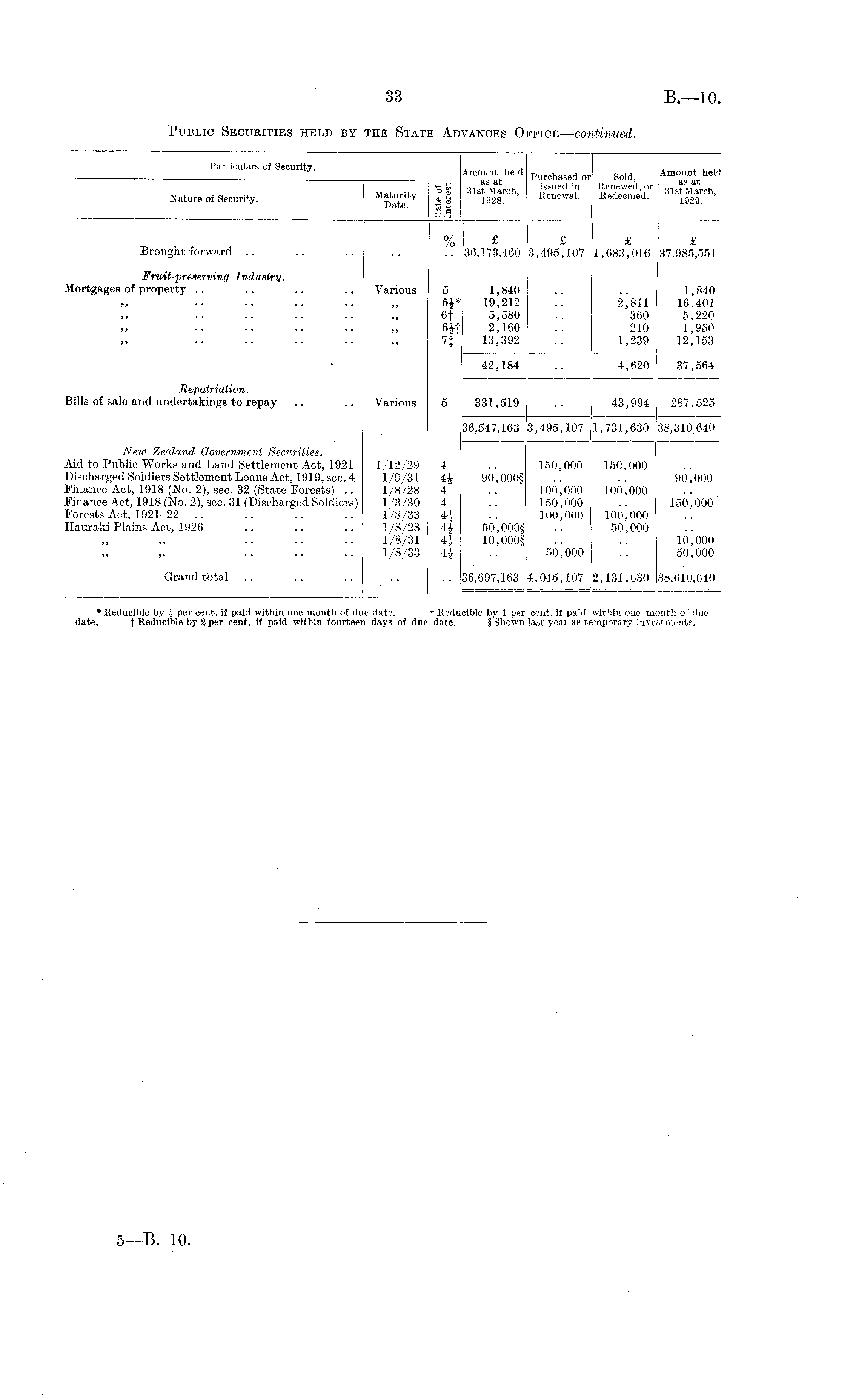 Particulars of Security. , . , ,, . , , ,, — 1 Am0 ™' held Purchased or Sold, Amount held oS 31st March issued in Renewed, or 31 „ tMaroh Nature of Security. Maturity 1998 ' Renewal. Redeemed. 19'>9 Date. 3 —— 1 « M ■ % £ £ £ £ Brought forward .. .. .. .. , /0 36,173,460 3,495,107 1,683,016 37,985,551 Fruit-preserving Industry. Mortgages of property .. .. .. .. Various 5 1,840 .. .. 1,840 5i* 19,212 .. 2,811 16,401 6f 5,580 .. 360 5,220 6|f 2,160 .. 210 1,950 7J 13,392 .. 1,239 12,153 42,184 .. 4,620 37,564 Repatriation. Bills of sale and undertakings to repay .. .. Various 5 331,519 .. 43,994 287,525 36,547,163 3,495,107 1,731,630 38,310.640 New Zealand Government Securities. Aid to Public Works and Land Settlement Act, 1921 1/12/29 4 .. 150,000 150,000 Discharged Soldiers Settlement Loans Act, 1919, sec. 4 1/9/31 4+ 90,000§ .. .. 90,000 Finance Act, 1918 (No. 2), sec. 32 (State Forests) .. 1/8/28 4" .. 100,000 100,000 Finance Act, 1918 (No. 2), sec. 31 (Discharged Soldiers) 1/3/30 4 .. 150,000 .. 150,000 Forests Act, 1921-22 .. .. .. .. 1/8/33 4J .. 100,000 100,000 Hauraki Plains Act, 1926 .. .. .. 1/8/28 4J 50,000§ .. 50,000 1/8/31 4J 10,000§ .. .. 10,000 1/8/33 U .. 50,000 .. 50,000 Grand total .. .. .. .. .. 36,697,163 4,045,107 2,131,630 38,610,640 ! = —— ■ = * Reducible by § per cent, if paid within one month of due date. t Reducible by 1 per cent, if paid within one month of due date. % Reducible by 2 per cent, if paid within fourteen days of due date. § Shown last year as temporary investments.