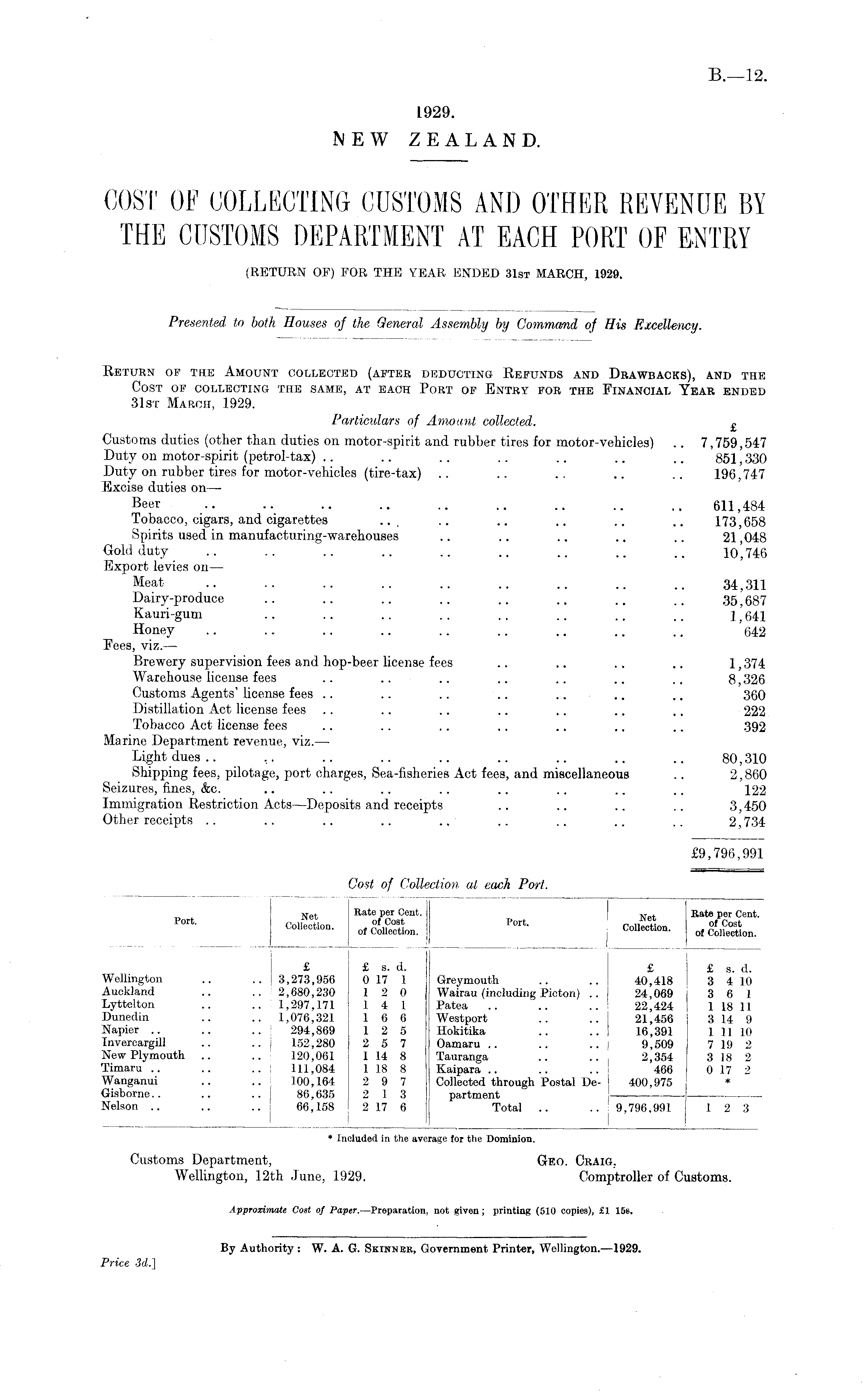 Return of the Amount collected (after deducting Refunds and Drawbacks), and the Cost of collecting the same, at each Port of Entry for the Financial Year ended ■31st March, 1929. Particulars of Amount collected. £ Customs duties (other than duties on motor-spirit and rubber tires for motor-vehicles) .. 7,759,547 Duty on motor-spirit (petrol-tax) .. .. .. .. .. .. .. 851,330 Duty on rubber tires for motor-vehicles (tire-tax) .. .. . . .. .. 196,747 Excise duties on —- Beer .. .. .. .. .. .. .. .. 611,484 Tobacco, cigars, and cigarettes .. .. .. .. .. .. 173,658 Spirits used in manufacturing-warehouses .. .. .. .. .. 21,048 Cold duty .. .. .. .. .. .. .. .. .. 10',746 Export levies on— Meat .. .. .. .. .. .. .. .. .. 34,311 Dairy-produce .. .. .. .. .. .. .. .. 35 ) 687 Kauri-gum .. .. .. .. .. .. .. .. 1 ; 641 Honey .. .. .. .. .. .. .. .. .. 642 Fees, viz.— Brewery supervision fees and hop-beer license fees .. .. .. .. 1,374 Warehouse iicense fees .. .. .. .. .. .. .. 8,326 Customs Agents' license fees .. .. .. .. .. .. .. 360 Distillation Act license fees .. .. .. .. .. .. .. 222 Tobacco Act license fees .. .. .. .. .. .. .. 392 Marine Department revenue, viz.—Light dues.. ~ .. .. .. .. .. .. .. 80,310 Shipping fees, pilotage, port charges, Sea-fisheries Act fees, and miscellaneous .. 2,860 Seizures, fines, &c. .. .. .. .. .. .. .. .. 122 Immigration Restriction Acts—Deposits and receipts .. .. .. .. 3,450 Other receipts .. .. .. .. .. .. .. .. .. 2,734 £9,796,991