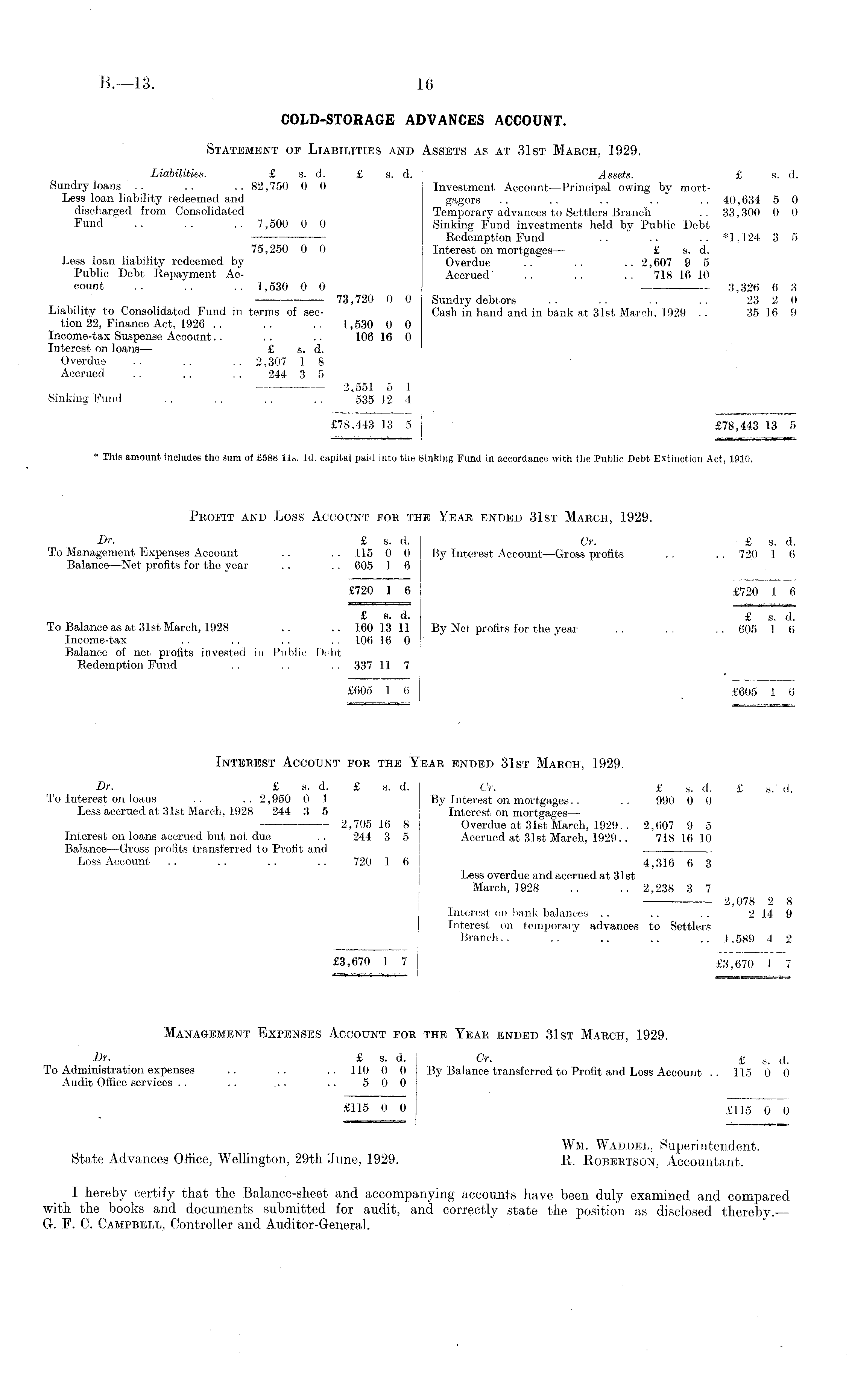 COLD-STORAGE ADVANCES ACCOUNT. Statement of Liabilities and Assets as at 31st March, 1929. Liabilities. £ s. d. £ a. d. Assets. £ s. d. Sundry loans .. .. .. 82,750 0 0 Investment Account—Principal owing by mortLess loan liability redeemed and gagors .. . . .. . . .. 40,634 5 0 discharged from Conaolidated Temporary advances to Settlers Branch .. 33,300 0 0 Fund .. .. .. 7,500 0 0 Sinking Fund investments held by Public Debt Redemption Fund .. .. .. *1,124 3 5 75,250 0 0 ; Interest on mortgages — £ s. d. Less loan liability redeemed by Overdue .. .. .. 2,607 9 5 Public Debt Repayment Ac- Accrued' .. .. .. 718 16 10 count .. .. .. 1,530 0 0 ———— 3,326 6 3 73,720 0 0 Sundry debtors .. .. .. .. 23 2 0 Liability to Consolidated Fund in terma of aec- Caah in hand and in bank at 31st March, 1929 . . 35 16 9 tion 22, Finance Act, 1926 .. .. .. 1,530 0 0 Income-tax Suspense Aocount.. . . . . 106 16 0 Interest on loans— £ s. d. Overdue . . .. . . 2,307 1 8 Accrued ~ , . . , 244 3 5 2,551 5 1 Sinking Fund .. , . . . ~ 535 12 4 £78,443 13 5 £78,443 13 5 * This amount includes the snm of £588 11*. Id. capital paid into the Sinking Fund in accordance with tlie Public Debt Extinction Act, 1910. Profit and Loss Account for the Year ended 31st March, 1929. Dr. £ a. d, I Cr. £ a. d. To Management Expenses Account .. .. 115 0 0 By Interest Account—Gross profits .. .. 720 1 6 Balance —Net profits for the year .. .. 605 1 6 £720 1 6 £720 1 6 £ s. d. £ s. d. To Balance as at 31st March, 1928 .. .. 160 13 11 By Net profits for the year .. .. .. 605 1 6 Income-tax .. . . .. . . 106 16 0 Balance of net profits invested in Public Debt Redemption Fund .. 337 11 7 £605 1 6 £605 1 6 Interest Account for the Year ended 31st March, 1929. Dr. £ s. d. £ s. d. Cr. £ s. d. £ s.' d. To Interest on loans .. .. 2,950 0 1 By Interest on mortgages.. .. 990 0 0 Less accrued at 31st March, 1928 244 3 5 Intereat on mortgagee — 2,705 16 8 Overdue at 31st March, 1929. . 2,607 9 5 Interest on loans accrued but not due .. 244 3 5 Accrued at 31st March, 1929.. 718 16 10 Balance —Gross profits transferred to Profit and Loss Account .. .. .. .. 720 1 6 4,316 6 3 Less overdue and accrued at 31st March, 1928 .. .. 2,238 3 7 2,078 2 8 Interest on bank balances .. .. .. 2 14 9 Interest on temporary advances to Settlers Branch.. .. .. .. .. 1,589 4 2 £3,670 1 7 | £3,670 1 7 Management Expenses Account for the Year ended 31st March, 1929. Dr. £ s. d. Cr. £ s . d. To Administration expenses .. .. .. 110 0 0 By Balance transferred to Profit and Loss Account .. 115 0 0 Audit Office services .. .. ... .. 500 £H5 o o Wm. Waddel, Superintendent. State Advances Office, Wellington, 29th 'June, 1929. R. Robertson, Accountant. I hereby certify that the Balance-sheet and accompanying accounts have been duly examined and compared with the books and documents submitted for audit, and correctly state the position as disclosed thereby. G. F. C. Campbell, Controller and Auditor-General.