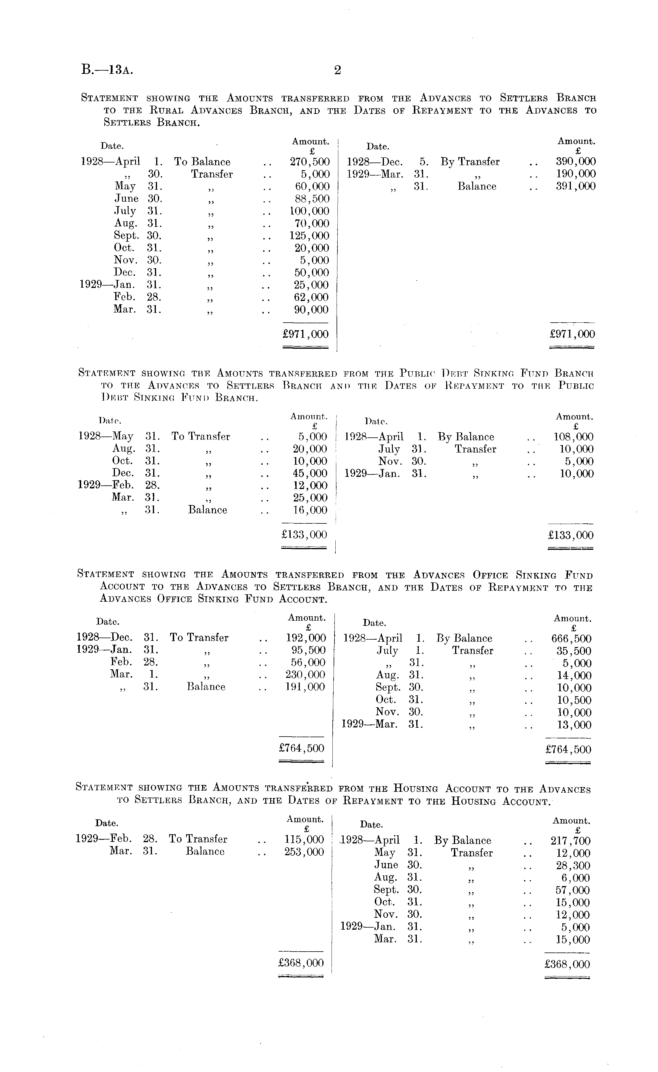 Statement showing the Amounts transferred from the Advances to Settlers Branch to the Rural Advances Branch, and the Dates of Repayment to the Advances to Settlers Branch. Date. • Amo £ unt - ! Date. Amo£Unt--1928—April 1. To Balance .. 270,500 1928 —Dec. 5. By Transfer .. 390,000 ~ 30. Transfer .. 5,000 1929—Mar. 31. ~ .. 190,000 May 31. „ .. 60,000 „ 31. Balance .. 391,000 June 30. ~ .. 88,500 July 31. „ .. 100,000 Aug. 31. „ .. 70,000 Sept. 30. „ .. 125,000 Oct. 31. „ .. 20,000 Nov. 30. ~ .. 5,000 Dec. 31. „ .. 50,000 1929—Jan. 31. „ .. 25,000 Feb. 28. „ .. 62,000 Mar. 31. „ .. 90,000 £971,000 £971,000 Statement showing the Amounts transferred from the Public Debt Sinking Fund Branch to the Advances to Settlers Branch and the Dates of Repayment to the Public Debt Sinking Fund Branch. Date. Amount. Date Amount. 1928—May 31. To Transfer .. 5,000 1928—April 1. By Balance .. 108,000 Aug. 31. „ .. 20,000 July 31. 'Transfer .. 10,000 Oct. 31. „ .. 10,000 Nov. 30. „ .. 5,000 Dec. 31. „ .. 45,000 1929—Jan. 31. „ .. 10,000 1929—Feb. 28. „ .. 12,000 Mar. 31. „ .. 25,000 ~ 31. Balance .. 16,000 £133,000 £133,000 Statement showing the Amounts transferred from the Advances Office Sinking Fund Account to the Advances to Settlers Branch, and the Dates of Repayment to the Advances Office Sinking Fund Account. Date. Amount. Date Amount. 1928—Dec. 31. To Transfer .. 192,000 1928—April 1. By Balance .. 666,500 1929 —Jan. 31. ~ .. 95,500 July 1- Transfer .. 35,500 Feb. 28. „ .. 56,000 „ 31. „ .. 5,000 Mar. 1. „ .. 230,000 Aug. 31. „ .. 14,000 ~ 31. Balance .. 191,000 Sept. 30. ~ .. 10,000 Oct. 31. „ .. 10,500 Nov. 30. „ .. 10,000 1929—Mar. 31. „ .. 13,000 £764,500 £764,500 Statement showing the Amounts transferred from the Housing Account to the Advances to Settlers Branch, and the Dates of Repayment to the Housing Account. Date. Amount. Datg Amount. 1929—Feb. 28. To Transfer .. 115,000 .1928—April 1. By Balance .. 217,700 Mar. 31. Balance .. 253,000 May 31. Transfer .. 12,000 June 30. „ .. 28,300 Aug. 31. „ .. 6,000 Sept. 30. „ .. 57,000 Oct, 31. „ .. 15,000 Nov. 30. „ .. 12,000 1929—Jan. 31. „ .. 5,000 Mar. 31. „ .. 15,000 £368,000 £368,000