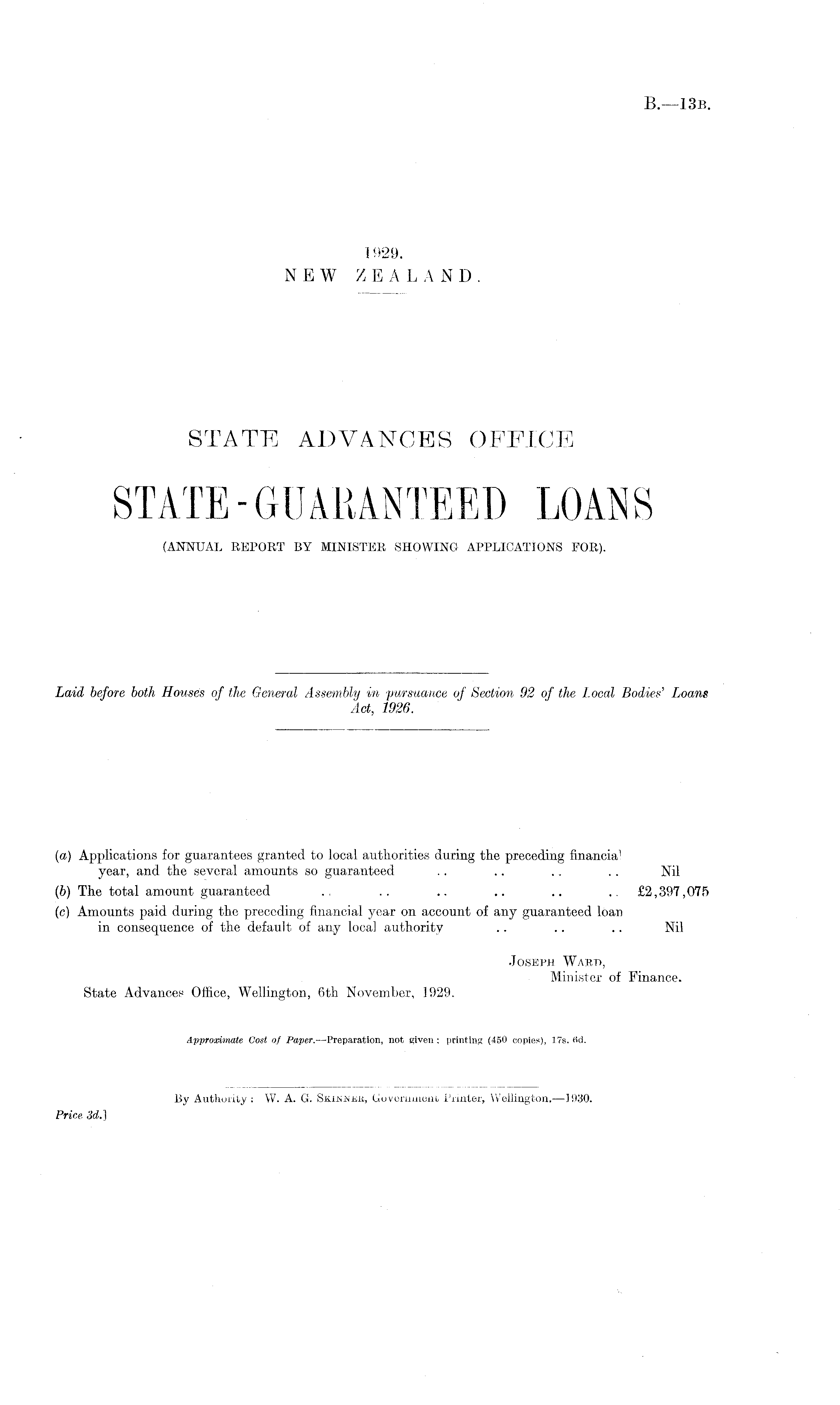 (а) Applications for guarantees granted to local authorities during the preceding financia 1 year, and the several amounts so guaranteed .. .. .. .. Nil (б) The total amount guaranteed .. .. .. .. .. .. £2,397,075 (c) Amounts paid during the preceding financial year on account of any guaranteed loan in consequence of the default of any local authority .. .. .. Nil Joseph Ward, Minister of Finance. State Advances Office, Wellington, 6th November, 1929.