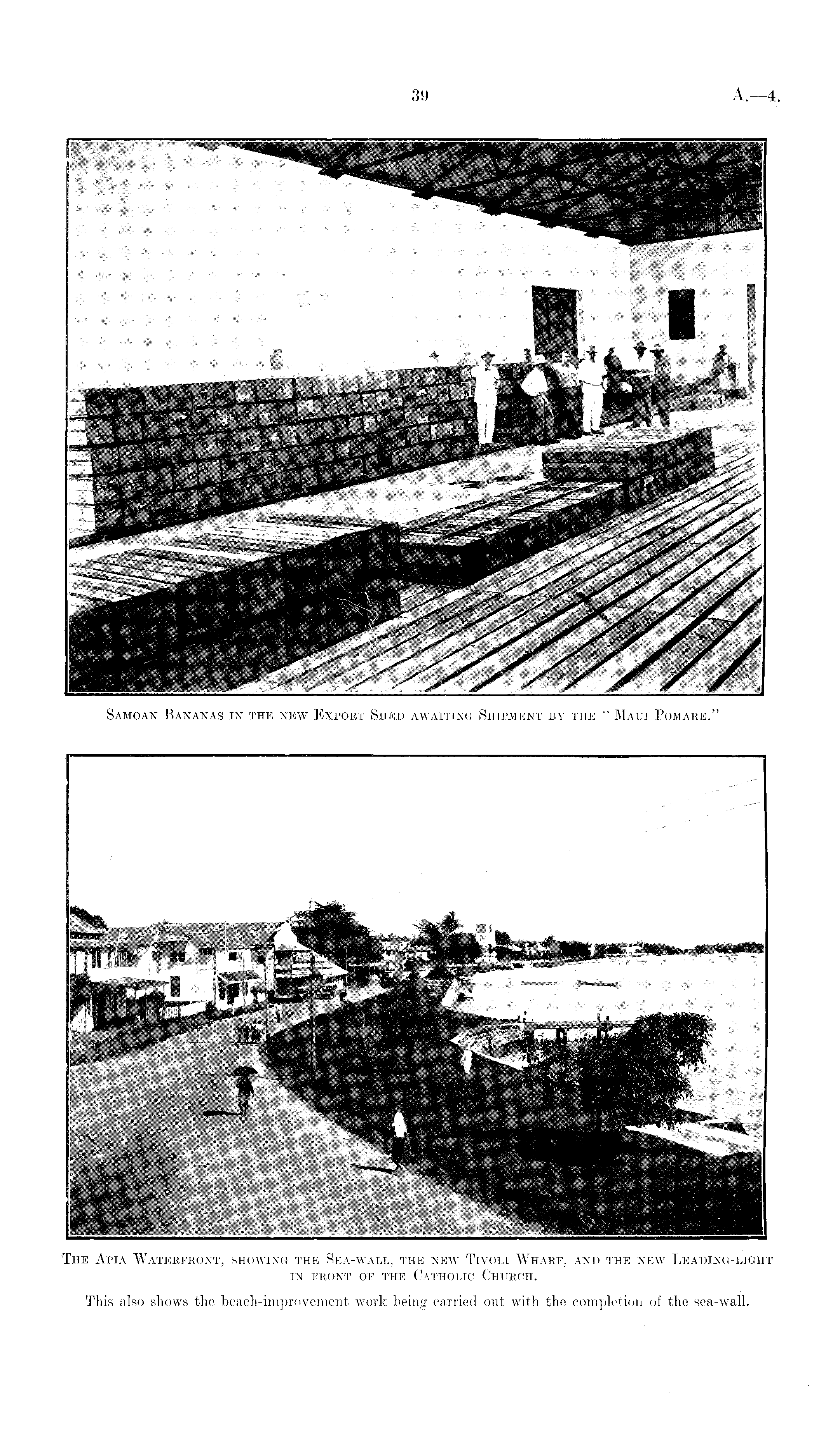 The Apia Waterfront, showing the Sea-wall, the new Tivoli Wharf, and the new Leading-light in front of the Catholic Church.